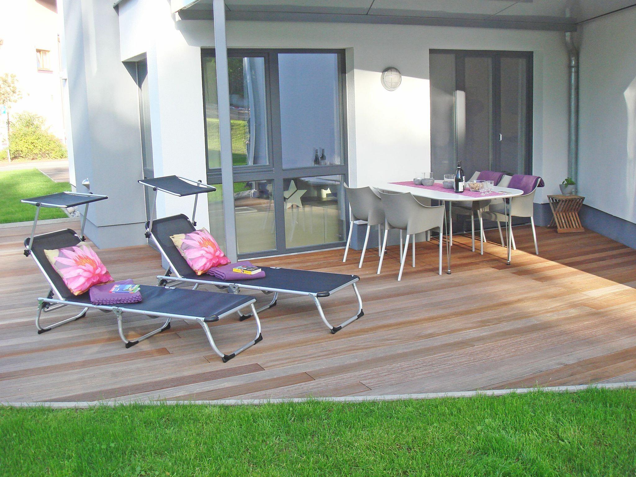 Auch auf der teilweise überdachten Terrasse stehen ein großer Tisch mit Stühlen und zwei Liegen bereit, um in der Abendsonne zu entspannen. Auf dem gärtnerisch großzügig angelegten Grundstück können Sie zwei Grillplätze nutzen.