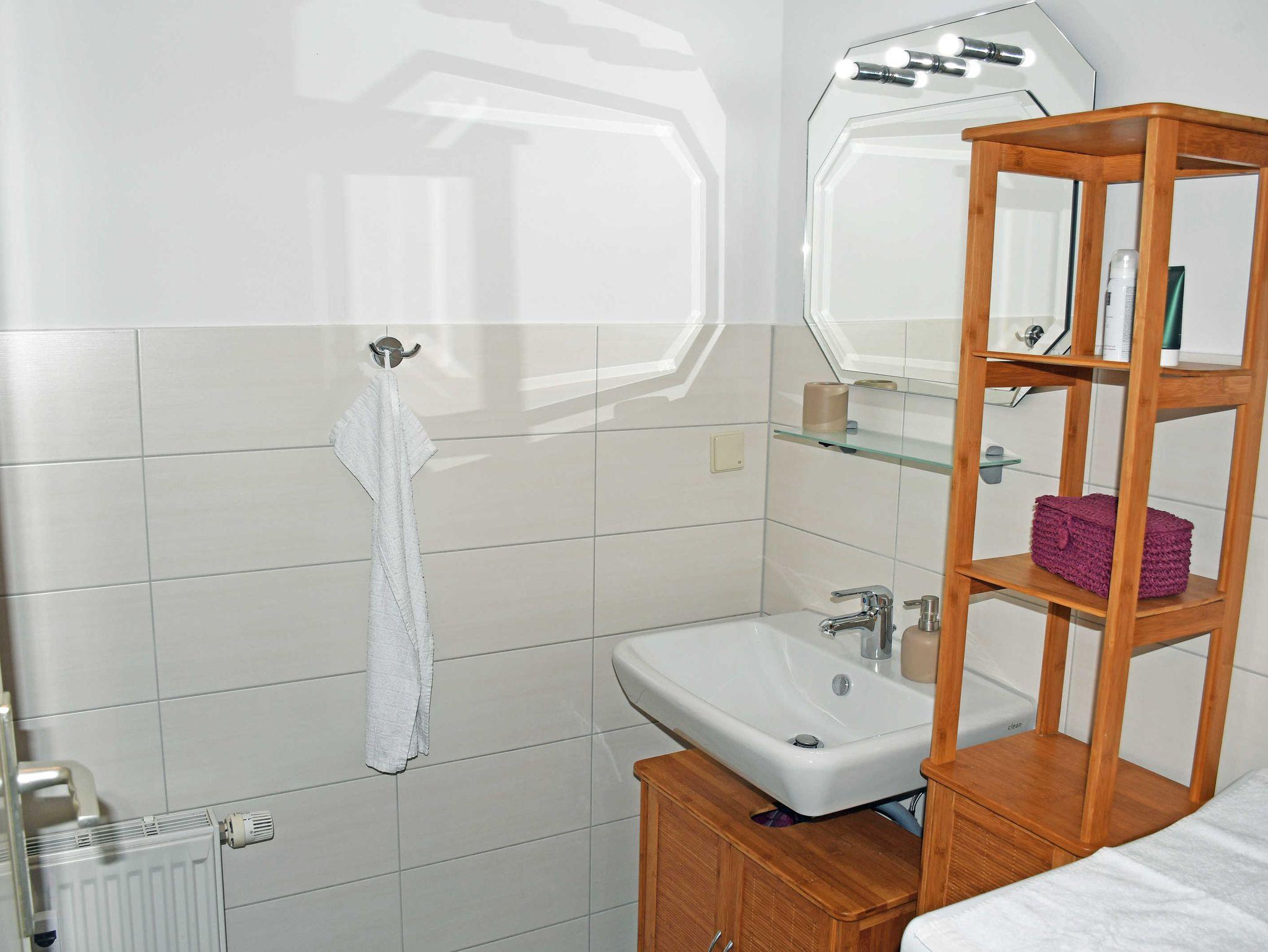 Das moderne Bad ist mit Dusche, WC, Handtuchtrockner und Waschbecken ausgestattet.