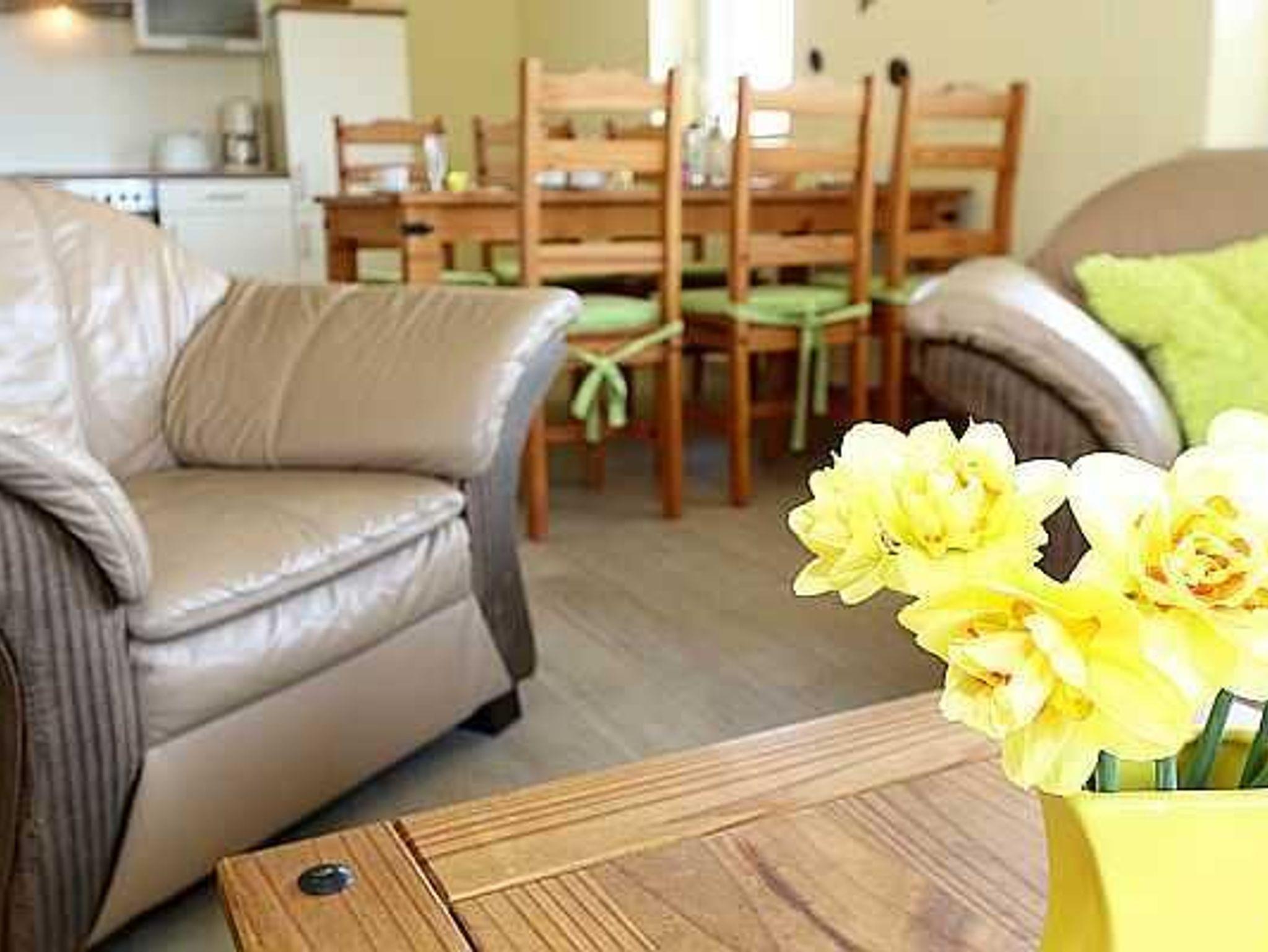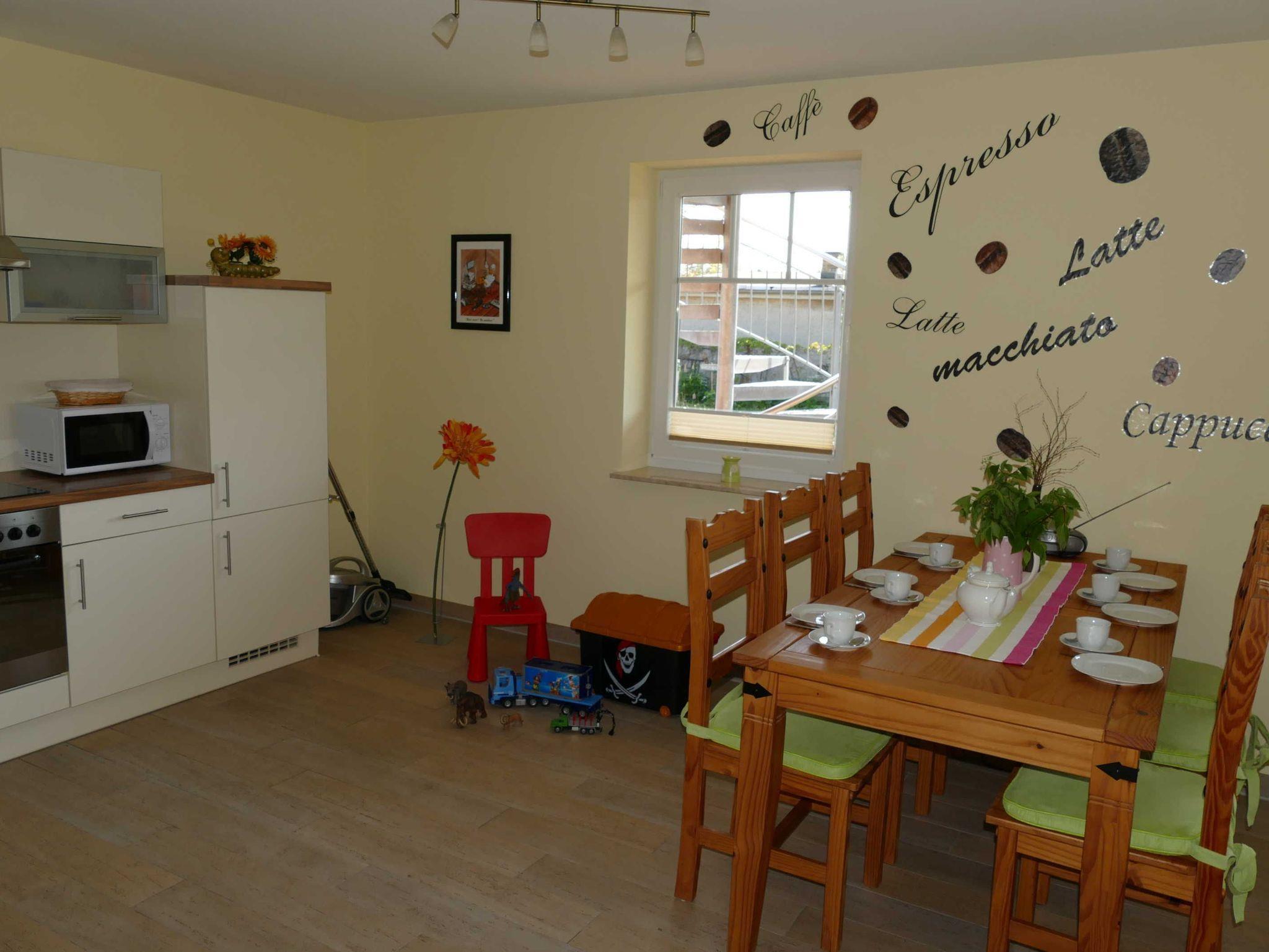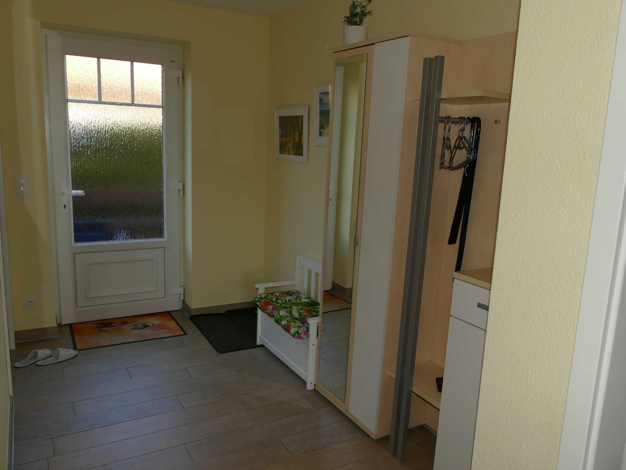 Empfangen werden Sie im geräumigen hellen Flur, der für Sie eine Garderobe sowie eine kleines Bänkchen, die Ihnen als Sitzgelegenheit dienen kann, bereit hält. Von dort gelangen Sie in die Schlafräume, in den Wohn- und Essbereich sowie in das Bad. Der Wohn- und Essbereich der Ferienwohnung zeigt sich, mit einem Kamin (Holz inklusive/kostenlos), einer gemütlichen Sitzgruppe sowie einem Esstisch für 6 Personen und lädt zum Verweilen ein. Der Fernseher mit DVD-Player, Radio, W-LAN (kostenlos) sowie Bücher und Spiele sorgen für exklusiven Wohnkomfort und gemütliche Abende.