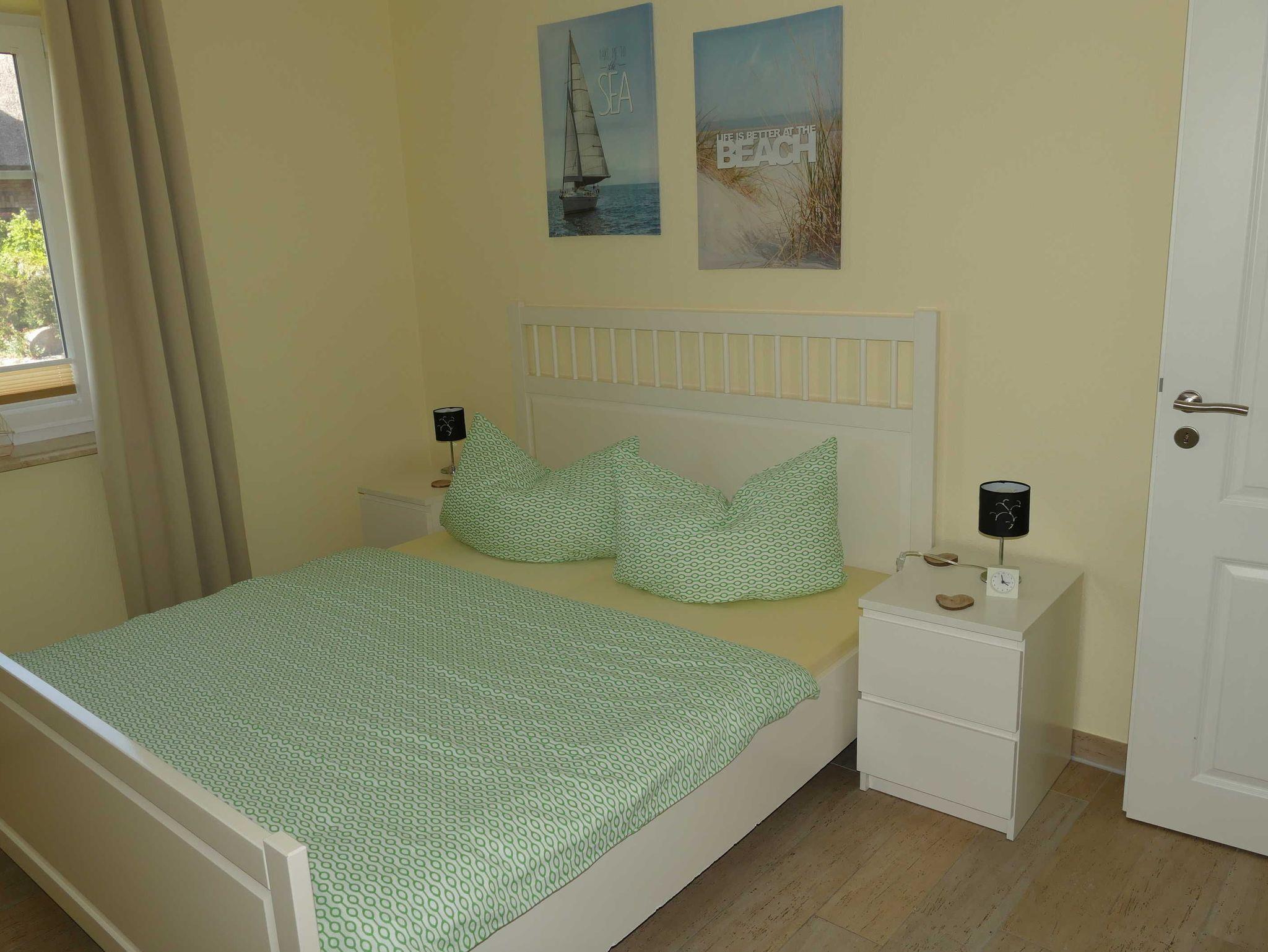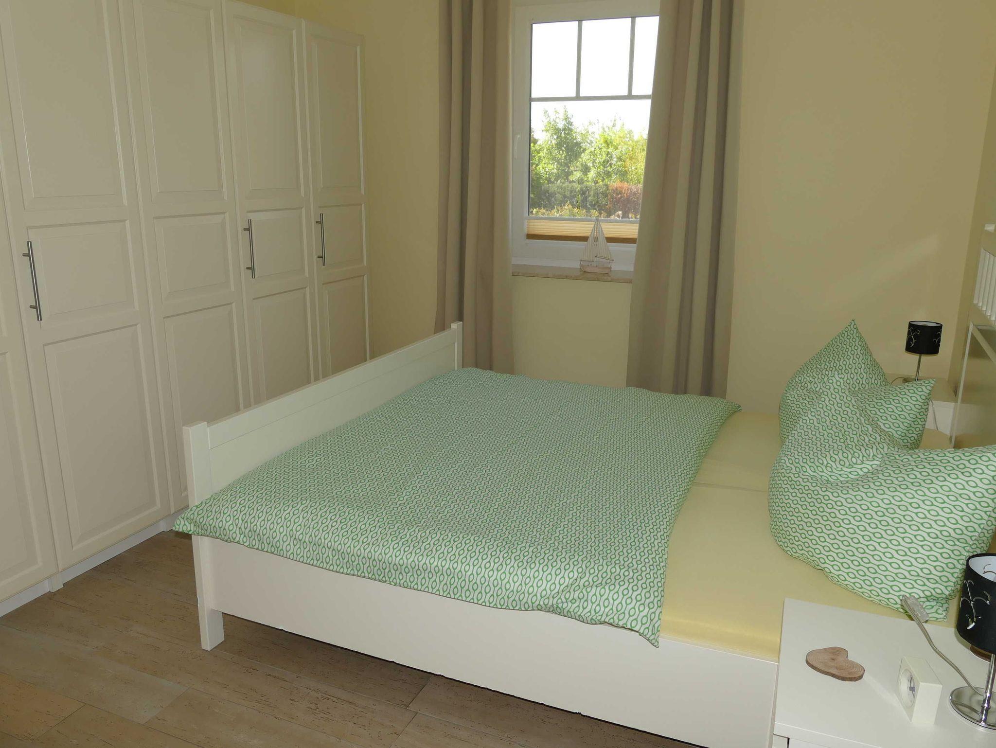 Im 1. Schlafzimmer sehen Sie ein Doppelbett mit verstellbaren Lattenrosten (1 x 1,80 m x 2,00 m und 1 x 1,80 m x 2,00 m), Nachtischanlagen, einem sehr großen Kleiderschrank sowie einem Stuhl, der zur Ablage Ihrer Kleidungsstücke dient. Ein Kinderbettchen findet bequem hier seinen Platz. Die gemütlichen und wohnlichen Verdunklungsvorhänge schützen Sie vor der Helligkeit des Morgens und das Fliegengitter hält Insekten fern.