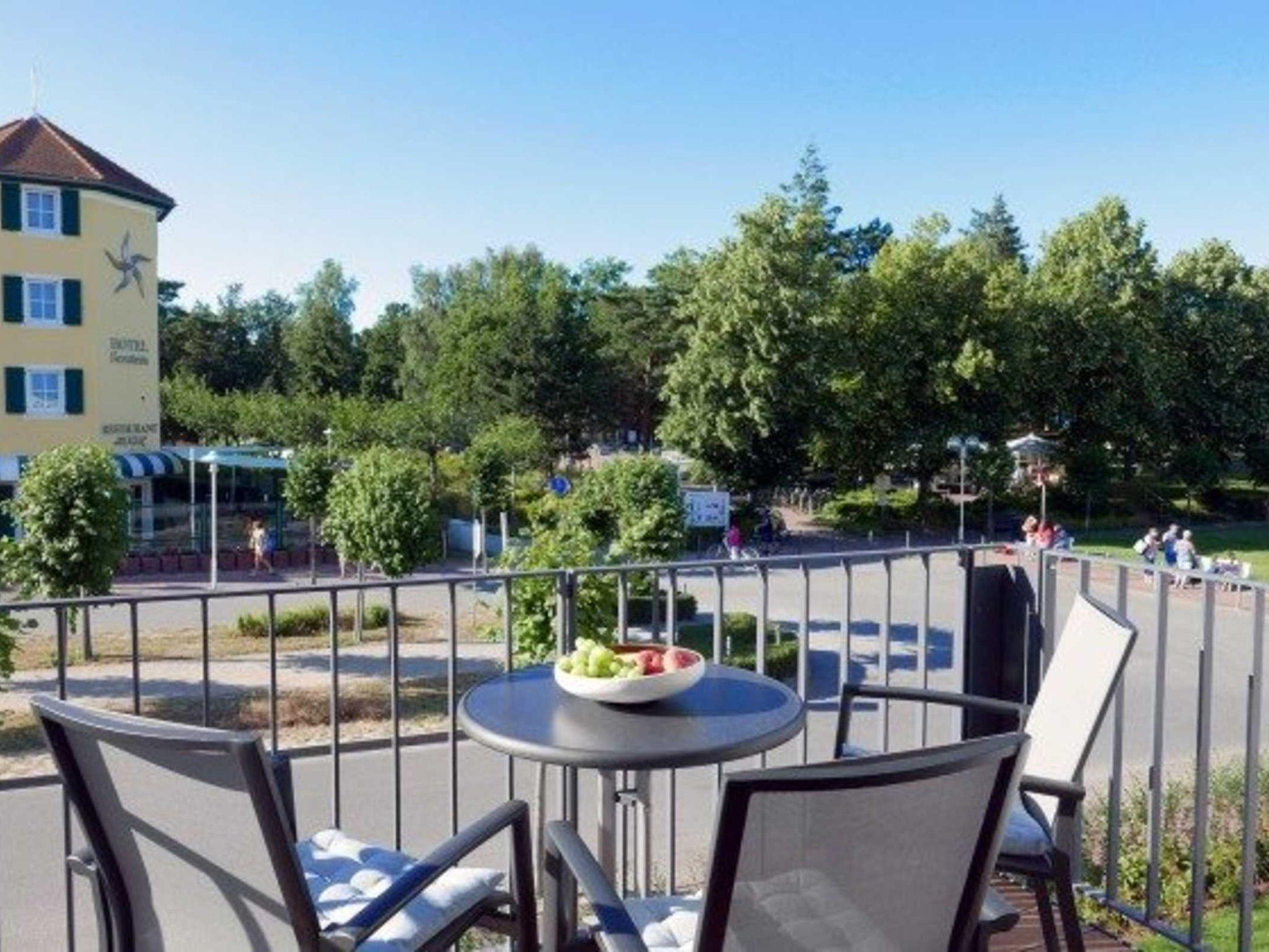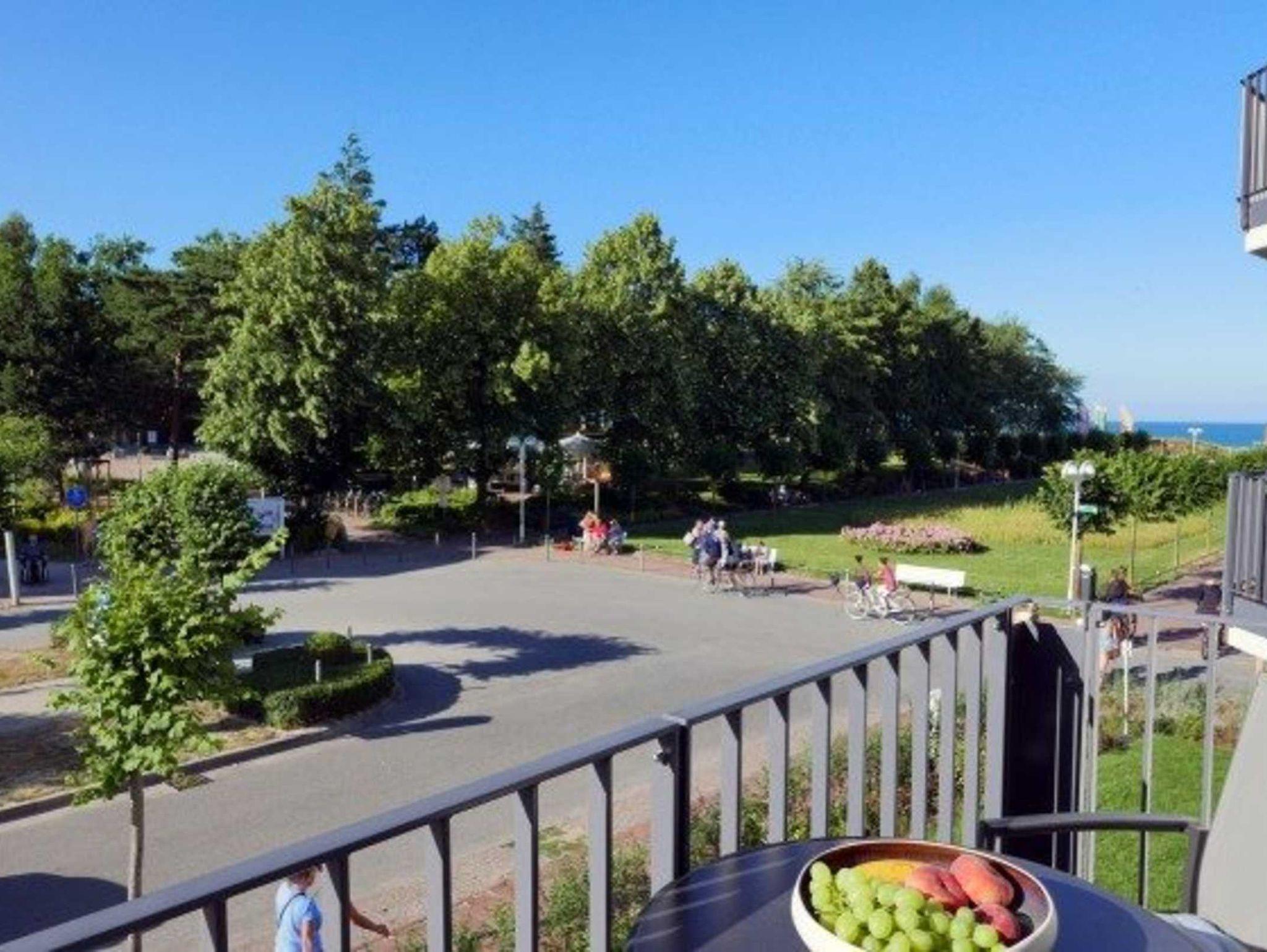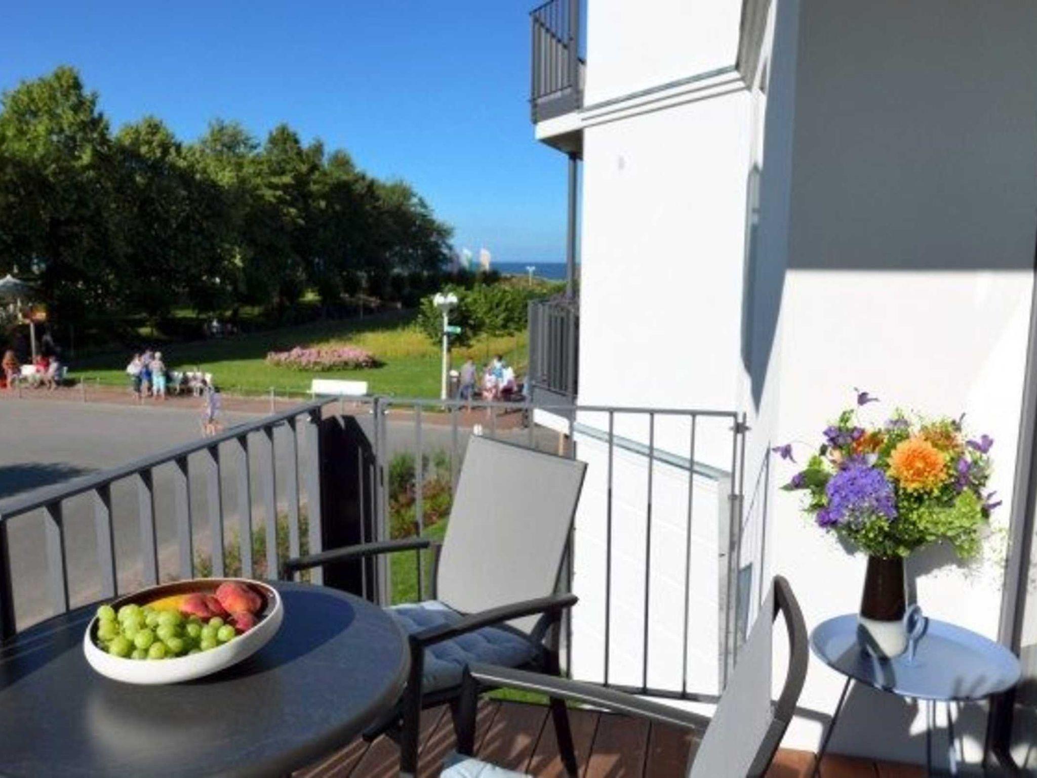 Betritt man den Balkon erscheint auf der einen Seite ein wunderschöner idyllischer Blick auf das Meer und den zu jeder Jahreszeit attraktiven Kurpark.