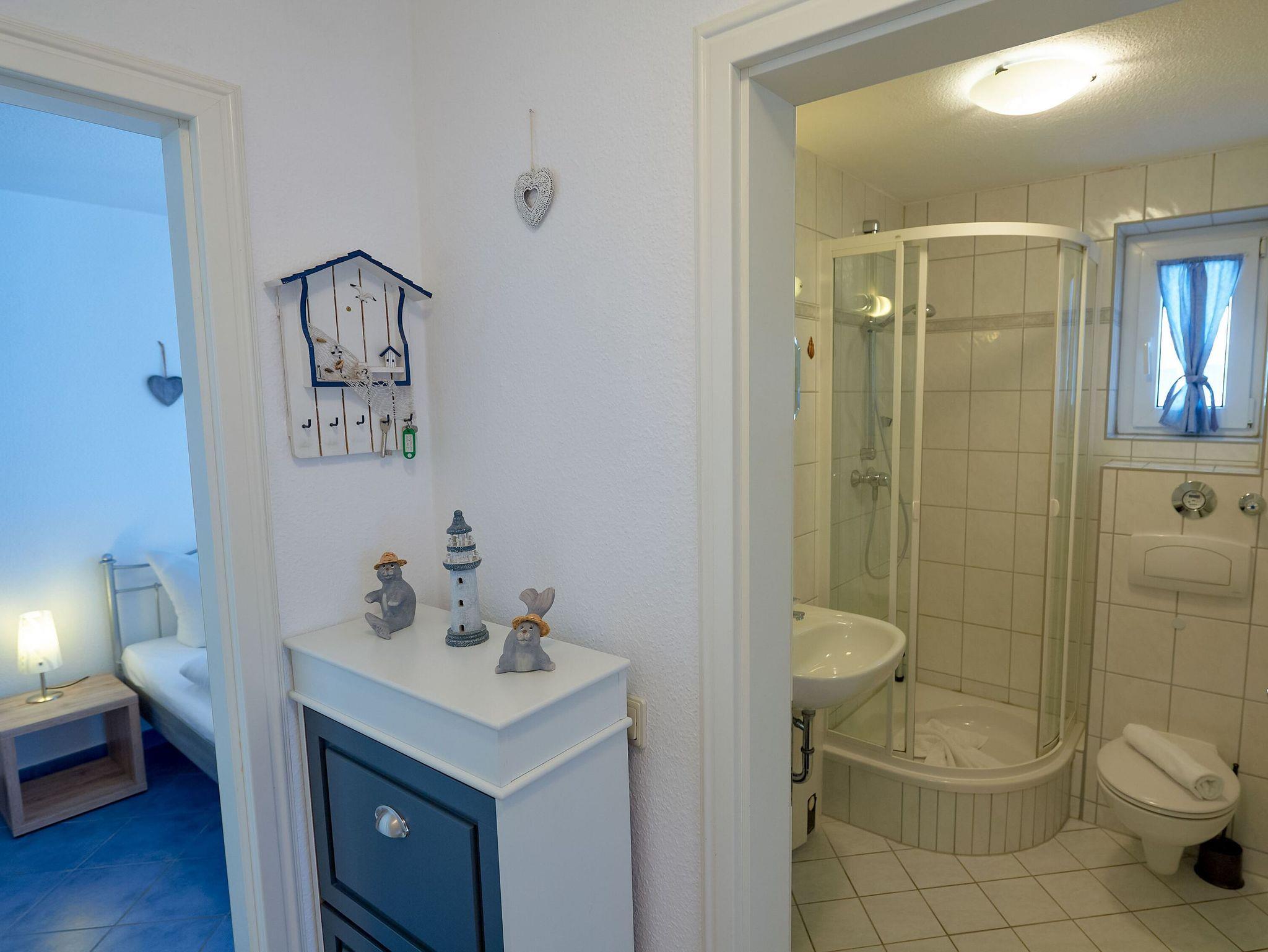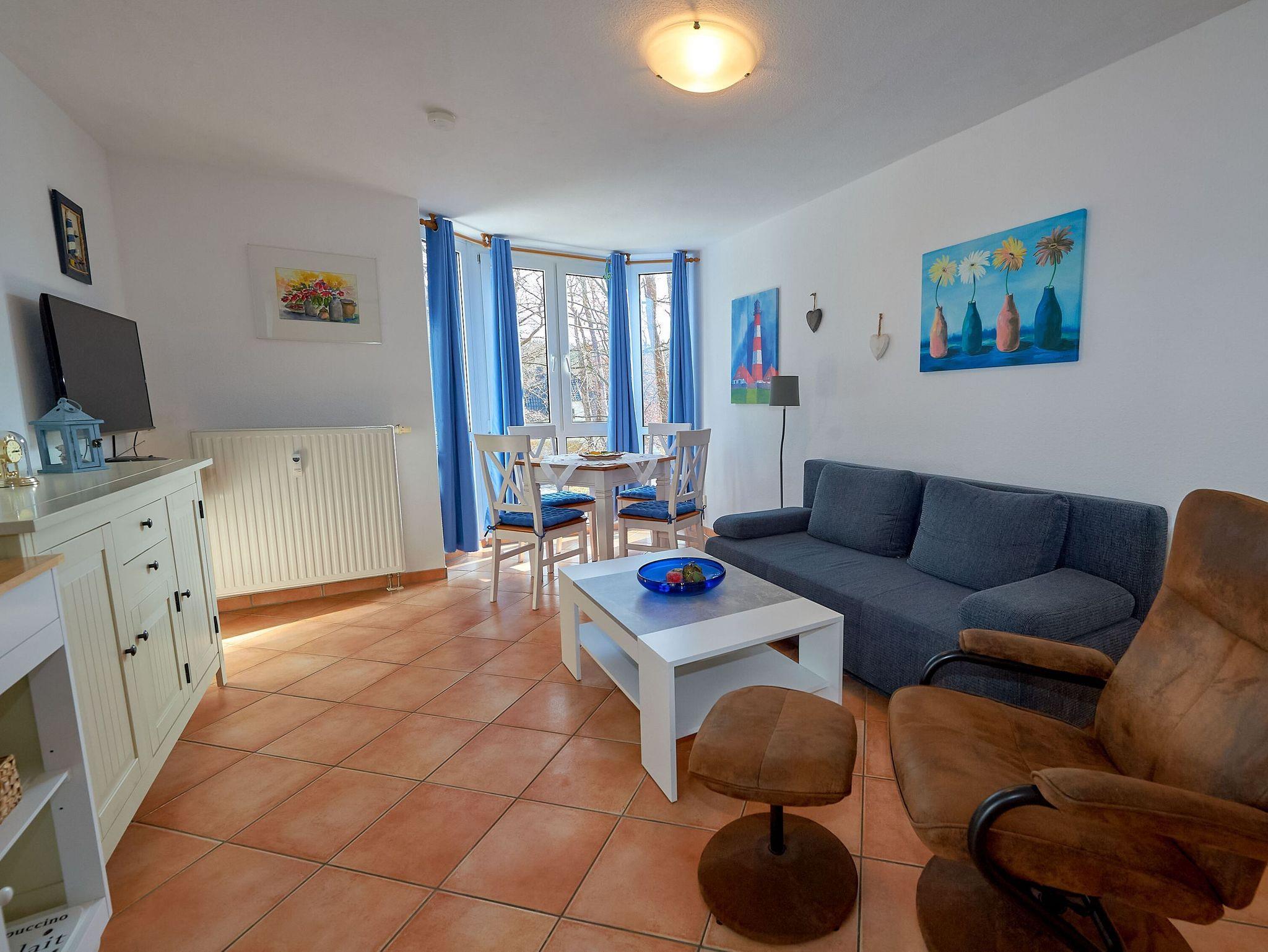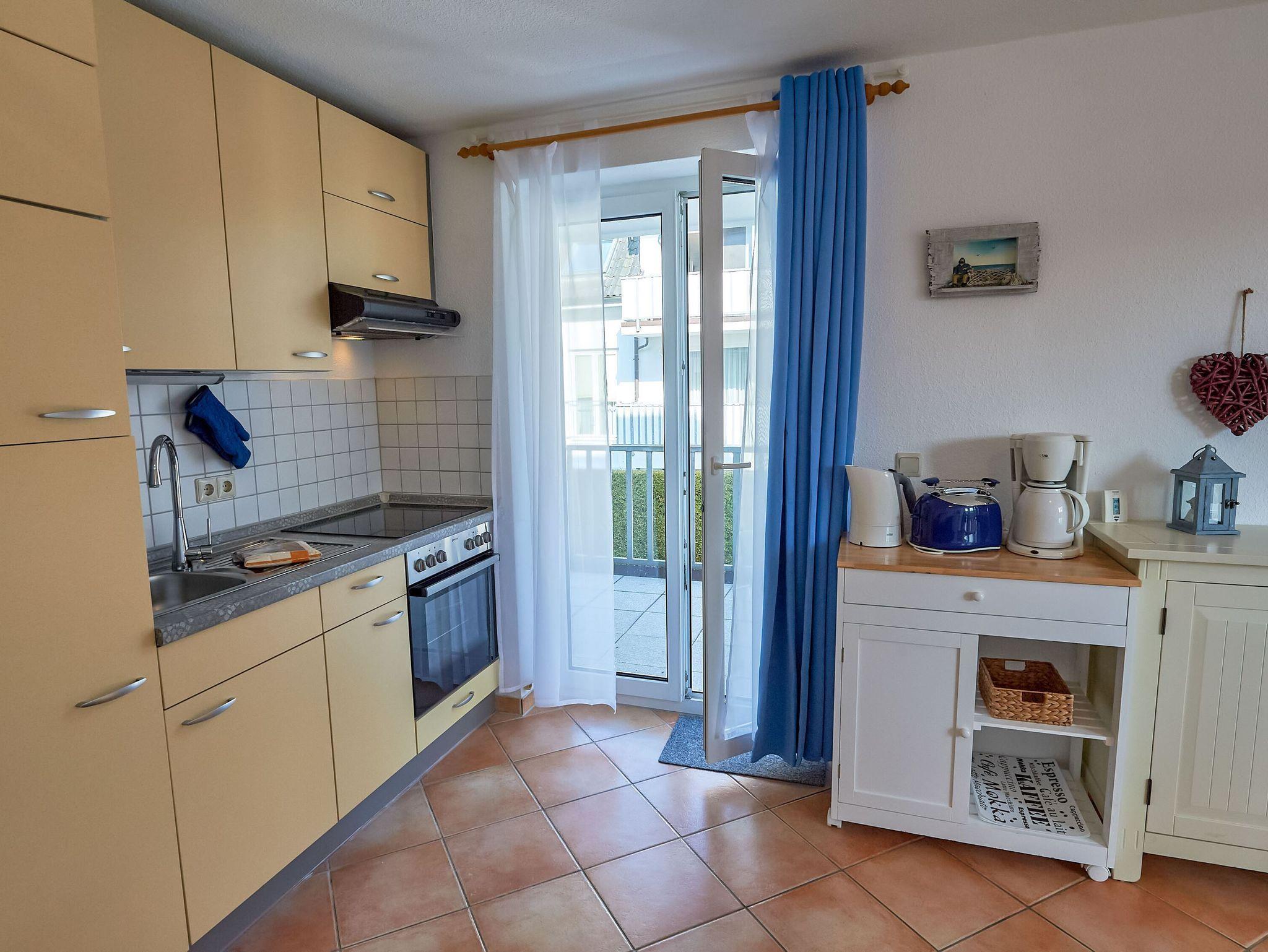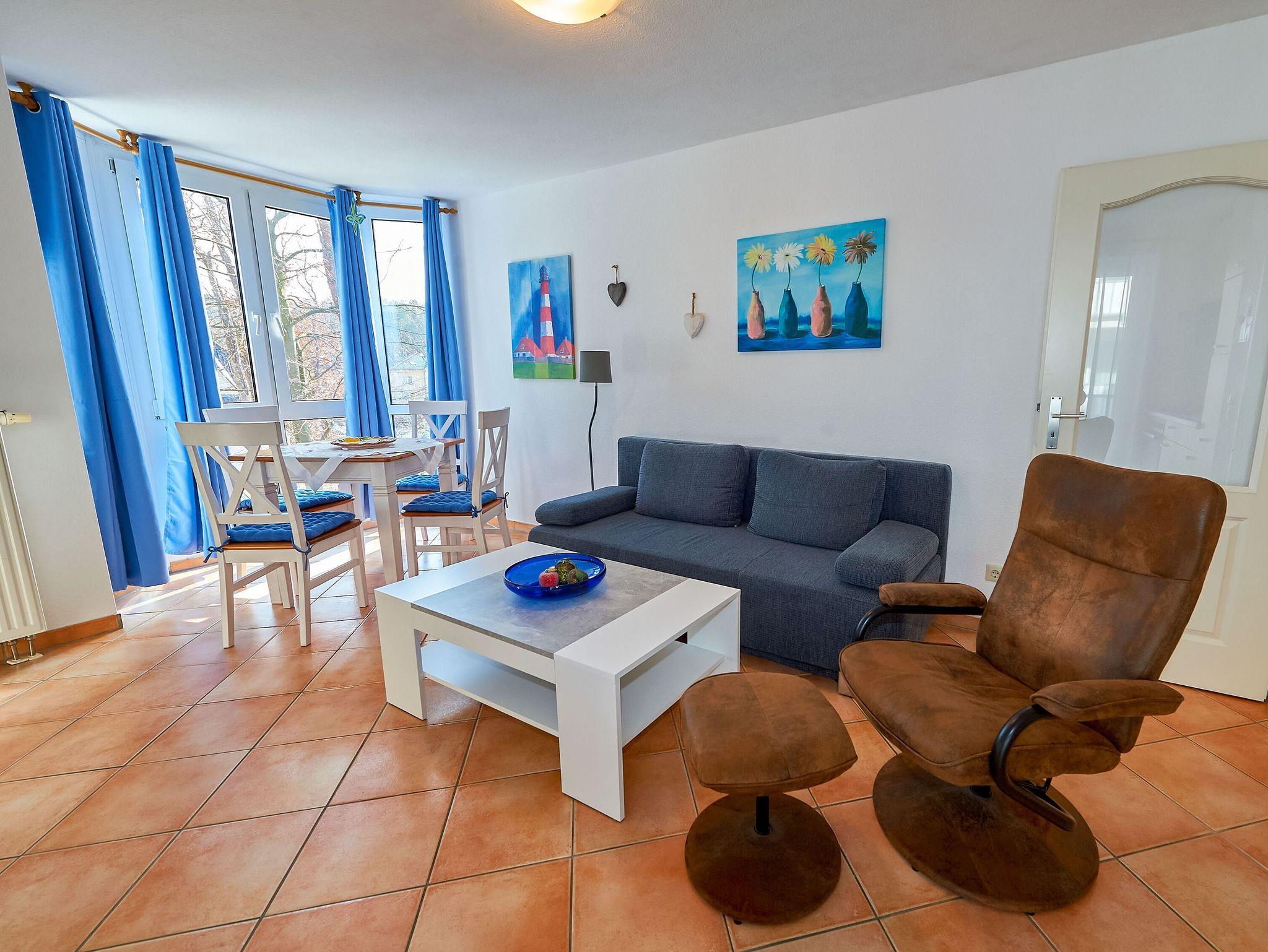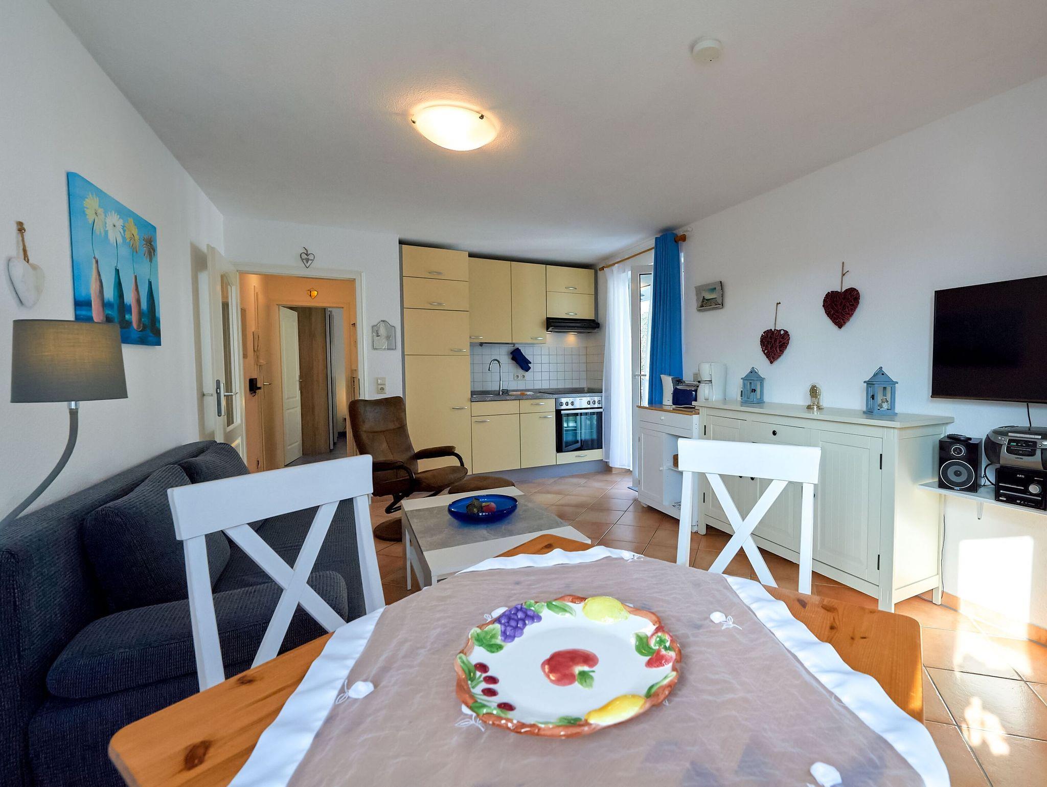Das überaus geräumige Wohn-/Esszimmer ist mit einer gemütlichen Couch, einem Relaxsessel, einem Flachbild-TV, Internetradio, einer Essecke und einer Küchenzeile eingerichtet. Hier stehen Ihnen u.a. ein Ceranherd inkl. Backofen, ein Kühlschrank mit Gefrierfach, eine Filterkaffee- und eine Tassimo-Kaffeemaschine, ein Wasserkocher, ein Toaster und diverses weiteres Kleininventar zur Verfügung. Einen Bäcker für die frischen Brötchen am Morgen gibt es direkt im Haus, auch zum nächsten Einkaufsmarkt ist es nicht weit.