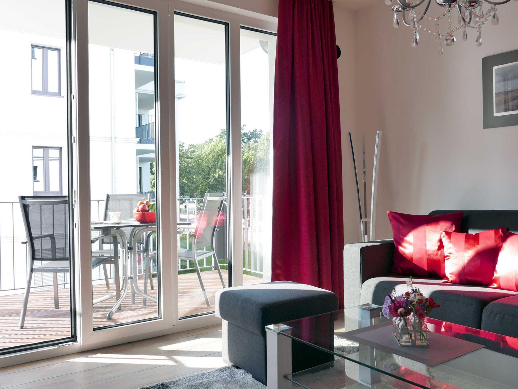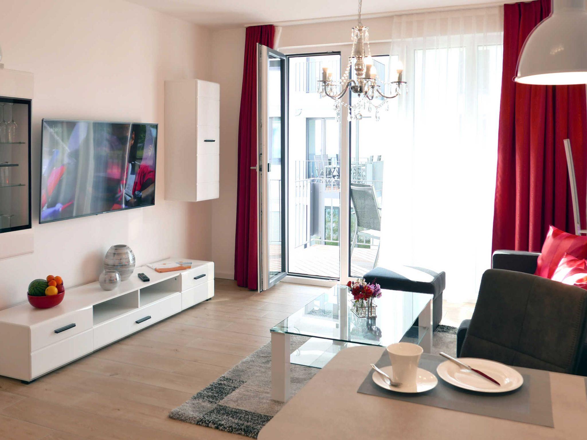 Die moderne helle Ferienwohnung für 3 Personen bietet allen Komfort für einen entspannten Urlaub. Im Wohnbereich befindet sich das gemütliche Schlafsofa mit einer Liegefläche von 150 x 200 cm. Von hier betreten Sie den Balkon mit seitlichen Meerblick. Der Küchenbereich ist mit hochwertigen Geräten gut ausgestattet und es gibt einen gemütlichen Esstisch. Im maritim gestalteten Schlafzimmer mit einem Doppelbett von 180 x 200 cm befindet sich ein weiterer Fernseher. WLAN ist selbstverständlich vorhanden.