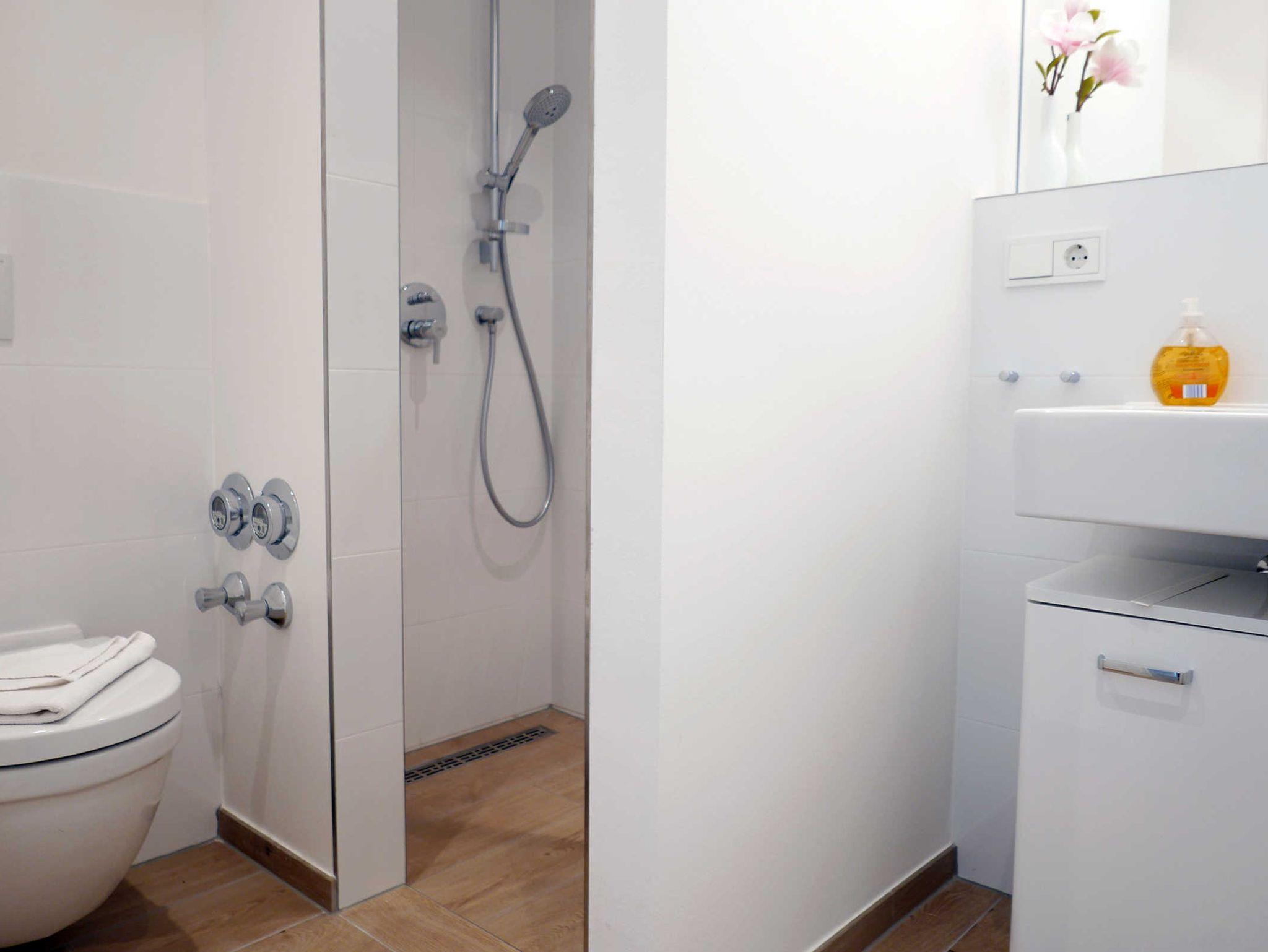 Im Bad befindet sich eine Dusche und auch ein Fön ist vorhanden.