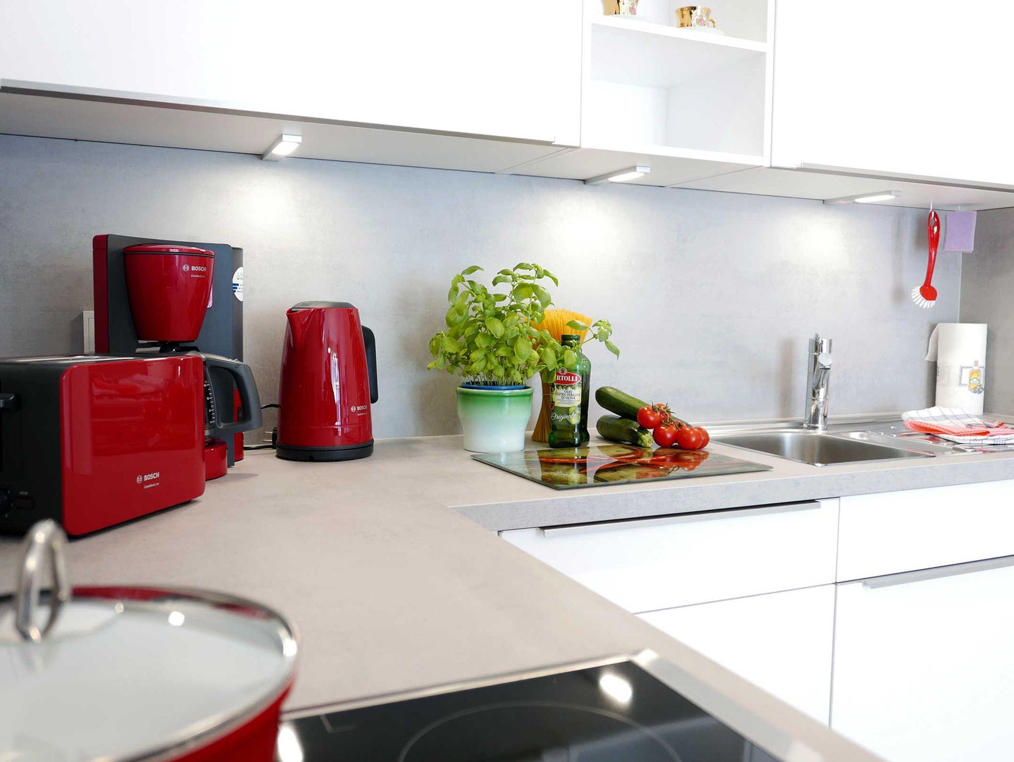 Die Wohnung hat ein Wohn-/Esszimmer mit Küchenzeile. Eine Geschirrspülmaschine, ein Backofen und ein Cerankochfeld sowie ein Kühlschrank mit Gefrierfach sind vorhanden.