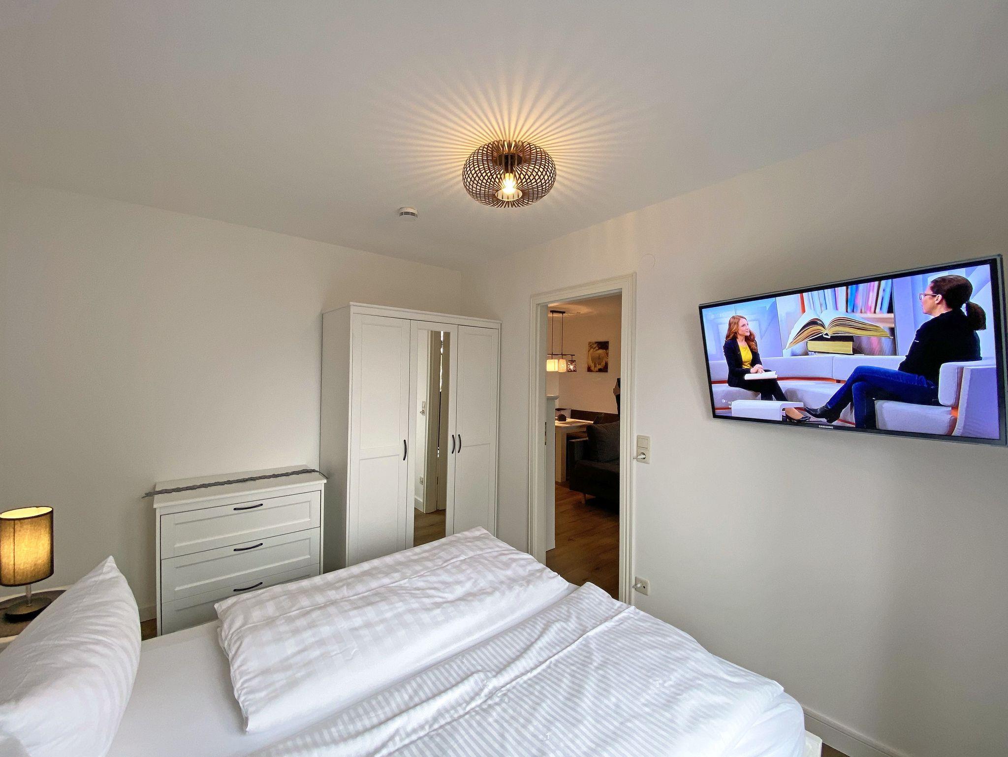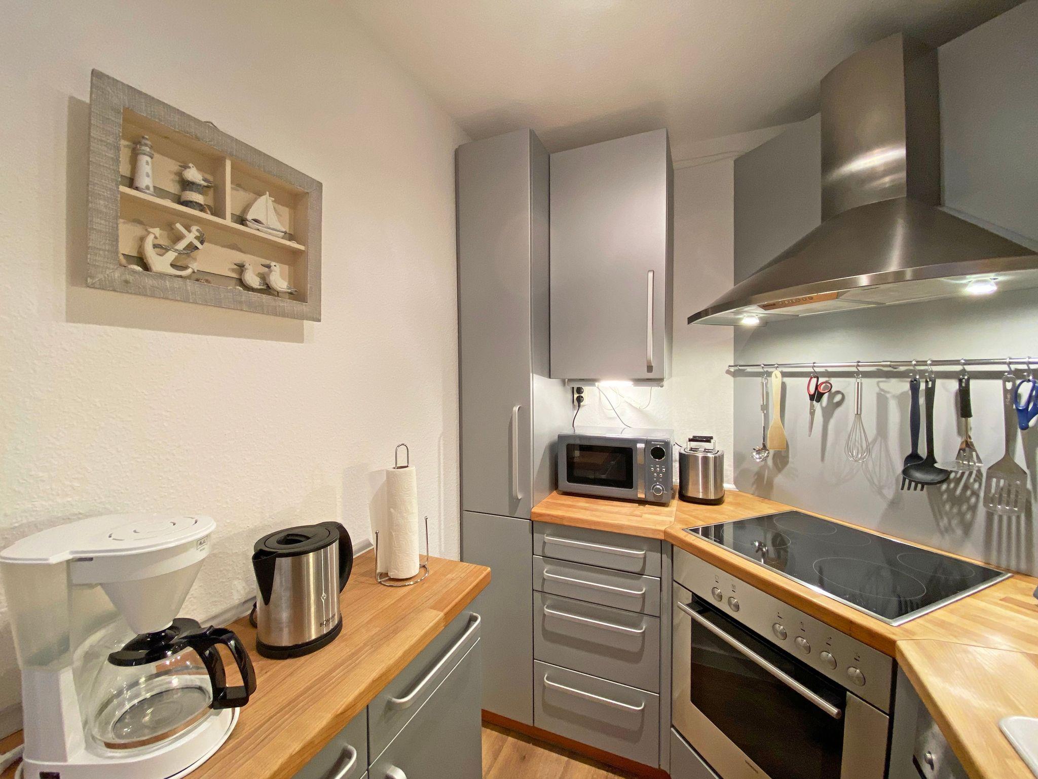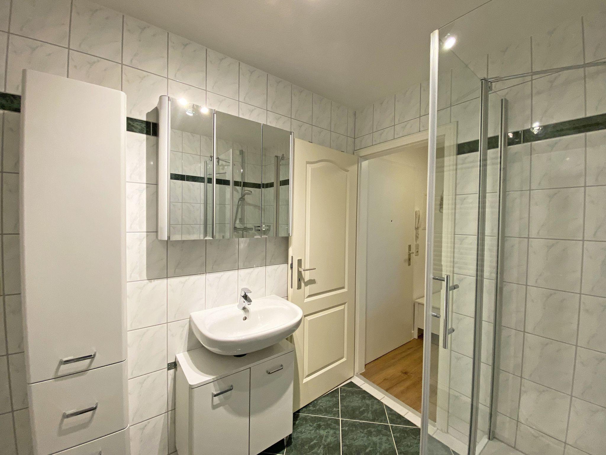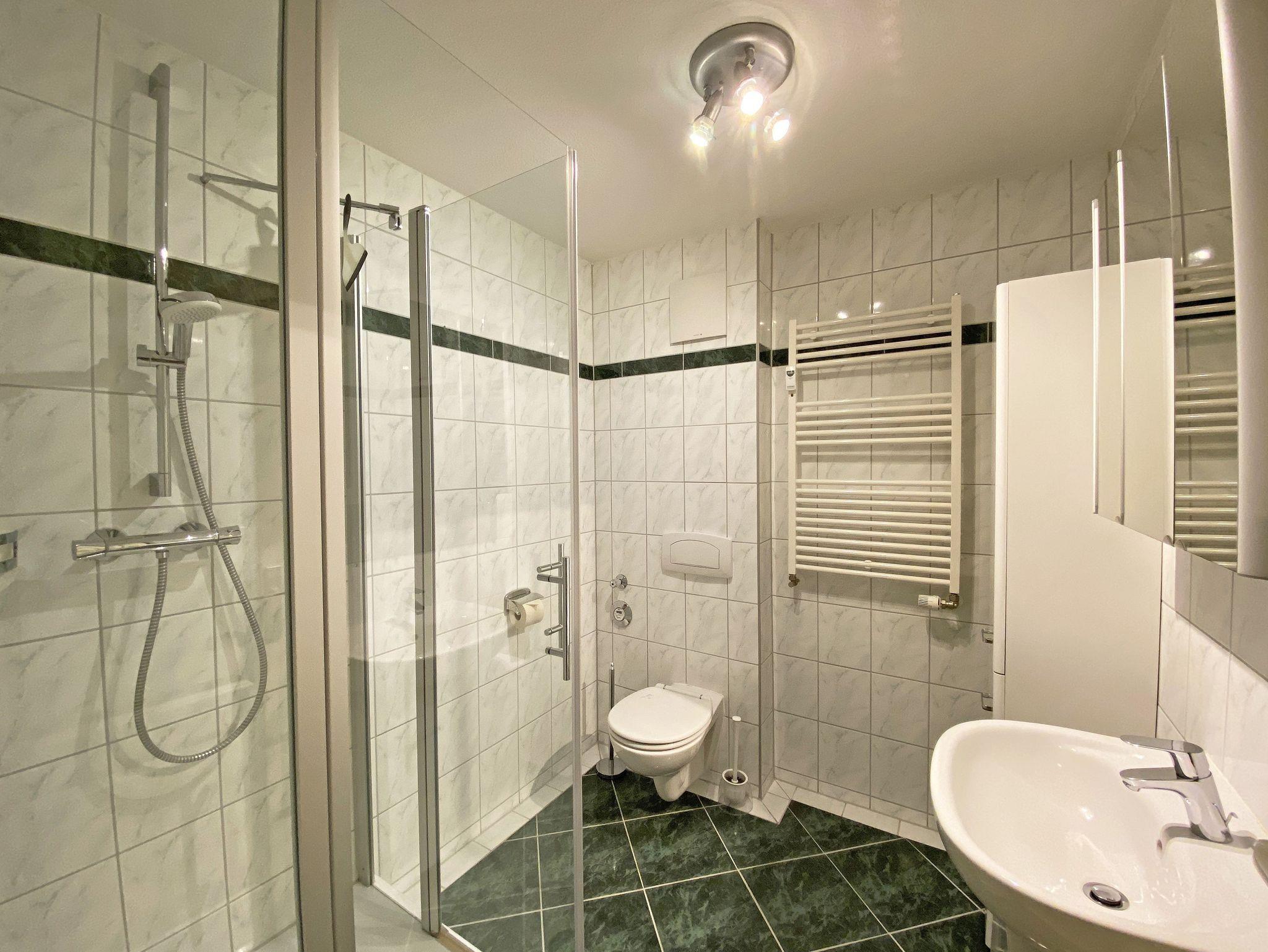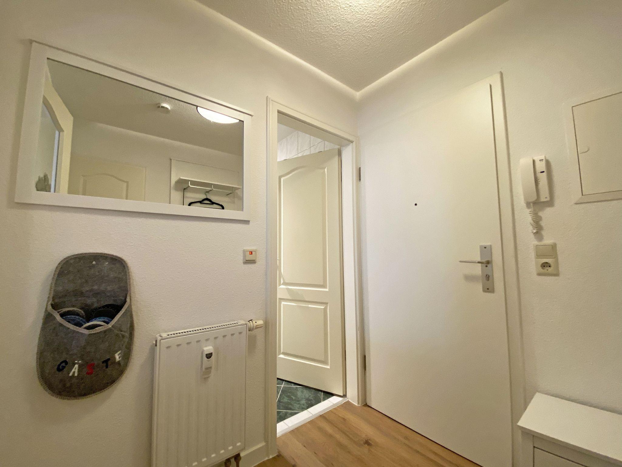 Die gut eingerichtete 2-Raum-Nichtraucherwohnung Nr. 04 Ostseeliebe mit ca. 48 m², befindet sich in der 1.Etage und ist bequem mit dem Fahrstuhl aus der Tiefgarage erreichbar. Sie bietet Ihnen Platz für max. 2 Erwachsene + 1 Kleinkind bis 3 Jahre im Kinderreisebett. Der Flur ist mit einer Garderobe, einem Spiegel und einem Schuhschrank ausgestattet. Im Wohnbereich befindet sich eine gemütliche Couch mit Ottomane, ein Couchtisch, eine Leselampe, ein kleines Highboard sowie ein TV-Board mit Smart-TV und DAB-Radio mit Bluetooth, USB und AUX. Ein Internetanschluss (WLAN/50 MBits) ist für Sie zusätzlich inklusive. Auch Buchliebhaber kommen durch die vorhandene Urlaubslektüre auf Ihre Kosten. Der Essbereich mit Sitzbank und bequemen Stühlen passt sich dem Raum an. Ihren bestuhlten mit Insektenschutztür versehenen Balkon (Süd) mit Strandkorb erreichen Sie vom Wohnbereich. Die separate Küche lässt keine Wünsche offen. Eine Spülmaschine, Kühlschrank mit Eisfach, Mikrowelle, Ceranfeld mit Backofen, Wasserkocher, Kaffeemaschine, Senseo Pad-Padmaschine, Toaster und diverse Küchenutensilien haben hier ihren Platz gefunden. Im hellen Schlafzimmer befindet sich ein Doppelbett (1,60m x 2,00m, H3) sowie Nachttischablagen, einem Kleiderschrank, einer Kommode, Smart-TV sowie ein Verdunklungsvorhang. Vom Flur gelangen Sie in Ihr Bad, welches mit einer Dusche mit niedrigem Einstieg, WC, Schränken, Kosmetikspiegel und Fön ausgestattet ist. Im vorhandenen Abstellraum können Sie zusätzlich Ihre Urlaubskleidung unterbringen, hier finden Sie außerdem ein Bügelbrett und Bügeleisen, Reinigungsutensilien sowie einen Wäscheständer. Ein Haustier (keine Katzen) ist gegen eine Gebühr ein gern gesehener Gast. Ein eigener PKW-Stellplatz Nr.04 befindet sich in der Tiefgarage (Einfahrtshöhe: 1,90 m). Ihre mitgebrachten oder geliehenen Fahrräder können in dem zur Wohnung gehörenden abschließbaren Keller (Nr.04) abgestellt werden. Die Erstausstattung eines Wäschepaketes (komplette Bettwäsche, 1 Duschhandtuch, 2 kleine Handtücher) können Sie bis 14 Tage vor Anreise gegen einen Aufpreis dazu buchen oder durch eigene ergänzen. Ab 2 gebuchten Paketen erhalten Sie einmalig 1 Geschirrhandtuch und 1 Duschvorleger hinzu.