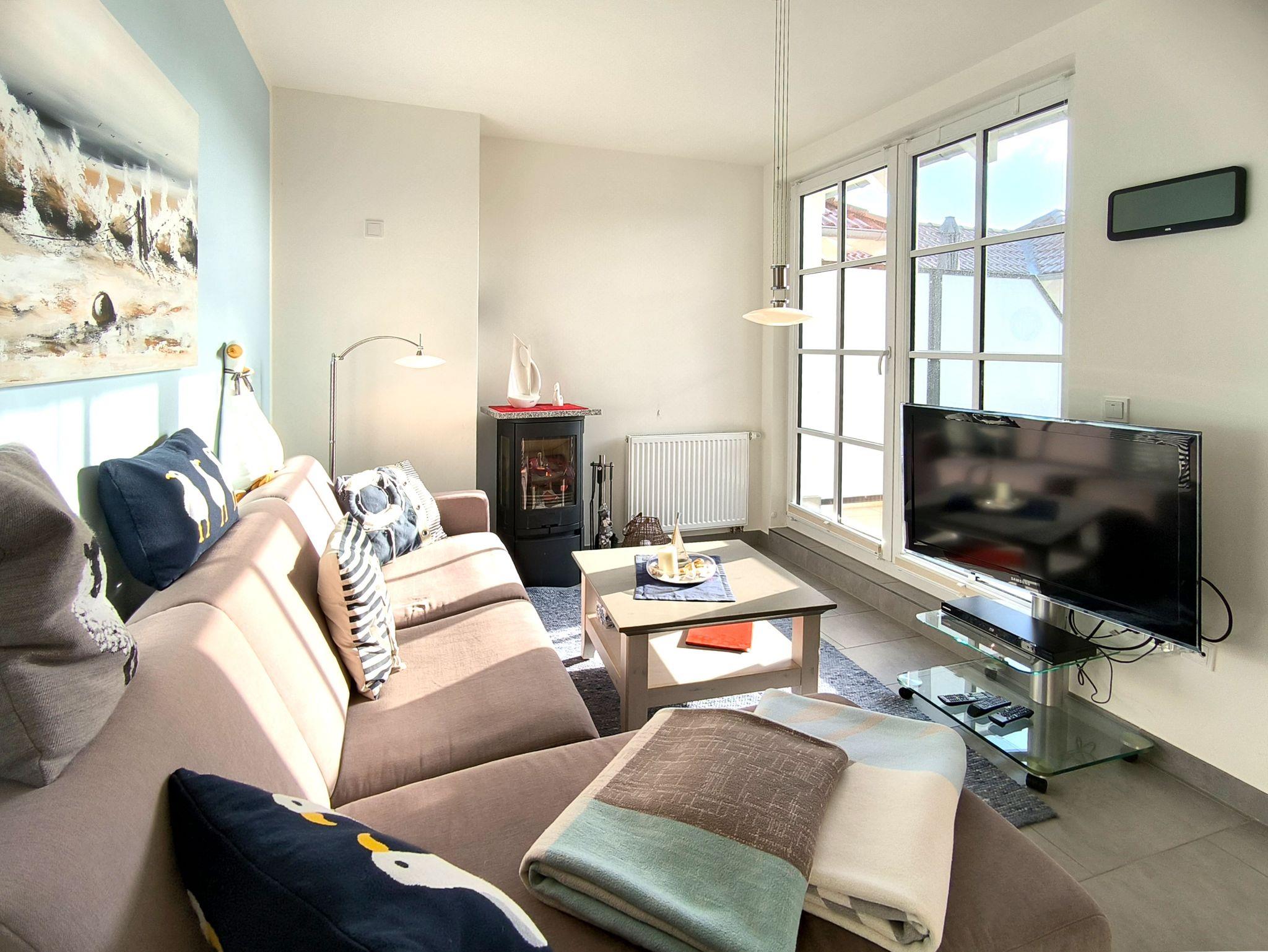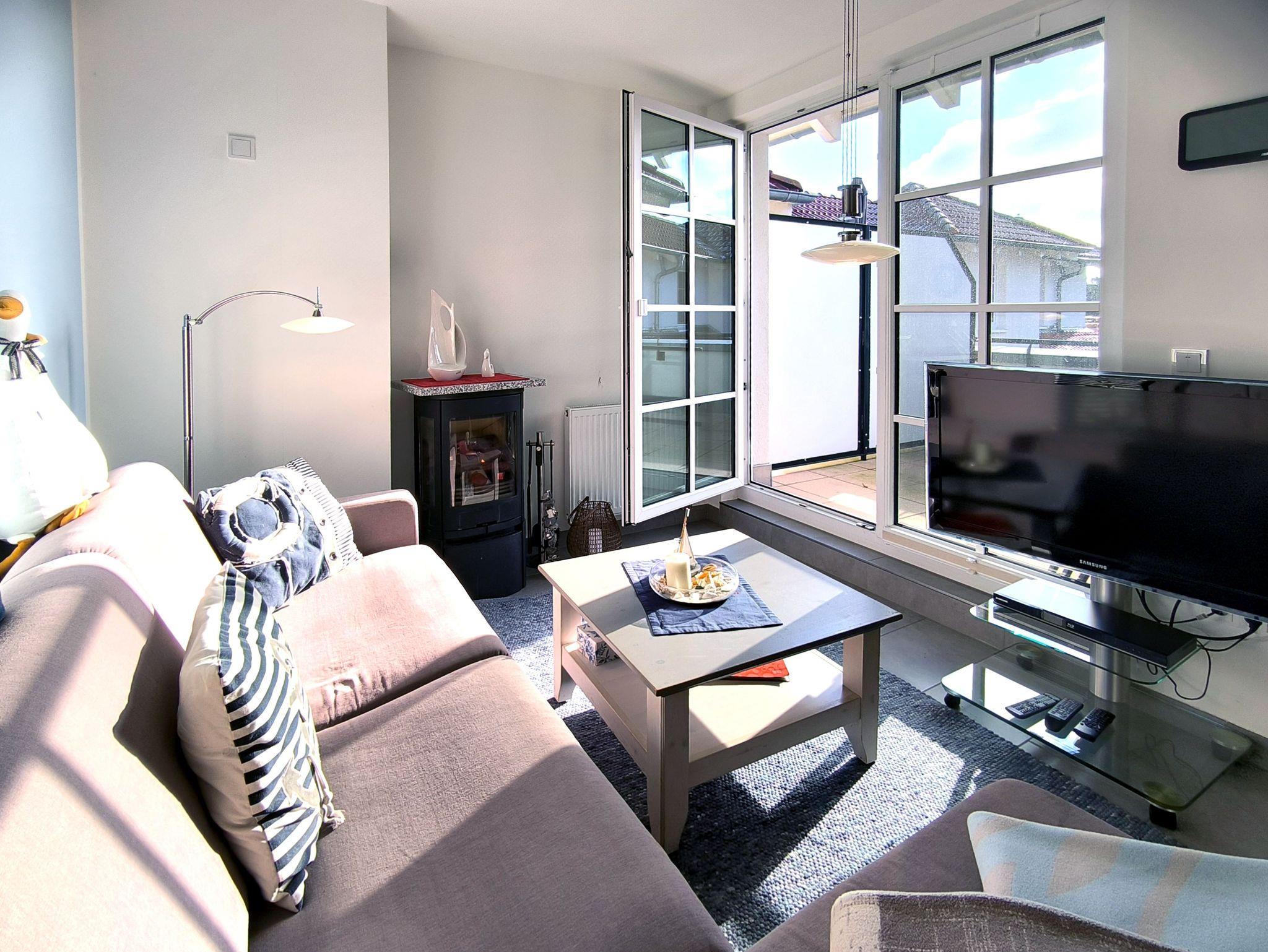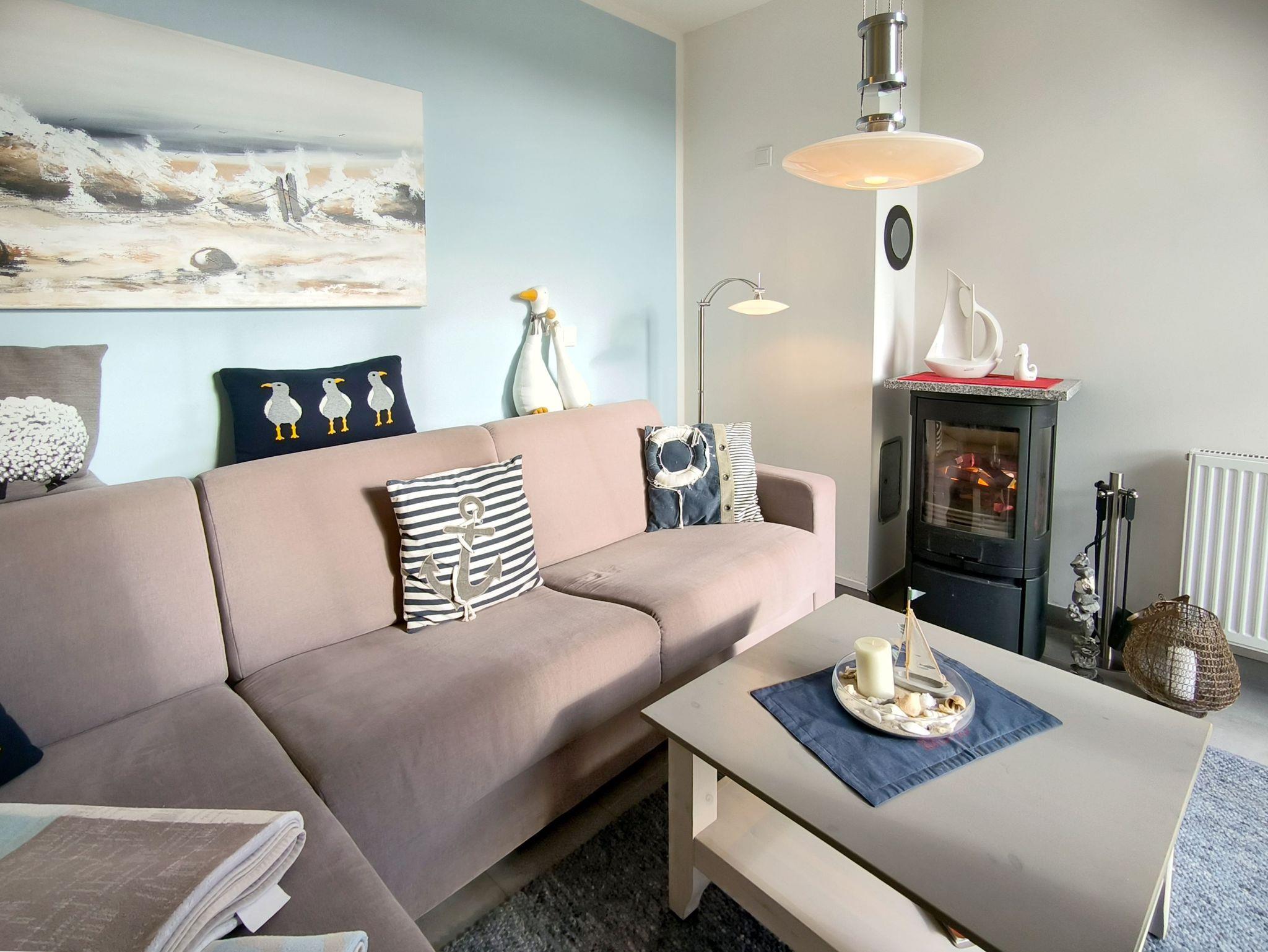 Auf einem Sofa mit Ottomane und Sessel können die Urlauber Fernsehsendungen gemütlich erleben. Das lnterner-Flat und Wlan ist inclusive. Ein Radion, DVD-Player ist vorhanden. Gespickt ist die liebevoll eingerichtete Wohnung mit maritimer Deko.