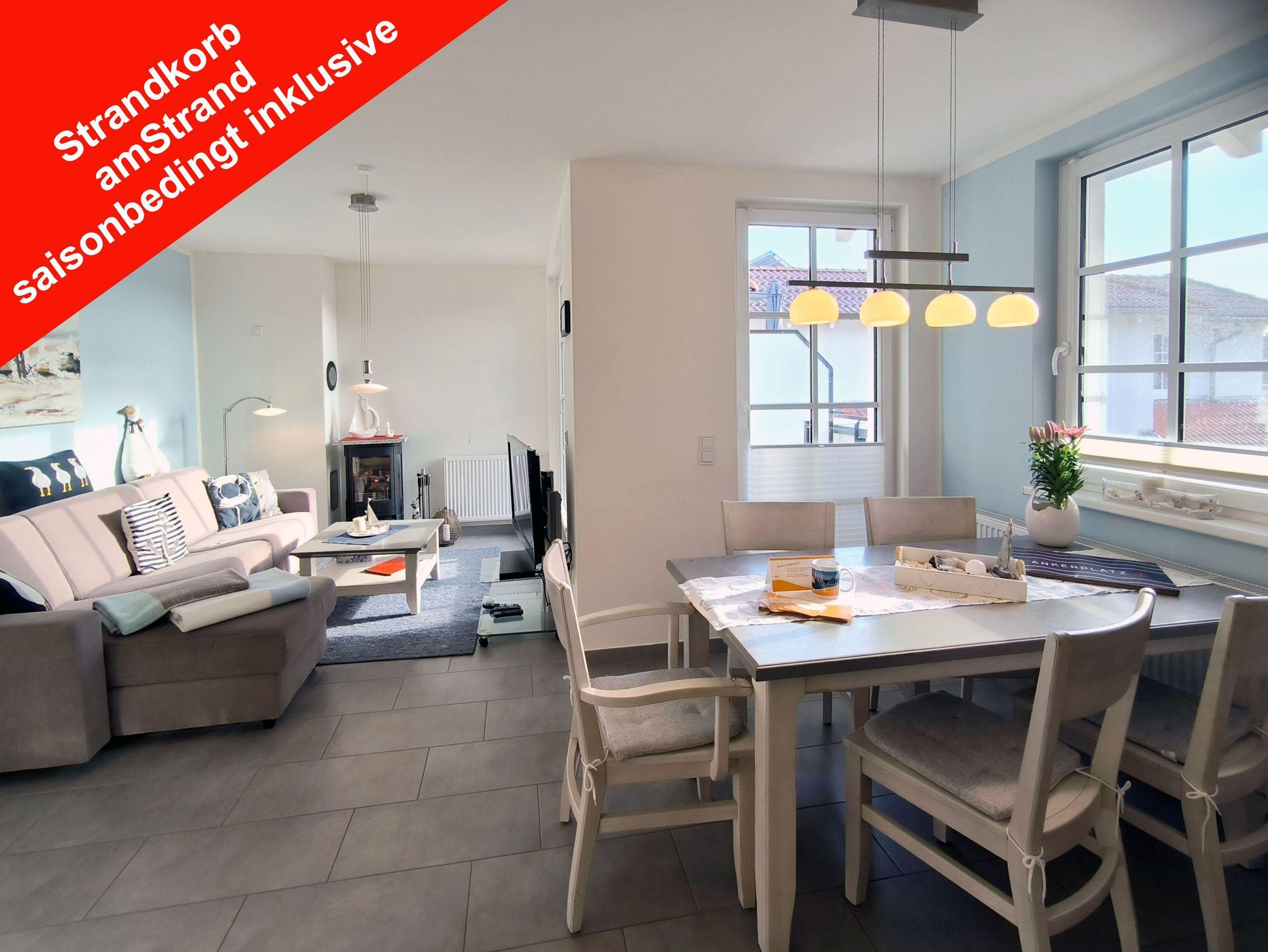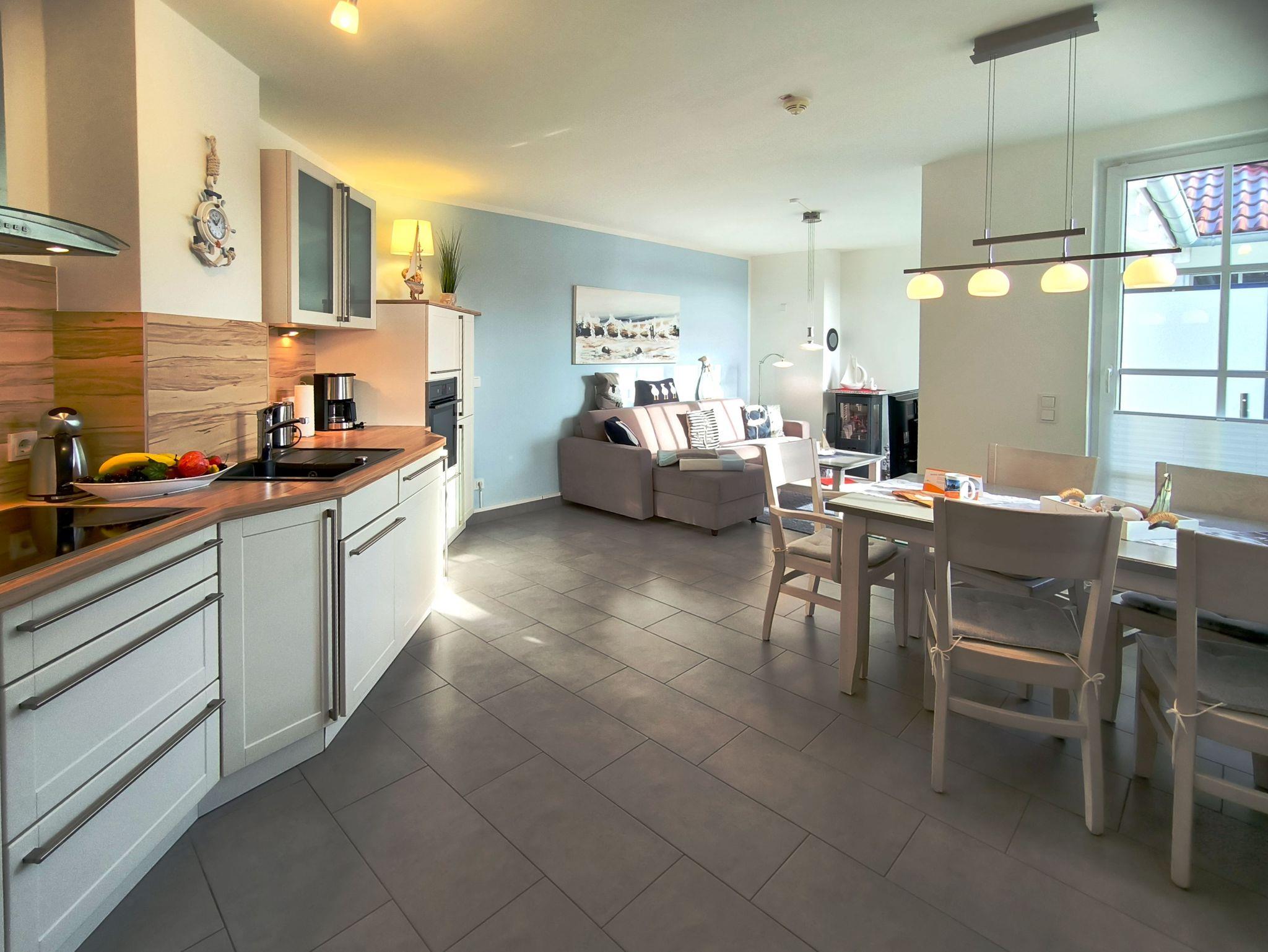Auf 67qm ist diese 3-Zimmer-Ferienwohnung für 4 Personen geeignet. Besonders hervorzuheben ist der geräumige Wohn-/Essbereich. Hier lässt sich einerseits gemütlich Speisen, andererseits können hier entspannte Abende auf dem Sofa neben dem Kamin (gegen Gebühr) verbracht werden. Natürlich befindet sich hier auch ein Fernseher, ein weiterer Fernseher ist in einem Schlafzimmer vorhanden. Die integrierte Küchenzeile verfügt über eine topmoderne Ausstattung. Gespickt ist die liebevoll eingerichtete Wohnung mit maritimer Deko.