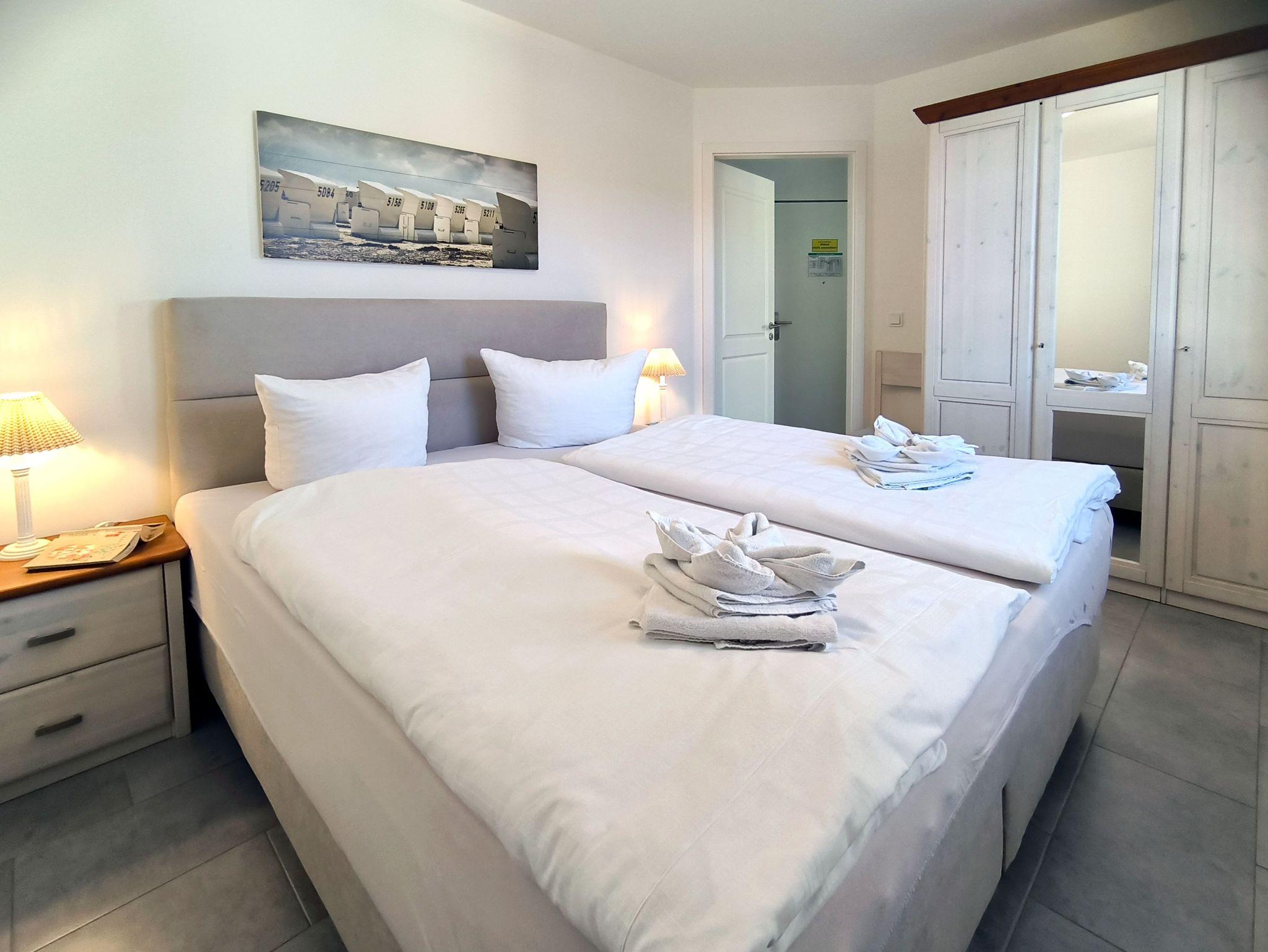 Den Gästen stehen zwei Schlafzimmer mit je einem Doppelbett zur Verfügung. In den Schlafzimmern sind Flachbild-TV vorhanden. 1 m ersten Schlafzimmer befindet sich das Boxspringdoppelbett. Für das Aufstellen eines vorhandenen Kinderbetts ist ausreichend Platz. Die Ferienwohnung ist mit einem modernen und geräumigen Wohn-/ Essbereich ausgestattet.