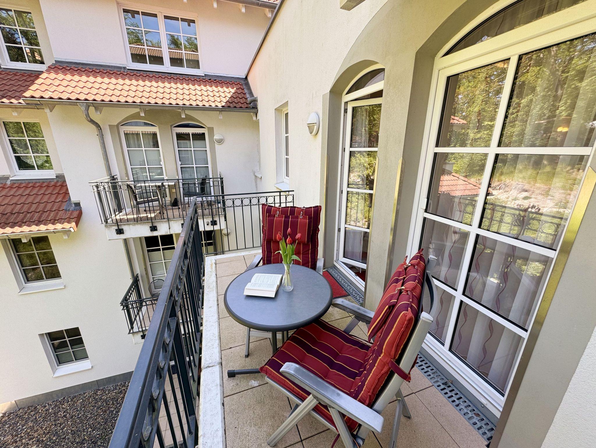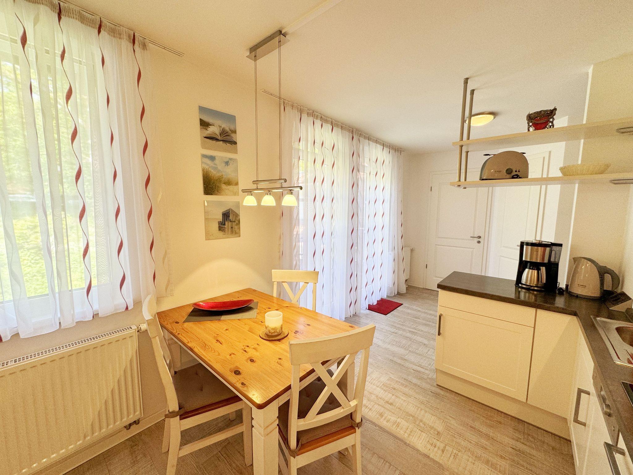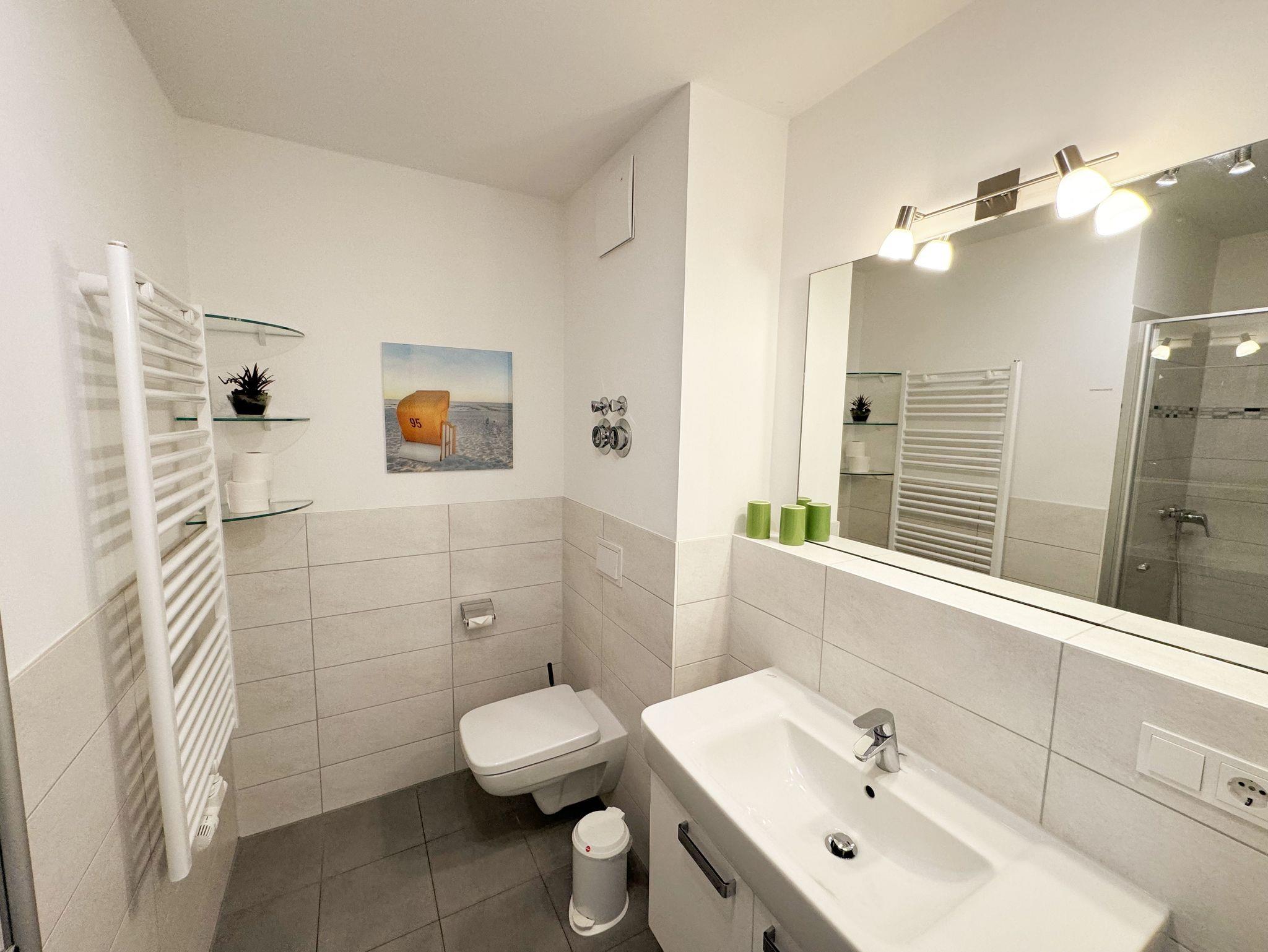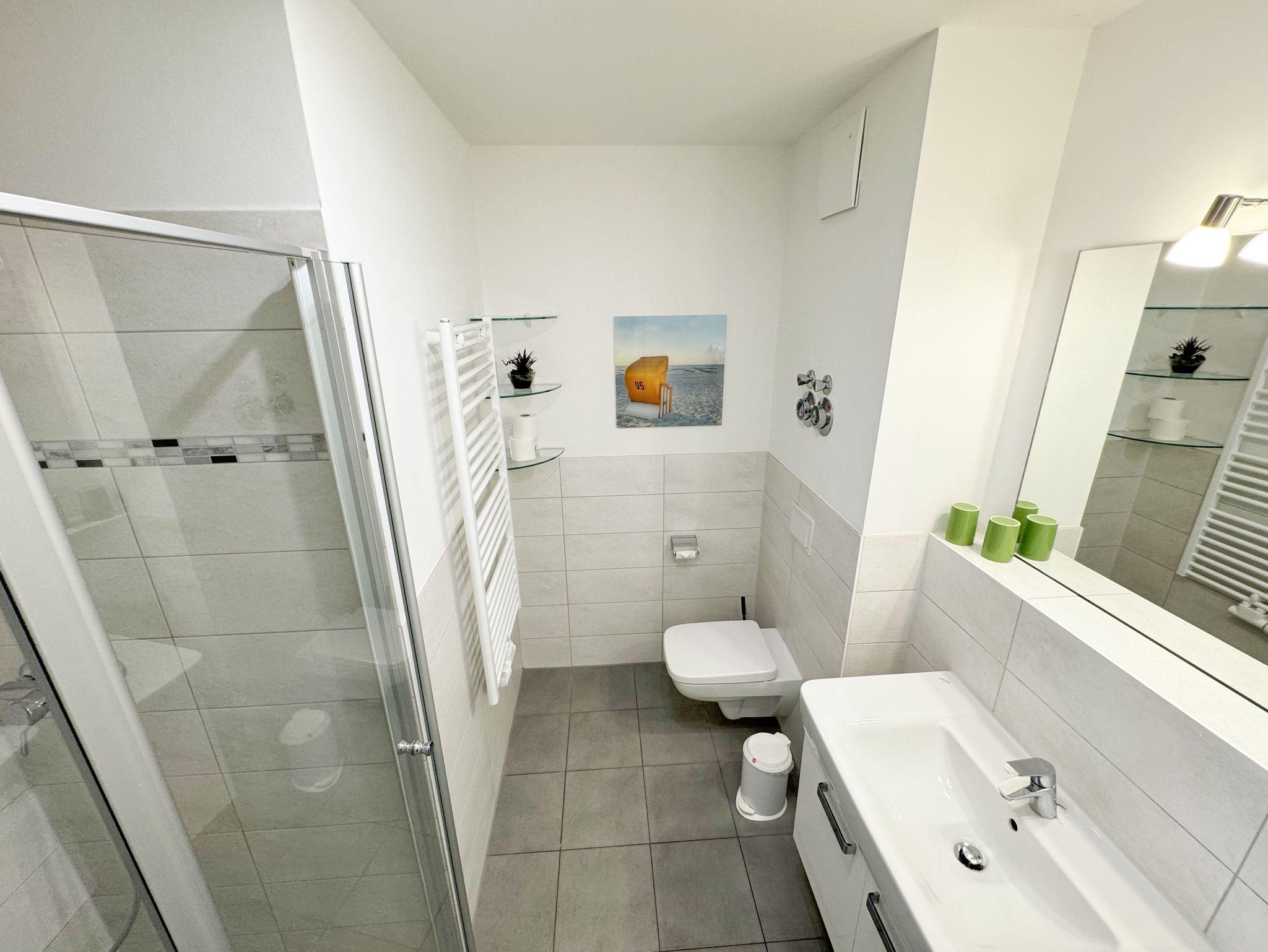 Ihre Nichtraucher-Ferienwohnung ist mit viel Liebe zum Detail ausgestattet und eingerichtet worden. Sie wohnen in einer ca. 42 qm 2-Zimmer Wohnung, die für max. 2 Personen ausgelegt ist. Die Wohnung A.2.23 befindet sich in der 2. Etage und ist per Fahrstuhl von der Tiefgarage bequem zu erreichen. In der Wohnung finden Sie einen kombinierten Wohn/Koch- und Essbereich. Die integrierte Küchenzeile lässt mit Backofen, 2 Zonen-Ceranfeld, Spülmaschine, Kühlschrank mit Gefrierfach, Kaffeemaschine, Wasserkocher, Toaster und anderen praktischen Kochutensilien keine Wünsche offen. Im Wohnbereich befindet sich eine Essecke, eine gemütliche Couch, LCD-TV, DVD-Player und eine Musikanlage mit USB und IPhone/IPod Dock Station sind vorhanden. Auch auf einen Internetanschluss (WLAN) müssen Sie im Urlaub nicht verzichten. Dieser ist für Sie inklusive! Der große Balkon ist vom Wohn/Essbereich begehbar und möbliert. Das Schlafzimmer ist mit einem Doppelbett (1,80m x 2,00m), verstellbare Lattenroste, Nachttischkonsolen, einem Kleiderschrank und einem weiteren Flachbild-TV ausgestattet. Das Bad verfügt über eine ebenerdige Dusche, Waschbecken, WC, Handtuchheizkörper sowie einen Fön. Ein kleiner Abstellraum gehört zur Wohnung dazu. Hier finden untereinander Reinigungsutensilien sowie einen Wäscheständer. 1 kleiner Hund (keine Katzen) ist gegen eine Gebühr ein gern gesehener Gast. Ein eigener PKW-Stellplatz (Nr. 105, Einfahrtshöhe 2,00m) befindet sich in der Tiefgarage des Hauses. Im Keller des Hauses haben Sie die Möglichkeit eine Waschmaschine/Trockner gegen Gebühr zu nutzen. Mit dem Fahrstuhl des Hauses A gelangen sie in das Untergeschoss der Meeresblickanlage, wo Sie ein großzügiger und heller Wellnessbereich erwartet. Hier können sie in einem Pool kleine Bahnen schwimmen, in 2 Saunen Ihren Kreislauf in Schwung bringen, in einem dazugehörigen Ruheraum Ihren Körper wieder beruhigen, in einer Schneckendusche sowie weiteren Duschen das kühle Nass genießen und auf einer Außenterrasse mit Außendusche die frische Luft einatmen. Die Erstausstattung eines Wäschepaketes (komplette Bettwäsche, 1 Duschhandtuch, 2 kleine Handtücher) können Sie bis 14 Tage vor Anreise gegen einen Aufpreis dazu buchen oder durch eigene ergänzen. Ab 2 gebuchten Paketen erhalten Sie einmalig 1 Geschirrhandtuch und 1 Duschvorleger hinzu.