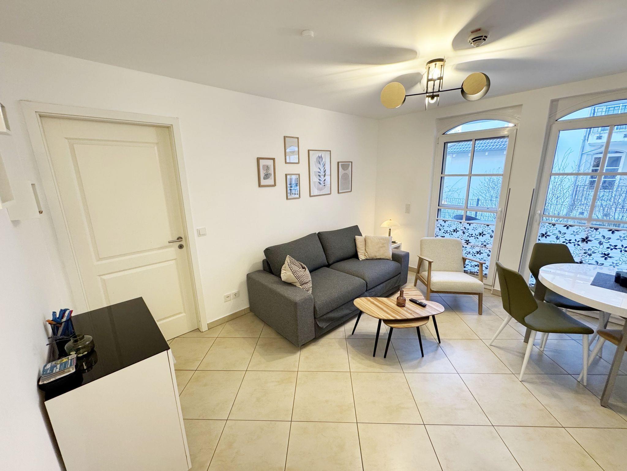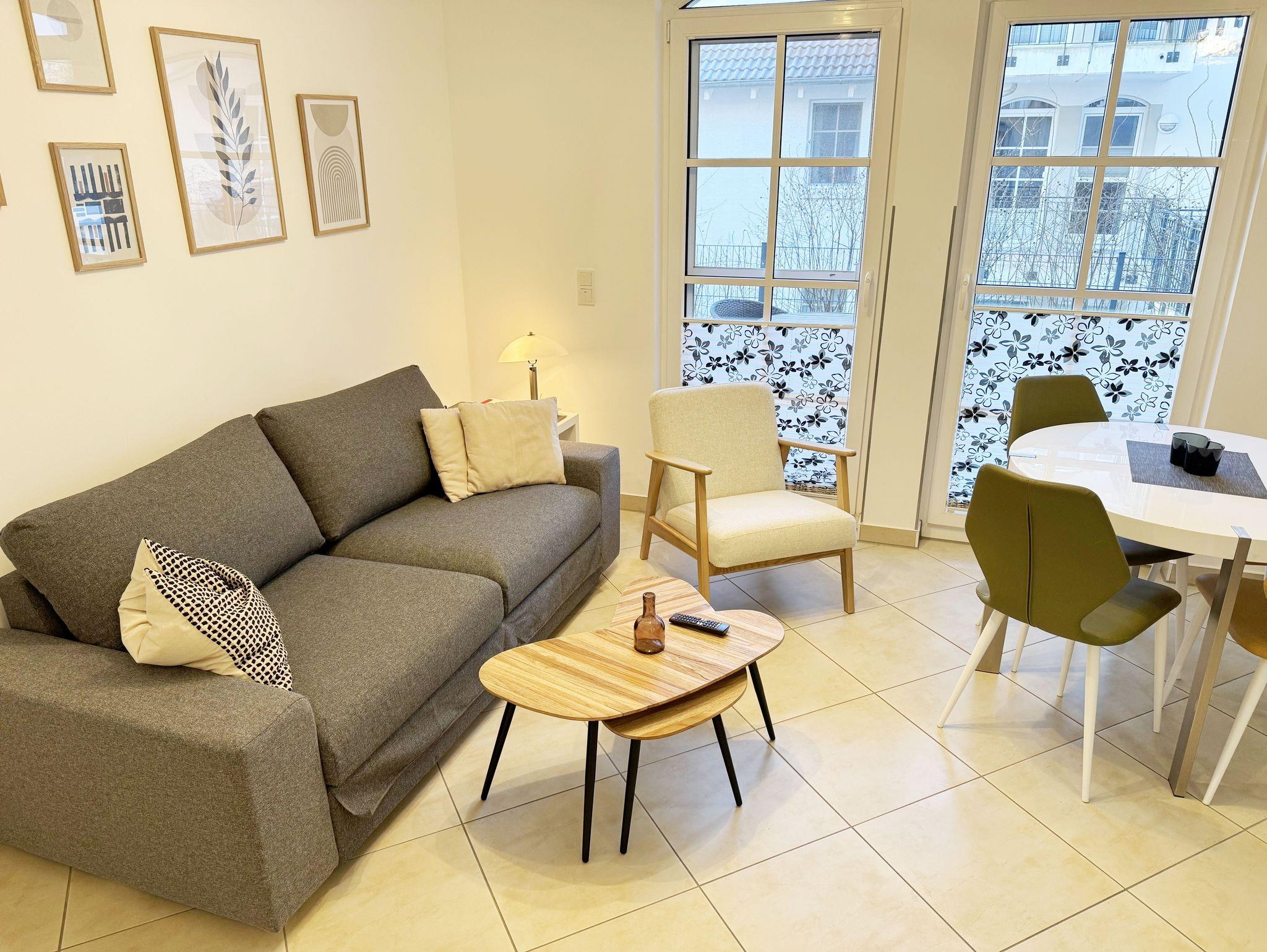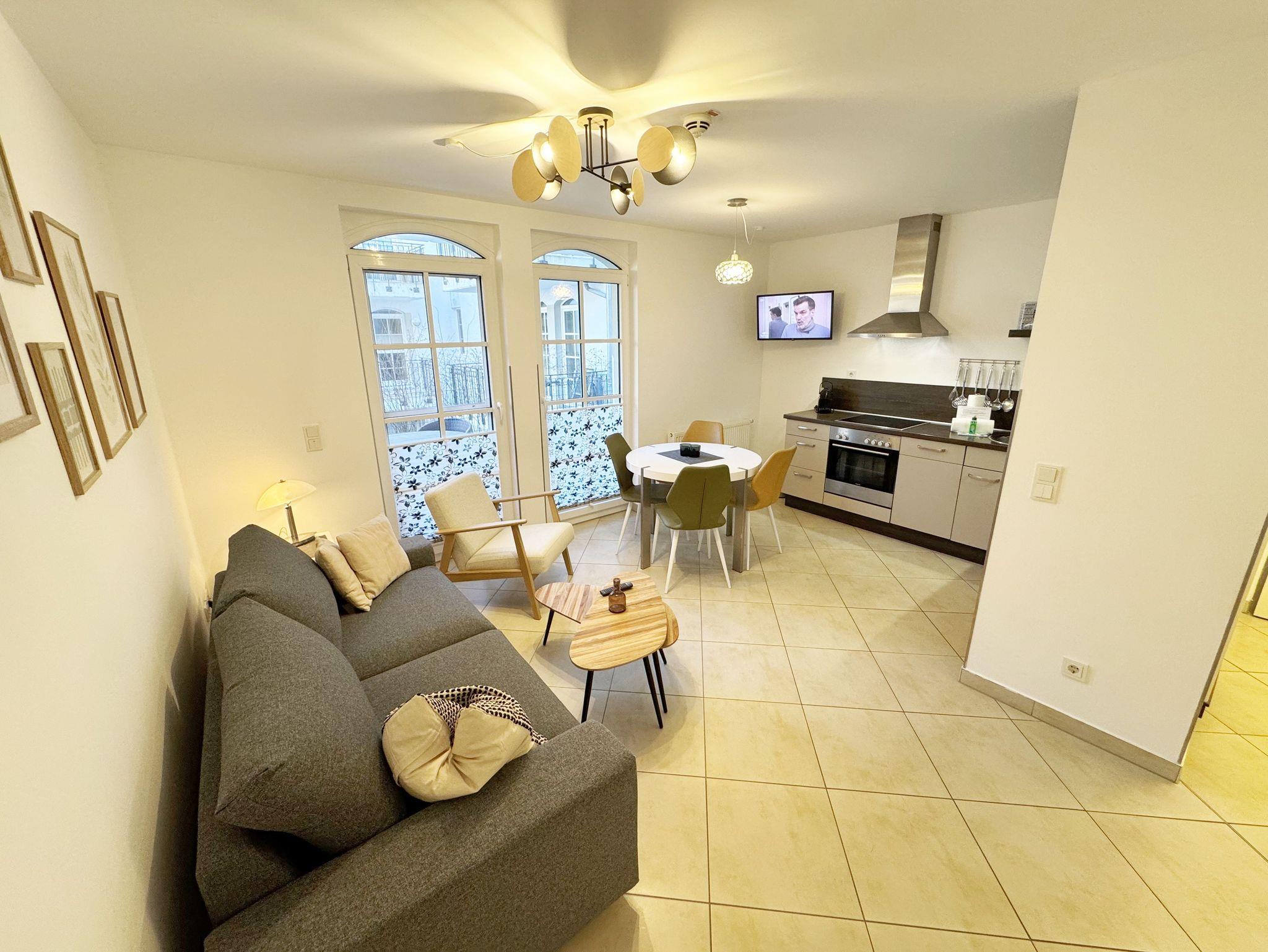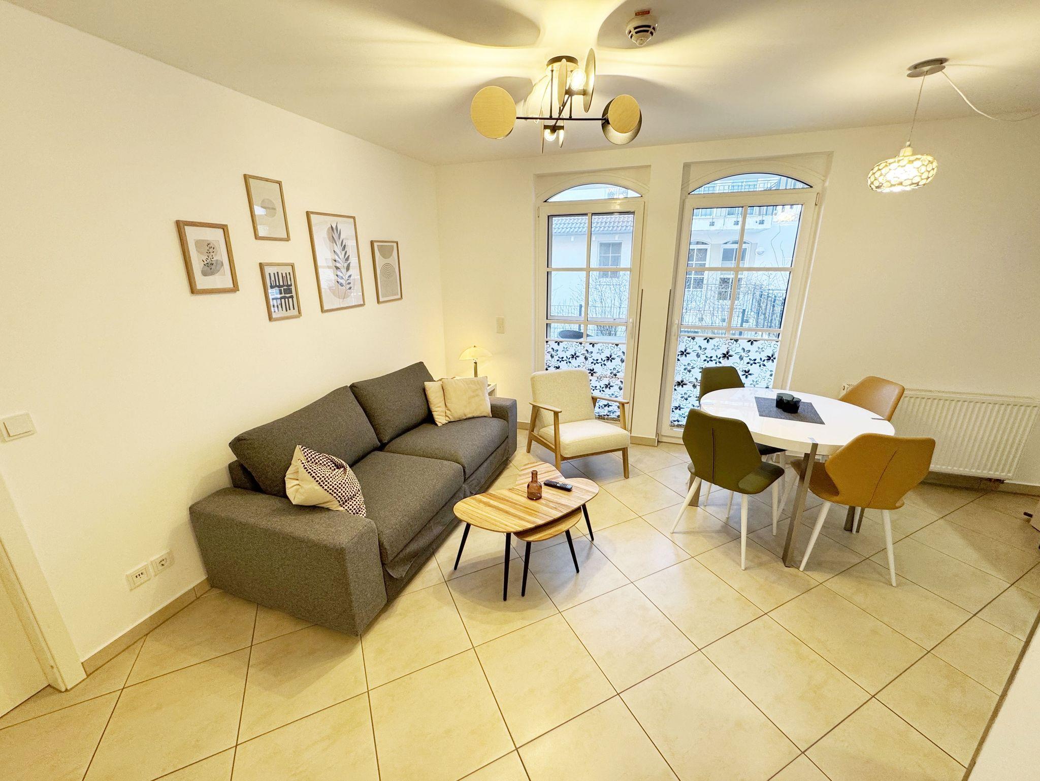 Ihre Nichtraucher-Ferienwohnung ist mit viel Liebe zum Detail ausgestattet und eingerichtet worden. Sie wohnen in einer ca. 41 qm großen 2-Zimmerwohnung, die für 2 bis max. 3 Personen ausgelegt ist. Die Wohnung Seegeflüster (A 1.26) befindet sich im Erdgeschoss und ist per Fahrstuhl von der Tiefgarage zu erreichen. In der Wohnung finden Sie einen kombinierten Wohn-/Koch- und Essbereich. Die integrierte Küchenzeile lässt mit Mikrowelle, Backofen, Ceranfeld, Spülmaschine, Kühlschrank mit Gefrierfach, Kaffeemaschine, Nespresso Maschine, Wasserkocher, Toaster und anderen praktischen Helfern keine Wünsche offen. Im Wohnbereich sind weiterhin eine Essecke, eine Leselampe, eine gemütliche Couch, die in wenigen Handgriffen zur 2. Schlafstätte umfunktioniert werden kann (1,45m x 2,00m), ein Smart-TV (43 Zoll) und eine Musikanlage mit DAB-Radio und eine Vitrine vorhanden. Die Terrasse ist vom Wohn-/Essbereich begehbar und komplett möbliert. Von hier aus schauen Sie in Richtung Kiefern und Dünen. Das Schlafzimmer ist mit einem Doppelbett (1,80 m x 2,00 m), verstellbaren Lattenrosten, Nachttischkonsolen und einem Kleiderschrank ausgestattet. Für einen ruhigen Schlaf sorgen die vorhandenen Insektenschutzgitter sowie Verdunklungsplissee´s im Schlaf- und Wohnbereich. Das Bad verfügt über eine ebenerdige Dusche, Waschbecken, WC, Kosmetikspiegel, Handtuchheizkörper und einen Haarfön. Auch im Urlaub brauchen Sie in der Wohnung nicht auf einen Internetanschluss (WLAN) verzichten. Dieser ist für Sie inklusive! Im Keller des Hauses haben Sie die Möglichkeit eine Waschmaschine/Trockner gegen Gebühr zu nutzen. Ein Haustier gegen eine Gebühr ein gern gesehener Gast. Ein eigener PKW-Stellplatz (Nr.126, Einfahrtshöhe 2,00m) befindet sich in der Tiefgarage des Hauses. Mit dem Fahrstuhl des Hauses A gelangen sie in das Untergeschoss der Meeresblickanlage, wo Sie ein großzügiger und heller Wellnessbereich erwartet. Hier können sie in einem Pool kleine Bahnen schwimmen, in 2 Saunen Ihren Kreislauf in Schwung bringen, in einem dazugehörigen Ruheraum Ihren Körper wieder beruhigen, in einer Schneckendusche sowie weiteren Duschen das kühle Nass genießen und auf einer Außenterrasse mit Außendusche die frische Luft einatmen. Die Erstausstattung eines Wäschepaketes (komplette Bettwäsche, 1 Duschhandtuch, 2 kleine Handtücher) können Sie bis 14 Tage vor Anreise gegen einen Aufpreis dazu buchen oder durch eigene ergänzen. Ab 2 gebuchten Paketen erhalten Sie einmalig 1 Geschirrhandtuch und 1 Duschvorleger dazu.