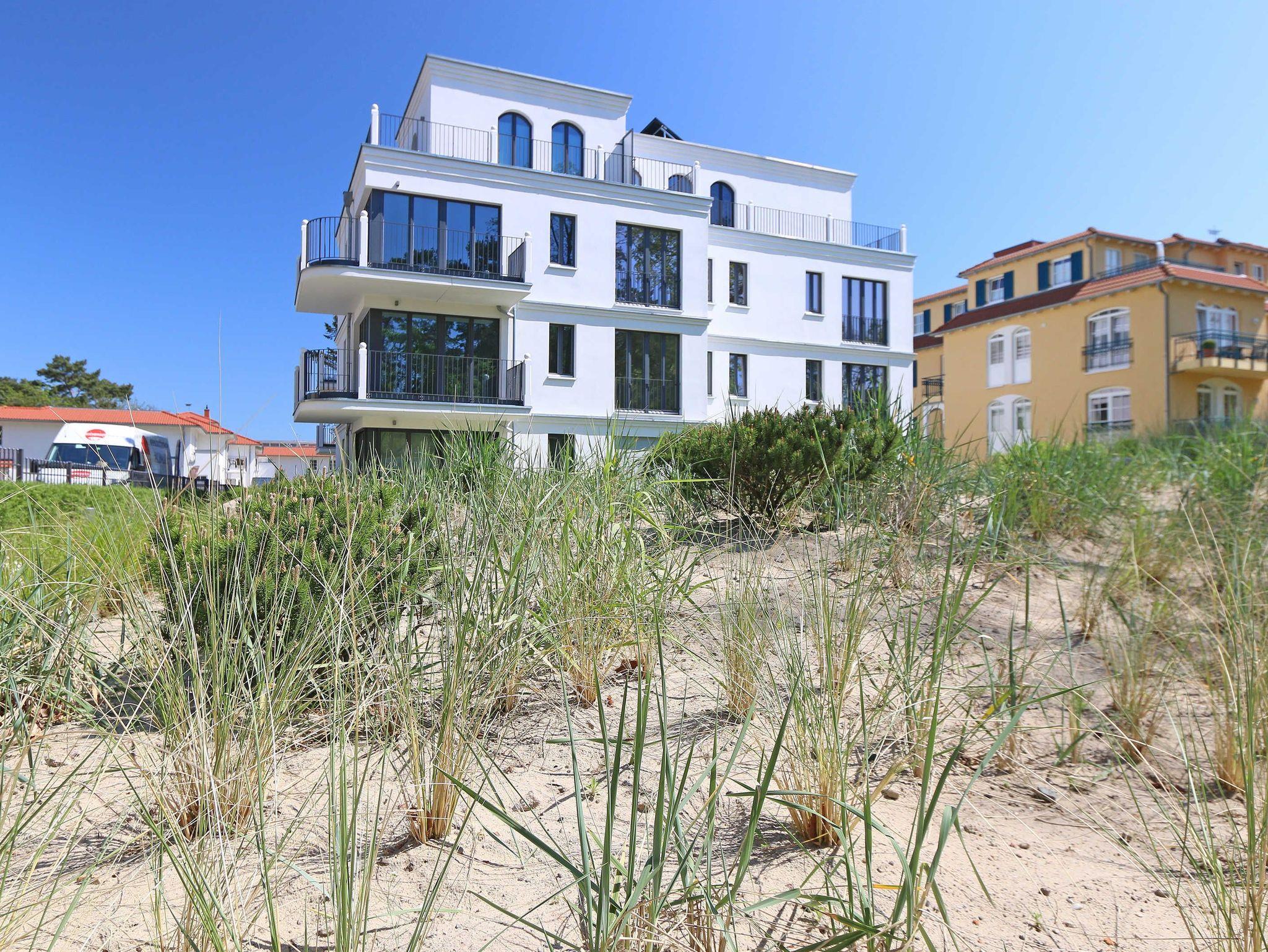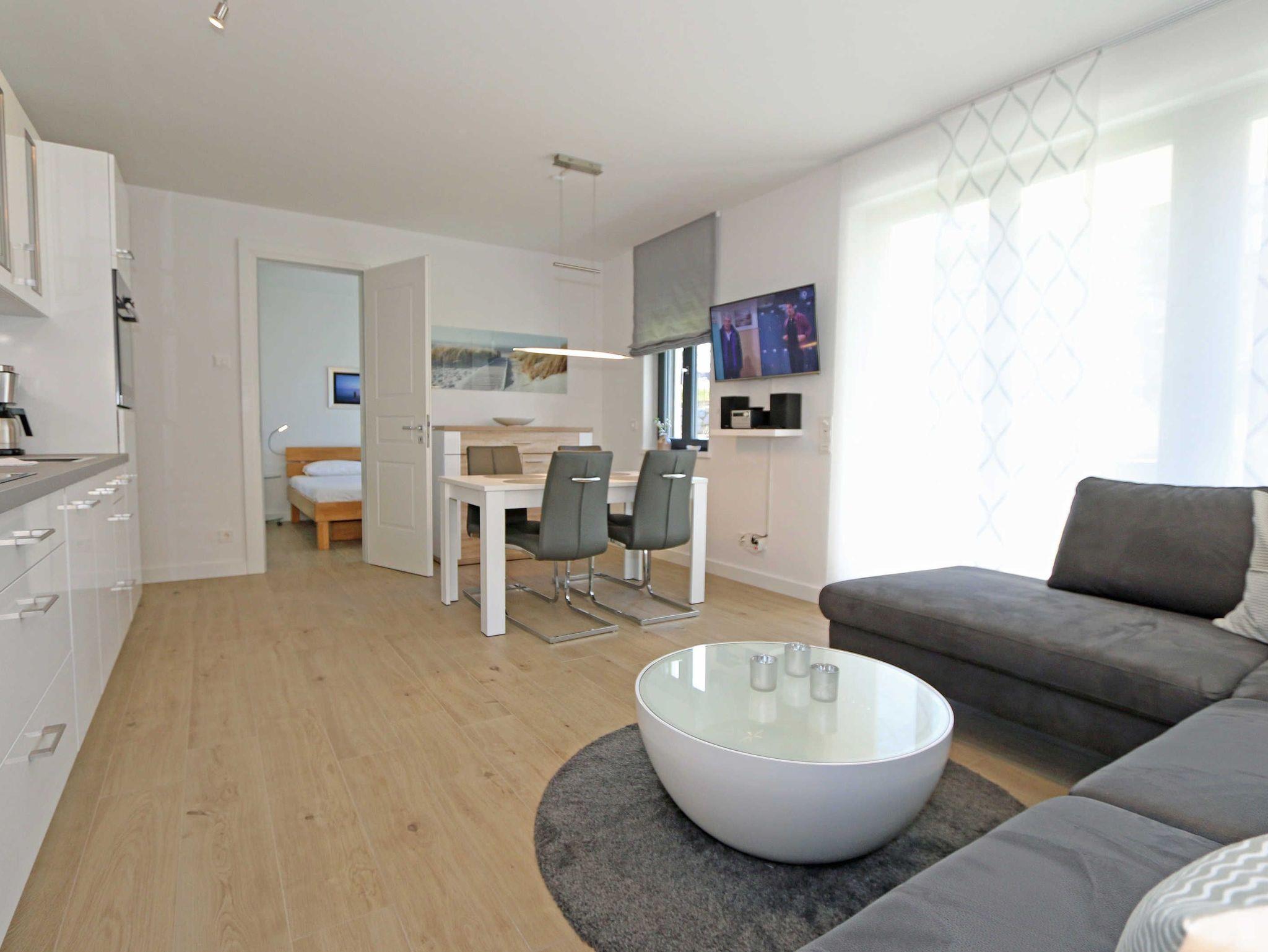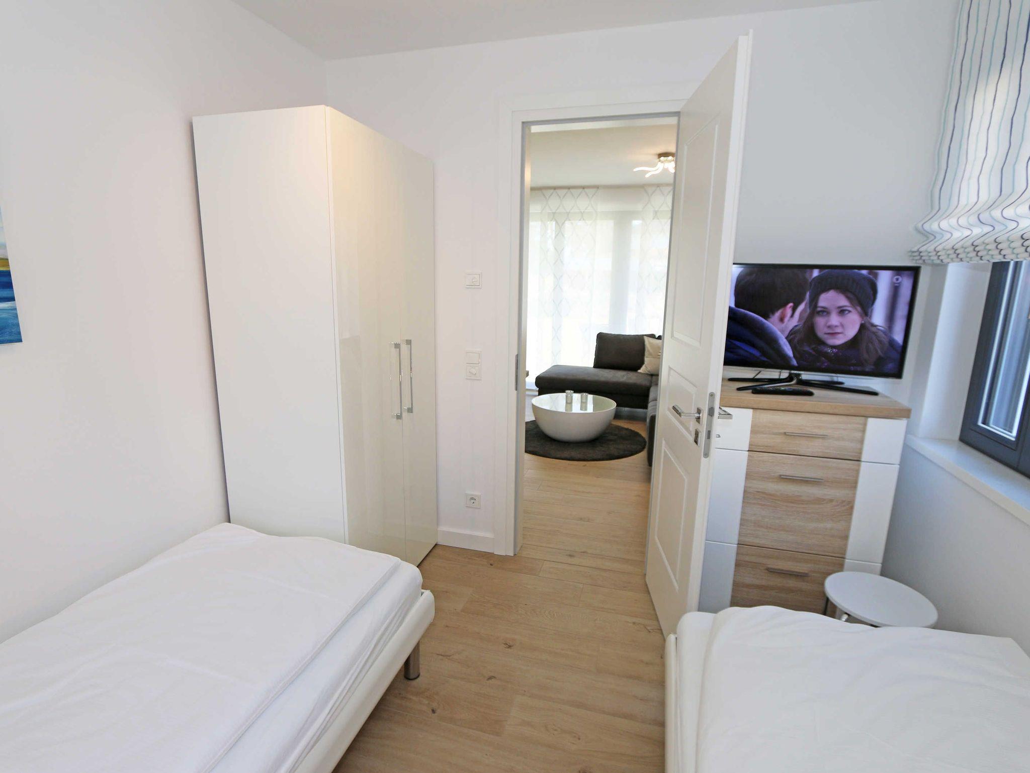 Die ca. 65 m² große 3-Zimmer-Ferienwohnung (Nichtraucher) bietet Ihnen durch ihre hochwertige Ausstattung beste Voraussetzungen für einen erholsamen Urlaub. Durch eine moderne und großzügige Raumaufteilung herrscht genügend Platz für 2 bis 4 Personen. Im lichtdurchfluteten Wohn-/Esszimmer können Sie durch die komfortable Eckcouch, einen Couchtisch, eine Leselampe, ein Sideboard und einen großen Essplatz gemütliche Tage verbringen. Für Unterhaltung sorgen dabei ein Smart-TV, eine Stereoanlage mit DAB-Radio inkl. CD-Player und das in der Wohnung kostenlos, verfügbare W-LAN. Vom Wohnbereich gelangen Sie auf die nach Süden ausgerichtete und bestuhlte Terrasse mit einer großzügigen Rasenfläche und Sonnenschirm, die von Ihnen allein genutzt werden kann. Für Ihr leibliches Wohl können die moderne Küchenzeile mit einem Ceranfeld, Backofen, Spülmaschine, Kühlschrank mit Eisfach, Kaffeemaschine, Dolce Gusto Maschine, Toaster, Wasserkocher sowie diverse Küchenutensilien sorgen. Ein weiterer Smart-TV befindet sich in einem der beiden Schlafzimmer, die jeweils mit bequemen Betten (ein Schlafzimmer verfügt über ein Doppelbett (1,80 m x 2,00 m) das andere über 2 Einzelbetten (je 0,90 m x 2,00 m), verstellbare Lattenroste, Nachttischablagen und Kleiderschränken für Ihre Urlaubsgarderobe ausgestattet sind. Für einen ruhigen Schlaf dienen die Außenrollos. Vom weitläufigen Flurbereich gelangen Sie direkt in die zwei komfortablen Bäder, die jeweils mit ebenerdiger Regen-Dusche, WC, Fön, Kosmetikspiegel, Handtuchtrockner sowie einen Waschplatz mit großzügigem Spiegel und breiter Ablagefläche eingerichtet sind. Alle Räumlichkeiten sind mit einer Fußbodenheizung ausgestattet sowie mit Insektenschutzgitter versehen. Haustiersind nicht erlaubt. Die hauseigene Tiefgarage (Platz Nr. 4 / Einfahrtshöhe 2,00 m) sorgt dafür, dass Ihr PKW sicher untergebracht ist. Durch die Tiefgarage gelangen Sie direkt in die Strandvilla Andrea, die auch über einen Lift verfügt, um Ihr Reisegepäck mühelos in die Ferienwohnung zu transportieren. Im Keller befinden sich außerdem eine münzgesteuerte Waschmaschine, ein Wäschetrockner und eine Sauna mit angrenzender Dusche, WC und einem Ruheraum, die zum Entspannen einladen. Auf dem Gelände der Strandvilla befinden sich überdachte Fahrradständer, an denen Sie eigene oder geliehene Räder abstellen können. Die Erstausstattung eines Wäschepaketes (komplette Bettwäsche, 1 Duschhandtuch, 2 kleine Handtücher) können Sie bis 14 Tage vor Anreise gegen einen Aufpreis dazu buchen oder durch eigene ergänzen. Ab 2 gebuchten Paketen erhalten Sie einmalig 1 Geschirrhandtuch und 1 Duschvorleger hinzu.