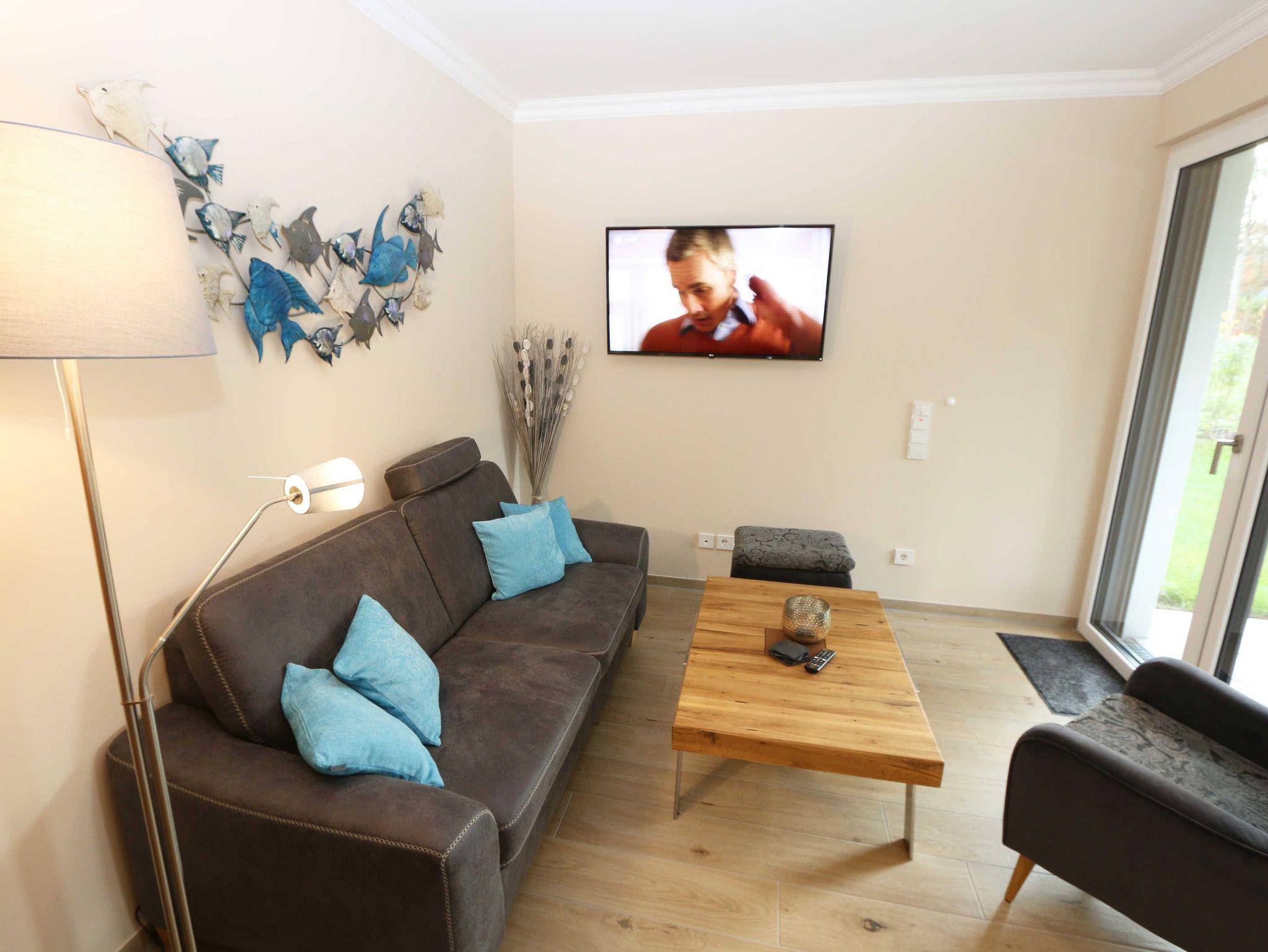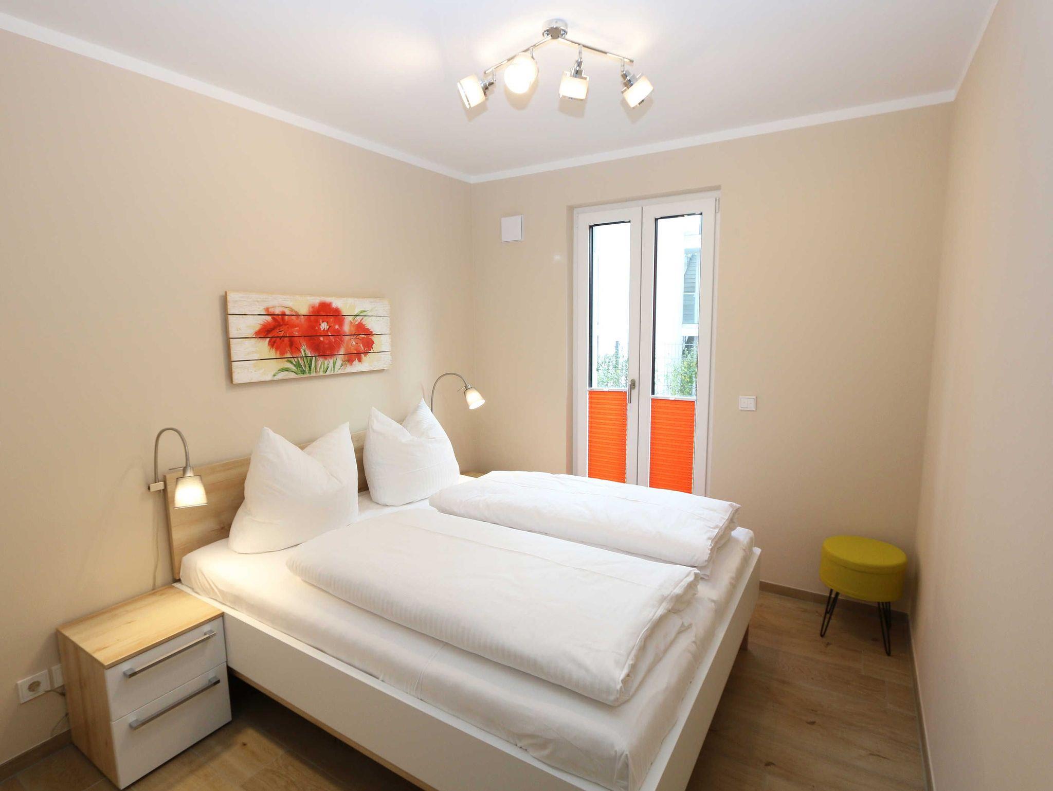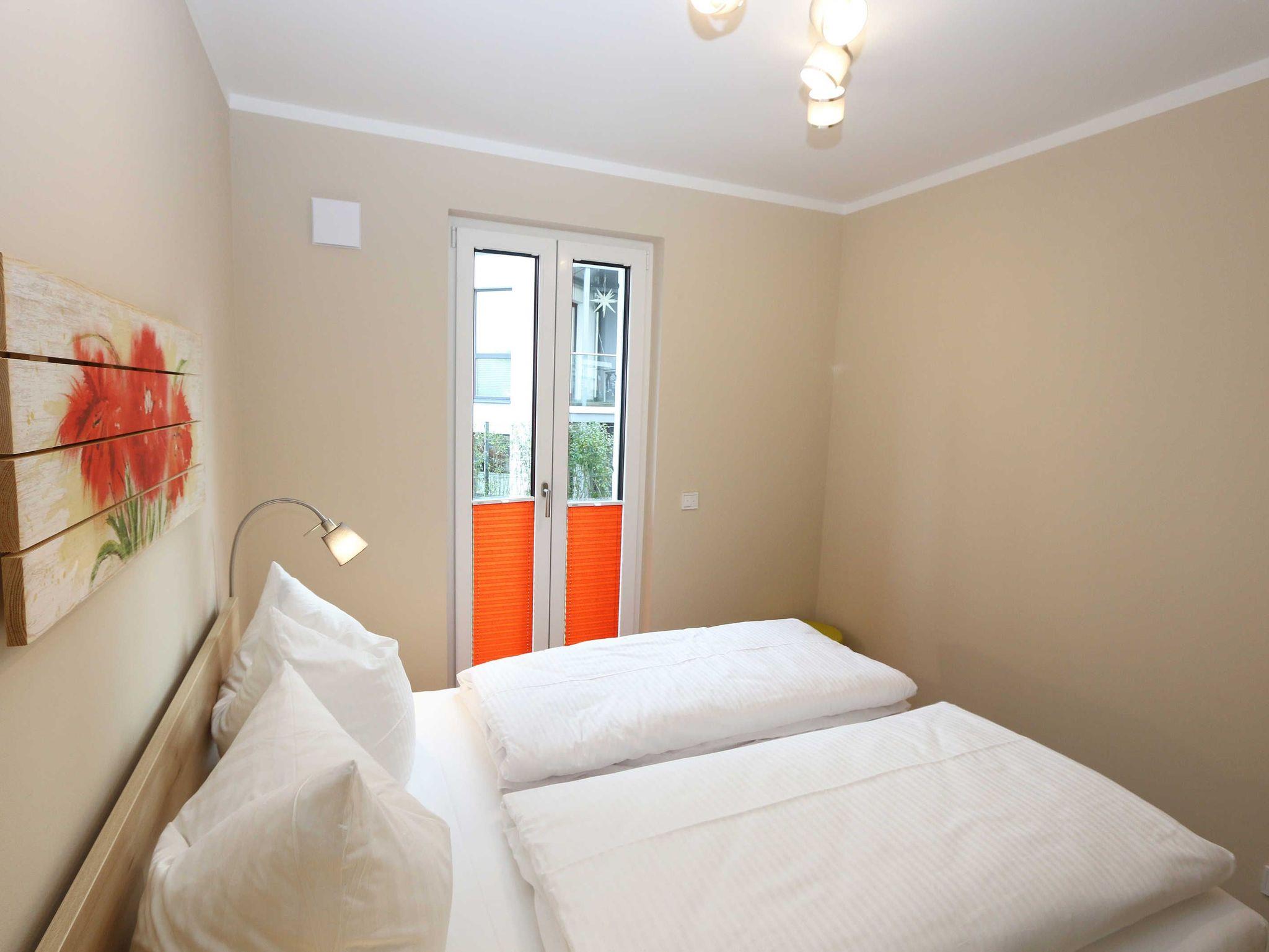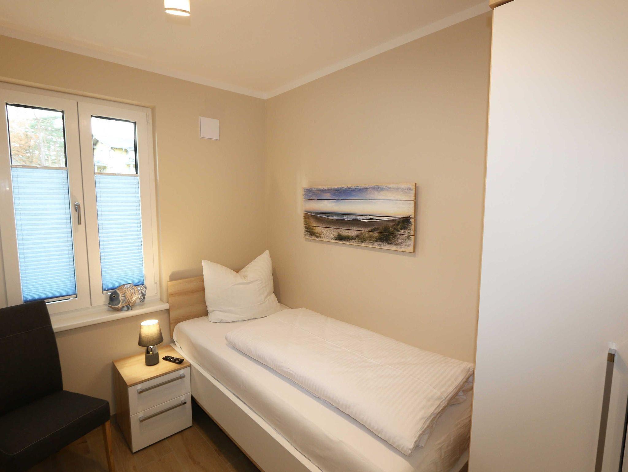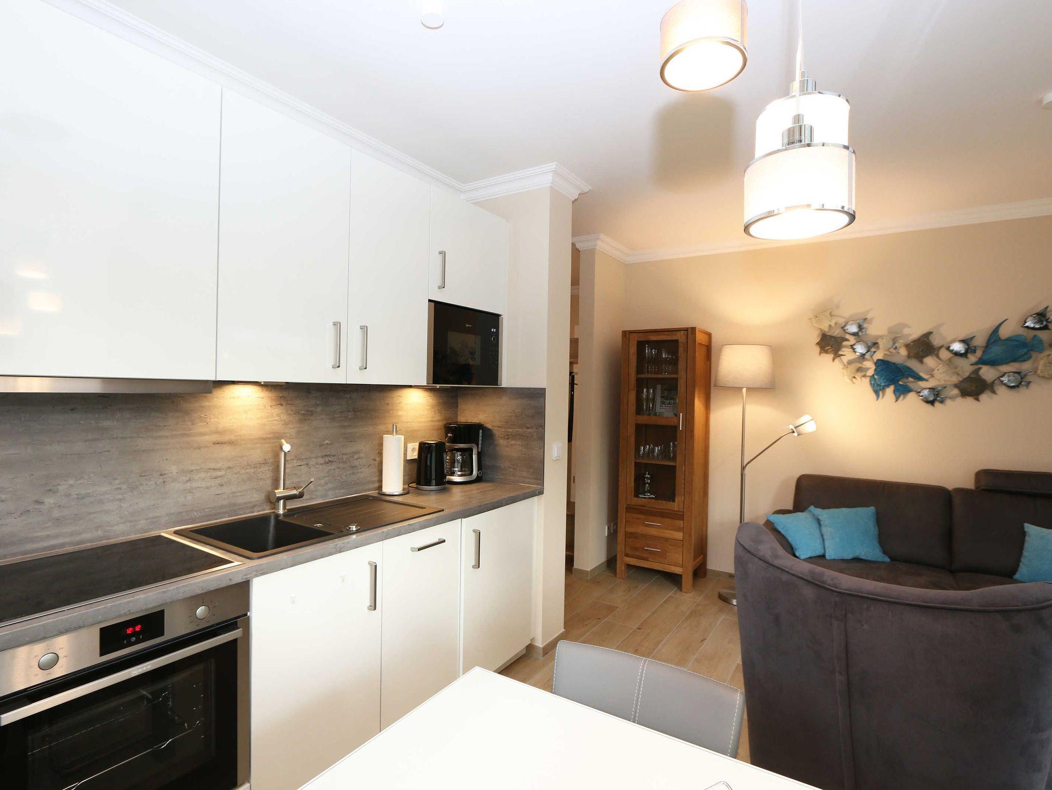 „Urlaubsträume am Meer für max. 3 Personen. Die Nichtraucherwohnung hat elektrische Rollläden, ist durchgehend gefliest und wird durch eine Fußbodenheizung versorgt. Im modern eingerichteten und lichtdurchfluteten Wohn-Essbereich finden Sie einen Esstisch mit bequemen Essstühlen, eine gemütliche Couch, einen Couchtisch sowie einen Ohrensesel mit Hocker, Leselampe und einer Vitrine. Die Wohnung verfügt über zwei Smart-TV´s, ein Radio mit CD-Player mit Bluetooth/USB Möglichkeit und einen Internetanschluss (WLAN). Dieser ist für Sie inclusive. Die angrenzende Küchenzeile ist mit einem Geschirrspüler, einer Mikrowelle, einem Backofen, einem Kühlschank mit integriertem Gefrierfach, einer Kaffeemaschine, eine Senseo Padmaschine, einem Toaster, einem Wasserkocher sowie diversen Küchenutensilien ausgestattet. Vom Wohnbereich aus gelangen Sie auf die Süd-Terrasse mit komfortabler Bestuhlung und Sonnenschirm sowie mit kleinem nutzbaren Gartenanteil mit ca. 70qm. Die Wohnung hat 2 Schlafzimmer, eines verfügt über ein Doppelbett (1,60 m x 2,00 m), 2 Nachttischablagen, eine Kleiderablage und einen Drehtürenschrank und eines mit einem Einzelbett (0,90 m x 2,00 m), Nachttischablage, Kleiderablage, Kleiderschrank und einen Smart-TV. Durch elektrische Rollläden und Insektenschutzgitter haben Sie eine angenehme Nachtruhe. Das Badezimmer ist mit einer ebenerdigen Regendusche, einem Waschtisch, einem WC, einem Fön, einen Kosmetikspiegel und einem Handtuchtrockner ausgestattet. Durch ein Gäste-WC mit Waschtisch wird der Sanitärbereich abgerundet. Im Flur gibt es eine Garderobe mit Spiegelfront und den wohnungsinternen Abstellraum, in dem sich Dinge wie Wäscheständer, Staubsauger und weitere Reinigungsutensilien befinden. Maximal 2 Haustiere sind gegen eine Gebühr willkommen. Im Untergeschoss des Hauses befindet sich ein Wellnessbereich mit einer Gemeinschaftssauna, ein Waschraum mit Waschmaschine und Trockner, die Sie gegen Gebühr nutzen können und auch bequem mit dem Fahrstuhl erreichen können. Ein eigener PKW-Stellplatz (Nr. 25/Urlaubsträume am Meer) befindet sich direkt am Haus. Ihre mitgebrachten Fahrräder können Sie am Haus abstellen. Die Erstausstattung eines Wäschepaketes (komplette Bettwäsche, 1 Duschhandtuch, 2 kleine Handtücher) können Sie bis 14 Tage vor Anreise dazu buchen oder durch eigene ergänzen. Ab 2 gebuchten Paketen erhalten Sie einmalig 1 Geschirrhandtuch und 1 Duschvorleger.