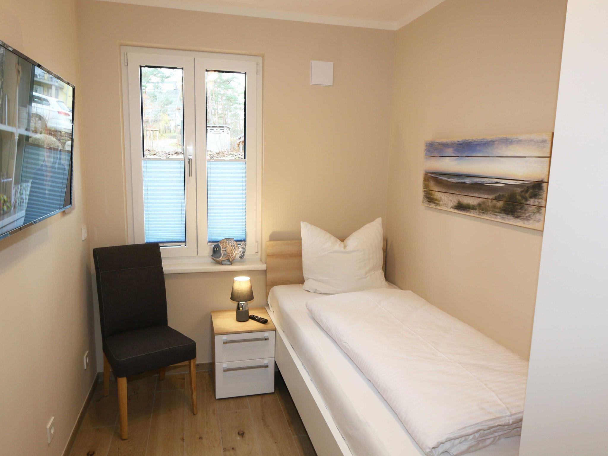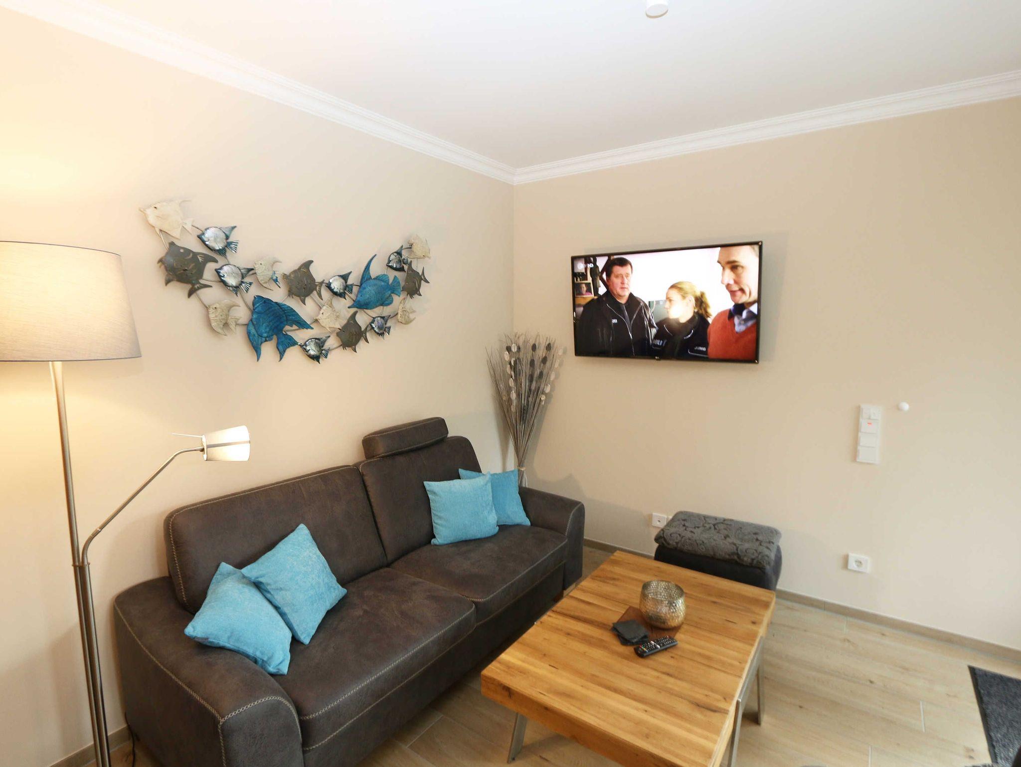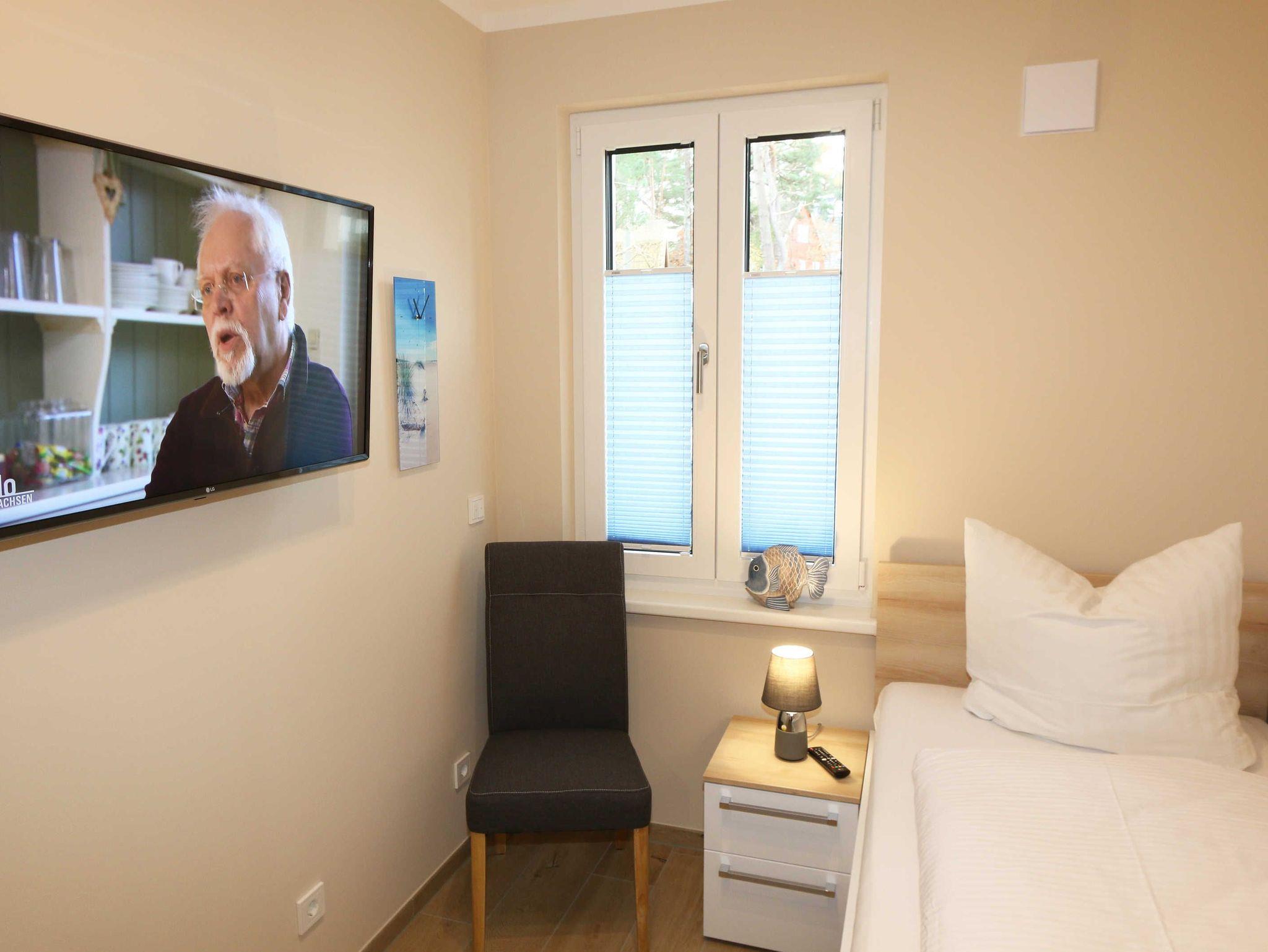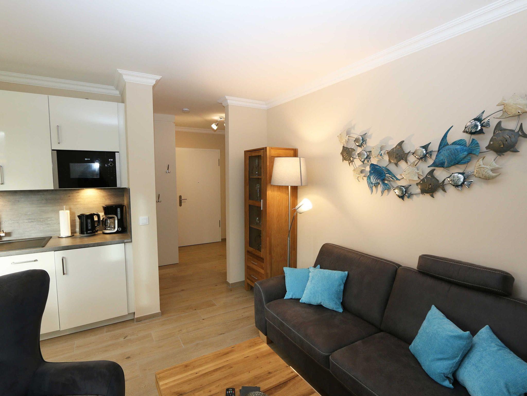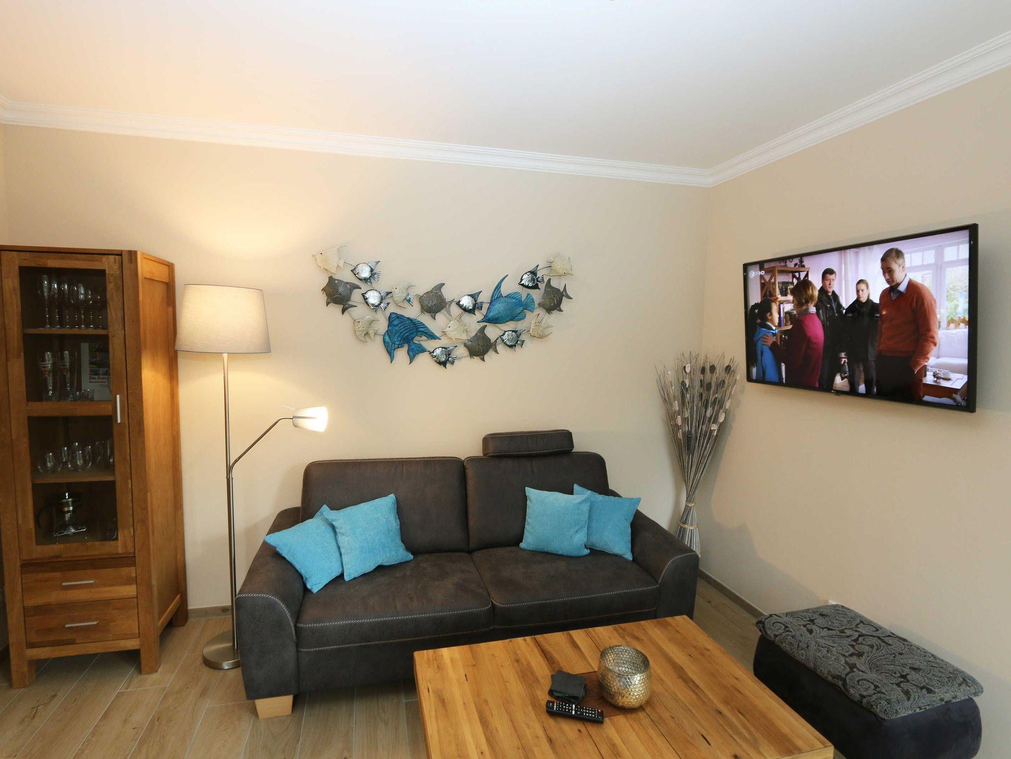 „Urlaubsträume am Meer für max. 3 Personen. Die Nichtraucherwohnung hat elektrische Rollläden, ist durchgehend gefliest und wird durch eine Fußbodenheizung versorgt. Im modern eingerichteten und lichtdurchfluteten Wohn-Essbereich finden Sie einen Esstisch mit bequemen Essstühlen, eine gemütliche Couch, einen Couchtisch sowie einen Ohrensesel mit Hocker, Leselampe und einer Vitrine. Die Wohnung verfügt über zwei Smart-TV´s, ein Radio mit CD-Player mit Bluetooth/USB Möglichkeit und einen Internetanschluss (WLAN). Dieser ist für Sie inclusive. Die angrenzende Küchenzeile ist mit einem Geschirrspüler, einer Mikrowelle, einem Backofen, einem Kühlschank mit integriertem Gefrierfach, einer Kaffeemaschine, eine Senseo Padmaschine, einem Toaster, einem Wasserkocher sowie diversen Küchenutensilien ausgestattet. Vom Wohnbereich aus gelangen Sie auf die Süd-Terrasse mit komfortabler Bestuhlung und Sonnenschirm sowie mit kleinem nutzbaren Gartenanteil mit ca. 70qm. Die Wohnung hat 2 Schlafzimmer, eines verfügt über ein Doppelbett (1,60 m x 2,00 m), 2 Nachttischablagen, eine Kleiderablage und einen Drehtürenschrank und eines mit einem Einzelbett (0,90 m x 2,00 m), Nachttischablage, Kleiderablage, Kleiderschrank und einen Smart-TV. Durch elektrische Rollläden und Insektenschutzgitter haben Sie eine angenehme Nachtruhe. Das Badezimmer ist mit einer ebenerdigen Regendusche, einem Waschtisch, einem WC, einem Fön, einen Kosmetikspiegel und einem Handtuchtrockner ausgestattet. Durch ein Gäste-WC mit Waschtisch wird der Sanitärbereich abgerundet. Im Flur gibt es eine Garderobe mit Spiegelfront und den wohnungsinternen Abstellraum, in dem sich Dinge wie Wäscheständer, Staubsauger und weitere Reinigungsutensilien befinden. Maximal 2 Haustiere sind gegen eine Gebühr willkommen. Im Untergeschoss des Hauses befindet sich ein Wellnessbereich mit einer Gemeinschaftssauna, ein Waschraum mit Waschmaschine und Trockner, die Sie gegen Gebühr nutzen können und auch bequem mit dem Fahrstuhl erreichen können. Ein eigener PKW-Stellplatz (Nr. 25/Urlaubsträume am Meer) befindet sich direkt am Haus. Ihre mitgebrachten Fahrräder können Sie am Haus abstellen. Die Erstausstattung eines Wäschepaketes (komplette Bettwäsche, 1 Duschhandtuch, 2 kleine Handtücher) können Sie bis 14 Tage vor Anreise dazu buchen oder durch eigene ergänzen. Ab 2 gebuchten Paketen erhalten Sie einmalig 1 Geschirrhandtuch und 1 Duschvorleger.