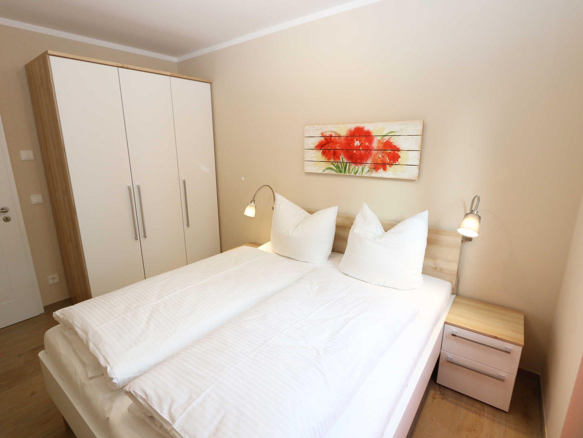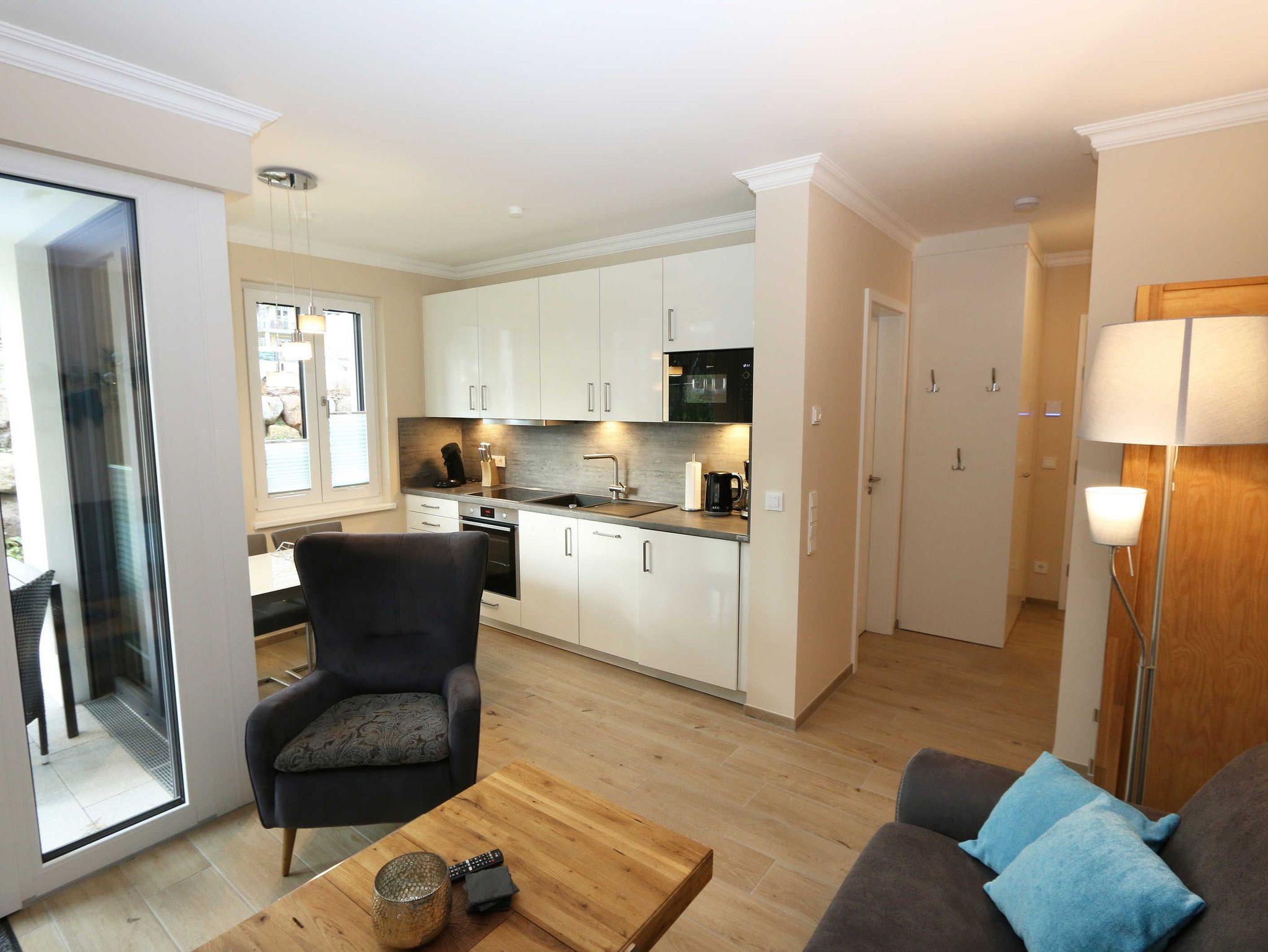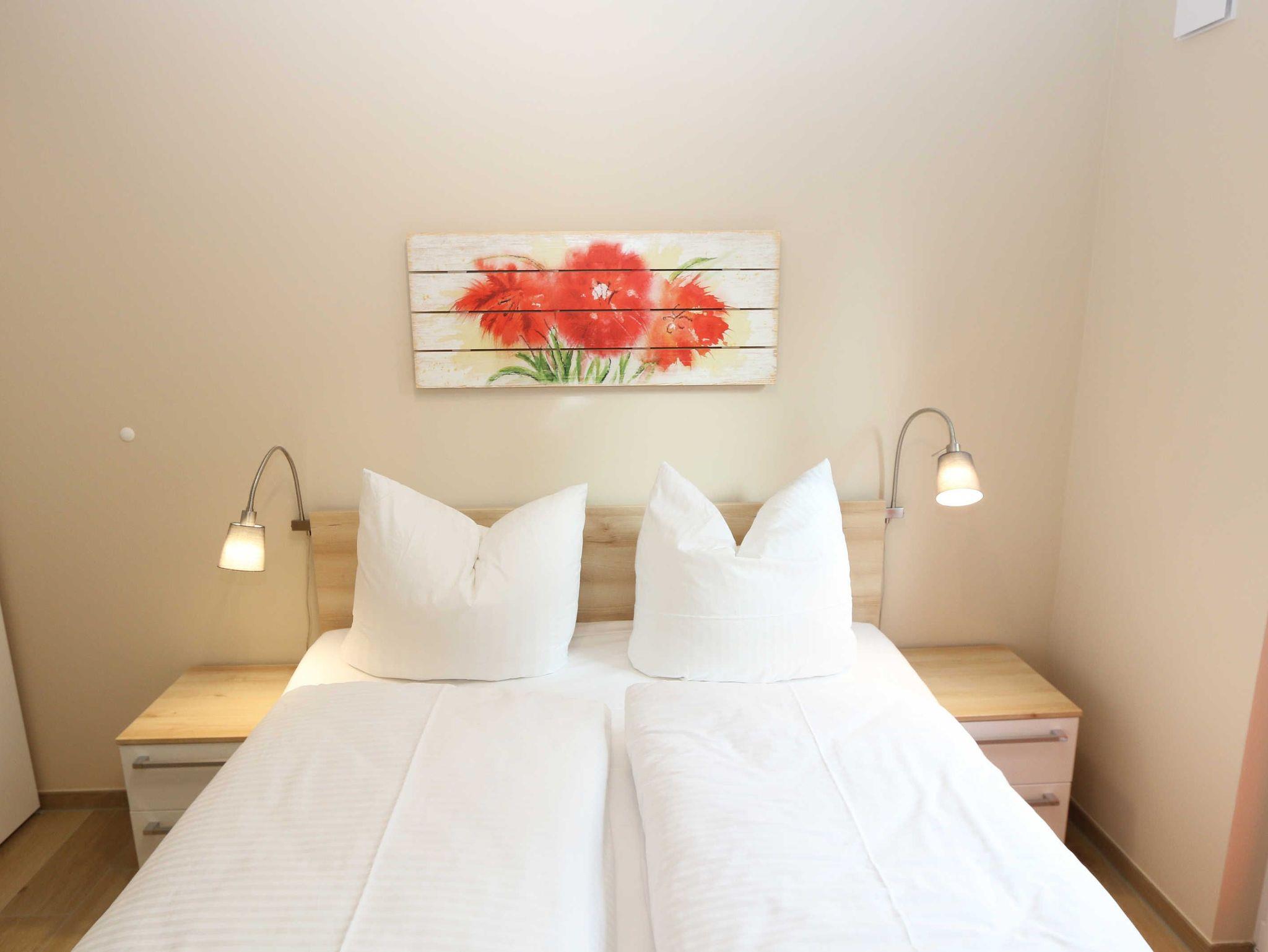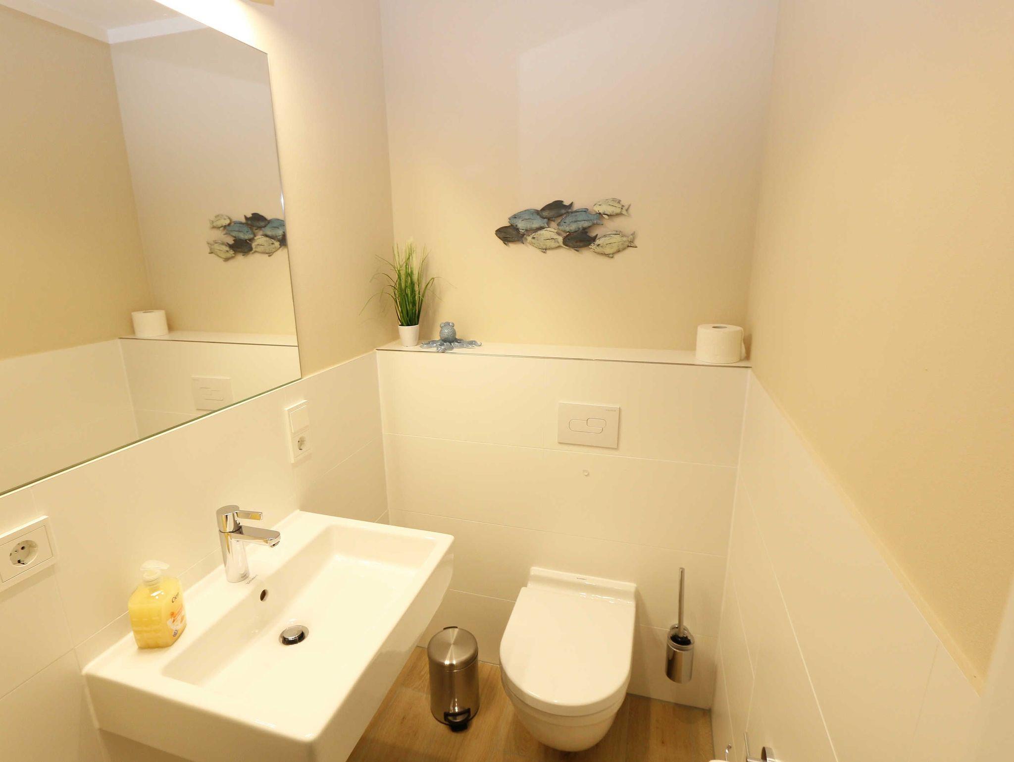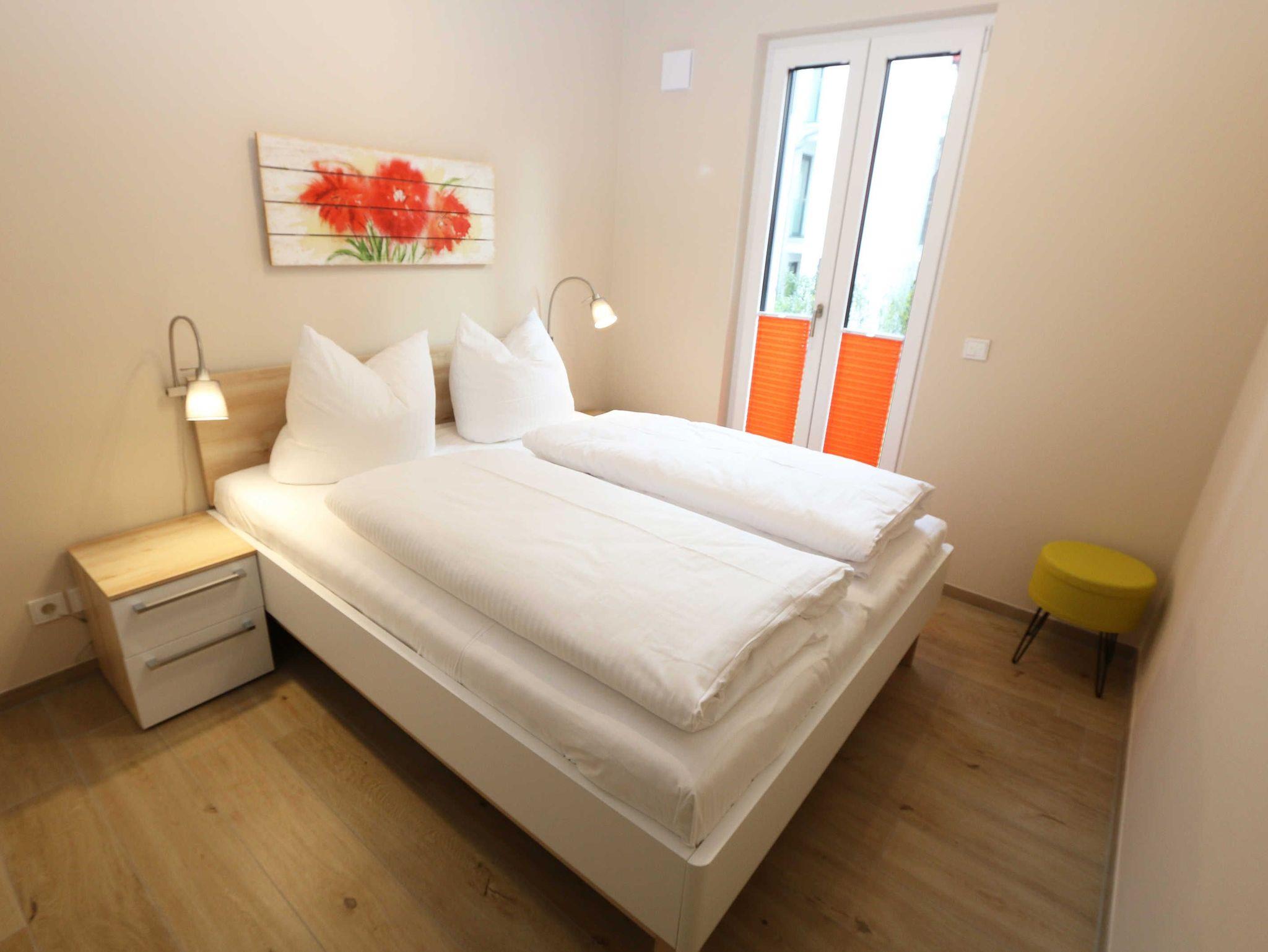 „Urlaubsträume am Meer für max. 3 Personen. Die Nichtraucherwohnung hat elektrische Rollläden, ist durchgehend gefliest und wird durch eine Fußbodenheizung versorgt. Im modern eingerichteten und lichtdurchfluteten Wohn-Essbereich finden Sie einen Esstisch mit bequemen Essstühlen, eine gemütliche Couch, einen Couchtisch sowie einen Ohrensesel mit Hocker, Leselampe und einer Vitrine. Die Wohnung verfügt über zwei Smart-TV´s, ein Radio mit CD-Player mit Bluetooth/USB Möglichkeit und einen Internetanschluss (WLAN). Dieser ist für Sie inclusive. Die angrenzende Küchenzeile ist mit einem Geschirrspüler, einer Mikrowelle, einem Backofen, einem Kühlschank mit integriertem Gefrierfach, einer Kaffeemaschine, eine Senseo Padmaschine, einem Toaster, einem Wasserkocher sowie diversen Küchenutensilien ausgestattet. Vom Wohnbereich aus gelangen Sie auf die Süd-Terrasse mit komfortabler Bestuhlung und Sonnenschirm sowie mit kleinem nutzbaren Gartenanteil mit ca. 70qm. Die Wohnung hat 2 Schlafzimmer, eines verfügt über ein Doppelbett (1,60 m x 2,00 m), 2 Nachttischablagen, eine Kleiderablage und einen Drehtürenschrank und eines mit einem Einzelbett (0,90 m x 2,00 m), Nachttischablage, Kleiderablage, Kleiderschrank und einen Smart-TV. Durch elektrische Rollläden und Insektenschutzgitter haben Sie eine angenehme Nachtruhe. Das Badezimmer ist mit einer ebenerdigen Regendusche, einem Waschtisch, einem WC, einem Fön, einen Kosmetikspiegel und einem Handtuchtrockner ausgestattet. Durch ein Gäste-WC mit Waschtisch wird der Sanitärbereich abgerundet. Im Flur gibt es eine Garderobe mit Spiegelfront und den wohnungsinternen Abstellraum, in dem sich Dinge wie Wäscheständer, Staubsauger und weitere Reinigungsutensilien befinden. Maximal 2 Haustiere sind gegen eine Gebühr willkommen. Im Untergeschoss des Hauses befindet sich ein Wellnessbereich mit einer Gemeinschaftssauna, ein Waschraum mit Waschmaschine und Trockner, die Sie gegen Gebühr nutzen können und auch bequem mit dem Fahrstuhl erreichen können. Ein eigener PKW-Stellplatz (Nr. 25/Urlaubsträume am Meer) befindet sich direkt am Haus. Ihre mitgebrachten Fahrräder können Sie am Haus abstellen. Die Erstausstattung eines Wäschepaketes (komplette Bettwäsche, 1 Duschhandtuch, 2 kleine Handtücher) können Sie bis 14 Tage vor Anreise dazu buchen oder durch eigene ergänzen. Ab 2 gebuchten Paketen erhalten Sie einmalig 1 Geschirrhandtuch und 1 Duschvorleger.