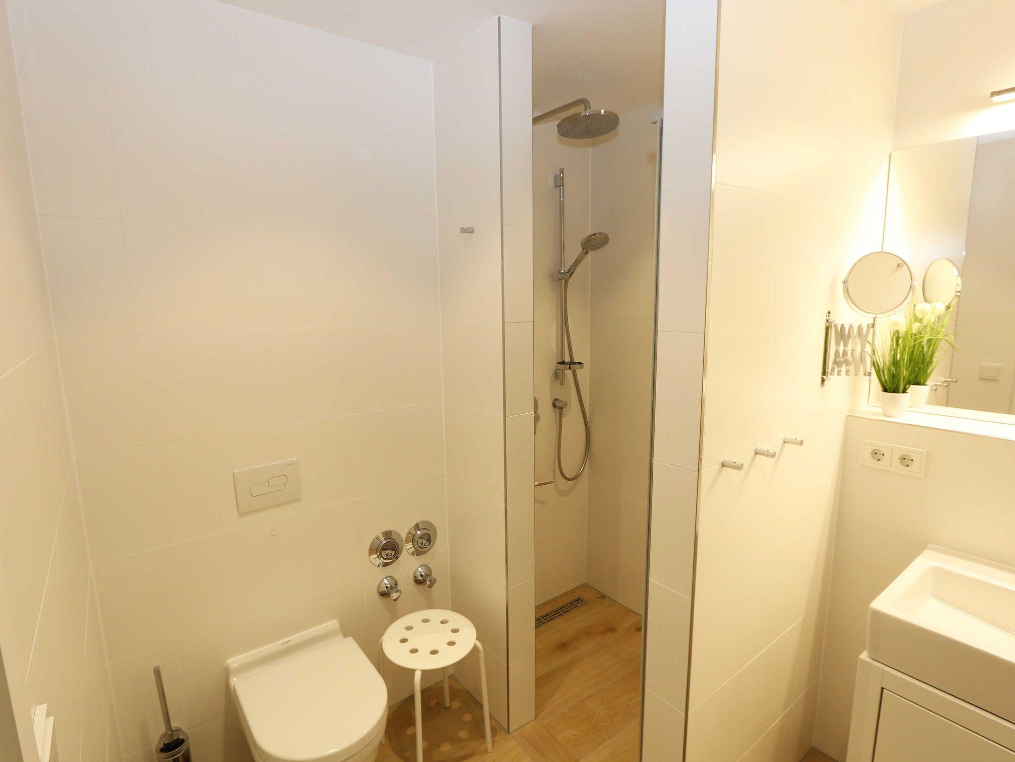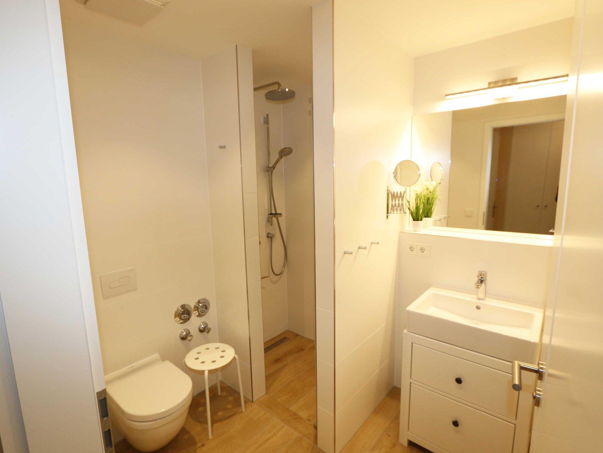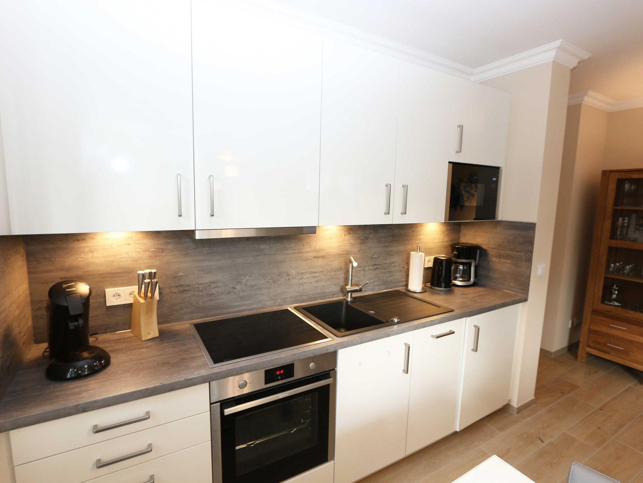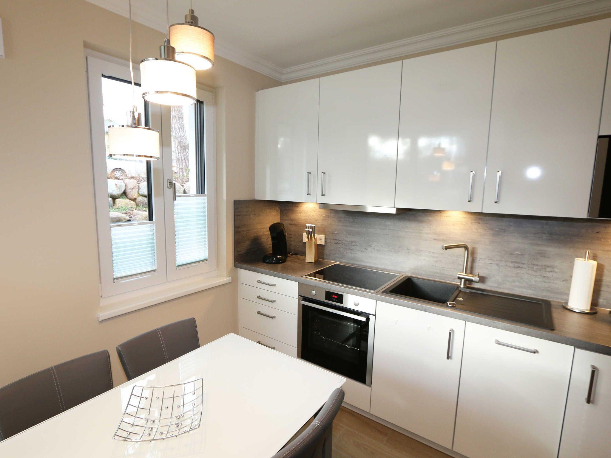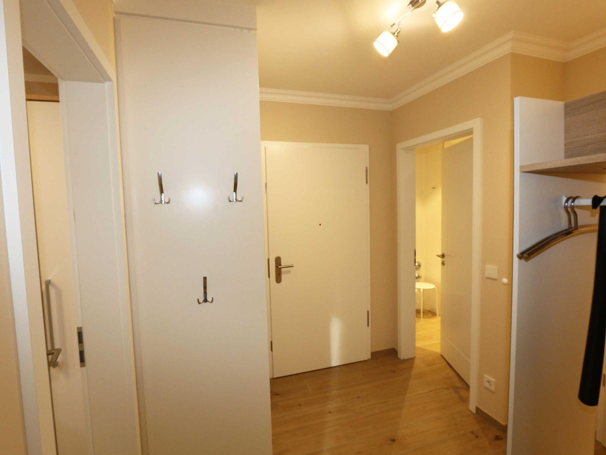 „Urlaubsträume am Meer für max. 3 Personen. Die Nichtraucherwohnung hat elektrische Rollläden, ist durchgehend gefliest und wird durch eine Fußbodenheizung versorgt. Im modern eingerichteten und lichtdurchfluteten Wohn-Essbereich finden Sie einen Esstisch mit bequemen Essstühlen, eine gemütliche Couch, einen Couchtisch sowie einen Ohrensesel mit Hocker, Leselampe und einer Vitrine. Die Wohnung verfügt über zwei Smart-TV´s, ein Radio mit CD-Player mit Bluetooth/USB Möglichkeit und einen Internetanschluss (WLAN). Dieser ist für Sie inclusive. Die angrenzende Küchenzeile ist mit einem Geschirrspüler, einer Mikrowelle, einem Backofen, einem Kühlschank mit integriertem Gefrierfach, einer Kaffeemaschine, eine Senseo Padmaschine, einem Toaster, einem Wasserkocher sowie diversen Küchenutensilien ausgestattet. Vom Wohnbereich aus gelangen Sie auf die Süd-Terrasse mit komfortabler Bestuhlung und Sonnenschirm sowie mit kleinem nutzbaren Gartenanteil mit ca. 70qm. Die Wohnung hat 2 Schlafzimmer, eines verfügt über ein Doppelbett (1,60 m x 2,00 m), 2 Nachttischablagen, eine Kleiderablage und einen Drehtürenschrank und eines mit einem Einzelbett (0,90 m x 2,00 m), Nachttischablage, Kleiderablage, Kleiderschrank und einen Smart-TV. Durch elektrische Rollläden und Insektenschutzgitter haben Sie eine angenehme Nachtruhe. Das Badezimmer ist mit einer ebenerdigen Regendusche, einem Waschtisch, einem WC, einem Fön, einen Kosmetikspiegel und einem Handtuchtrockner ausgestattet. Durch ein Gäste-WC mit Waschtisch wird der Sanitärbereich abgerundet. Im Flur gibt es eine Garderobe mit Spiegelfront und den wohnungsinternen Abstellraum, in dem sich Dinge wie Wäscheständer, Staubsauger und weitere Reinigungsutensilien befinden. Maximal 2 Haustiere sind gegen eine Gebühr willkommen. Im Untergeschoss des Hauses befindet sich ein Wellnessbereich mit einer Gemeinschaftssauna, ein Waschraum mit Waschmaschine und Trockner, die Sie gegen Gebühr nutzen können und auch bequem mit dem Fahrstuhl erreichen können. Ein eigener PKW-Stellplatz (Nr. 25/Urlaubsträume am Meer) befindet sich direkt am Haus. Ihre mitgebrachten Fahrräder können Sie am Haus abstellen. Die Erstausstattung eines Wäschepaketes (komplette Bettwäsche, 1 Duschhandtuch, 2 kleine Handtücher) können Sie bis 14 Tage vor Anreise dazu buchen oder durch eigene ergänzen. Ab 2 gebuchten Paketen erhalten Sie einmalig 1 Geschirrhandtuch und 1 Duschvorleger.