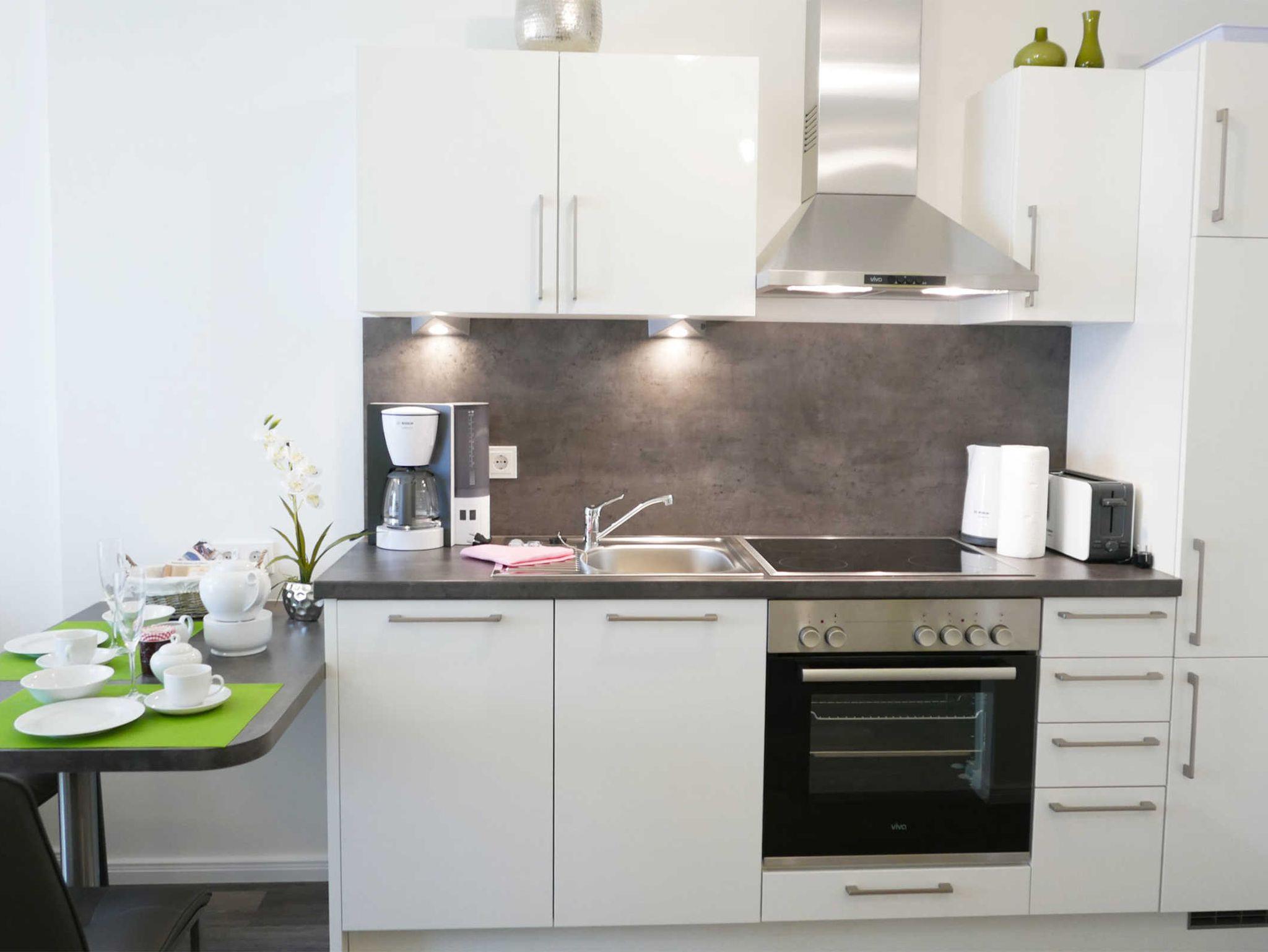 Der Wohn-/Essbereich verfügt über eine moderne Küchenzeile, einem Essplatz sowie einem gemütlichen Sofabereich und Zugang zu der Terrasse. Zwei Flachbildfernseher sind ebenfalls vorhanden. Grüne Farbakzente sorgen für eine freundliche Atmosphäre. Genießen sie den Blick ins Freie von der schönen kleinen Terrasse.