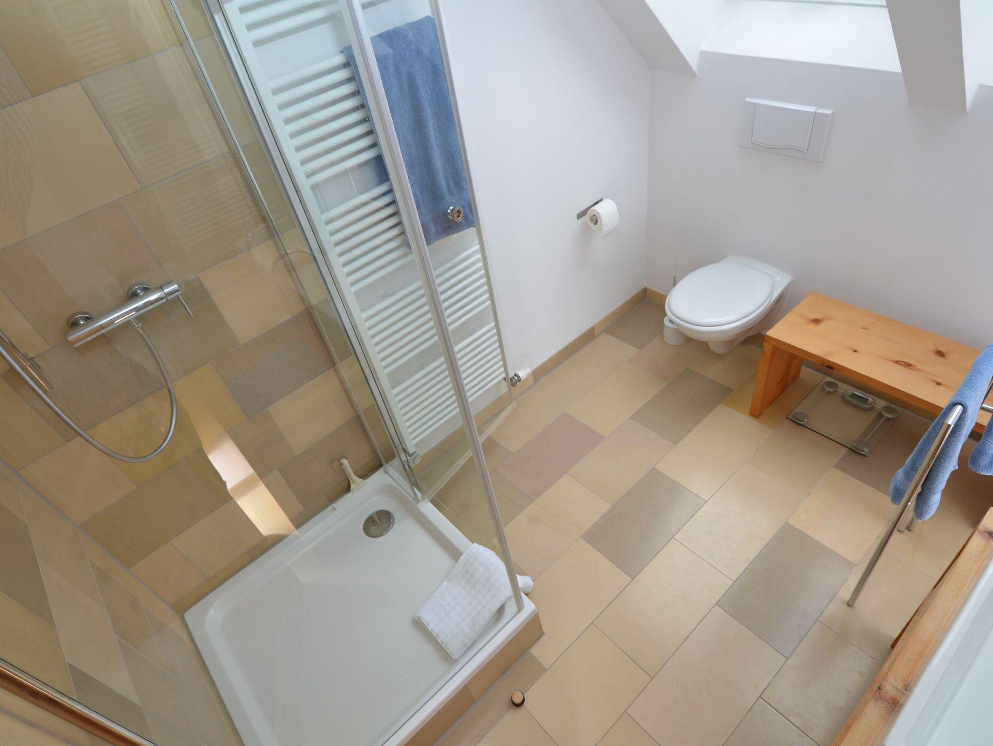 Ebenfalls im Obergeschoss befindet sich das schöne Natursteinbad mit Holzwaschtisch, einer Klarglasdusche und viel Platz für Ihre Utensilien. Durch die obergroßen Schrägfenster hat man einen romantischen Blick in die Bäume.