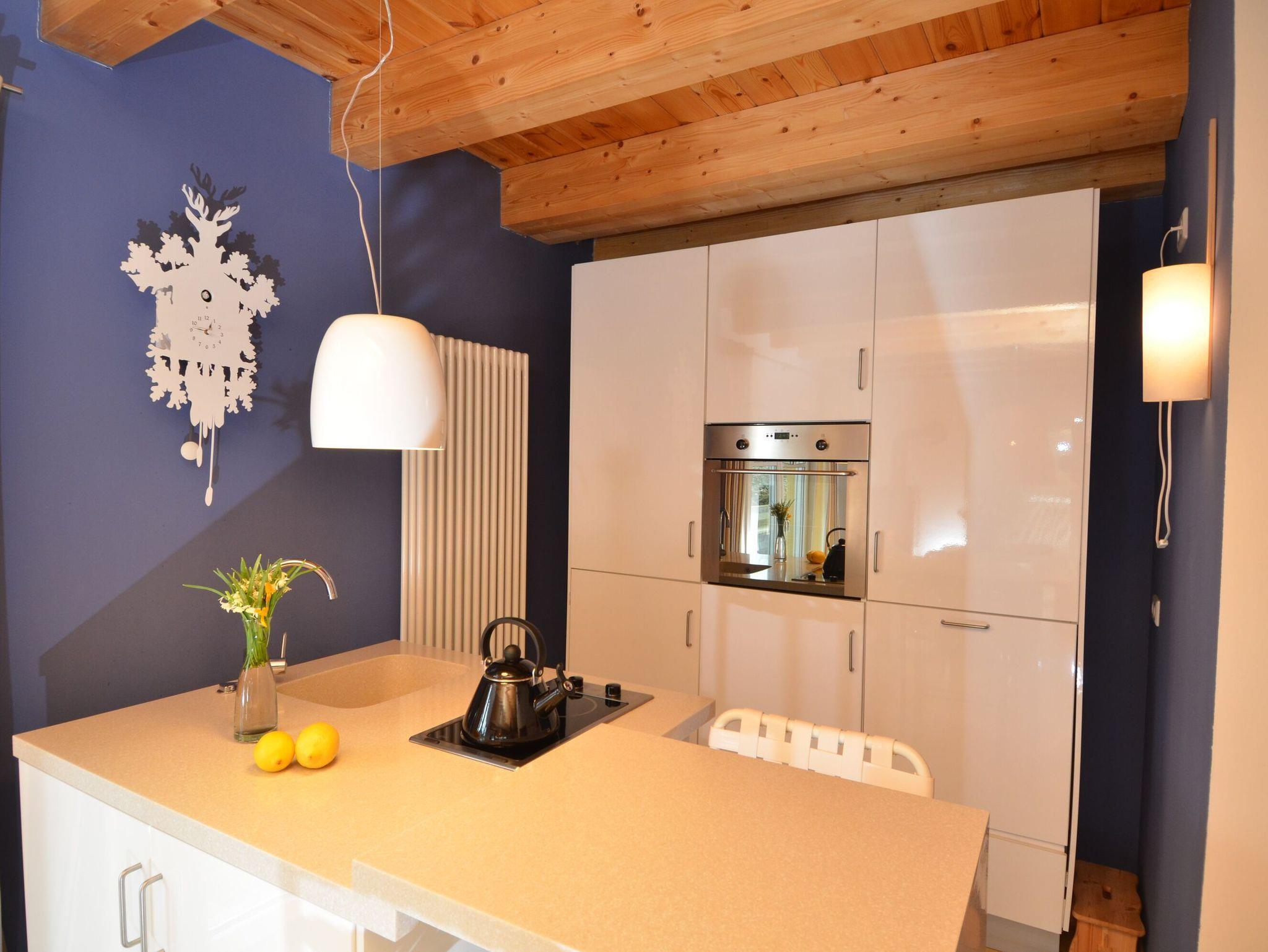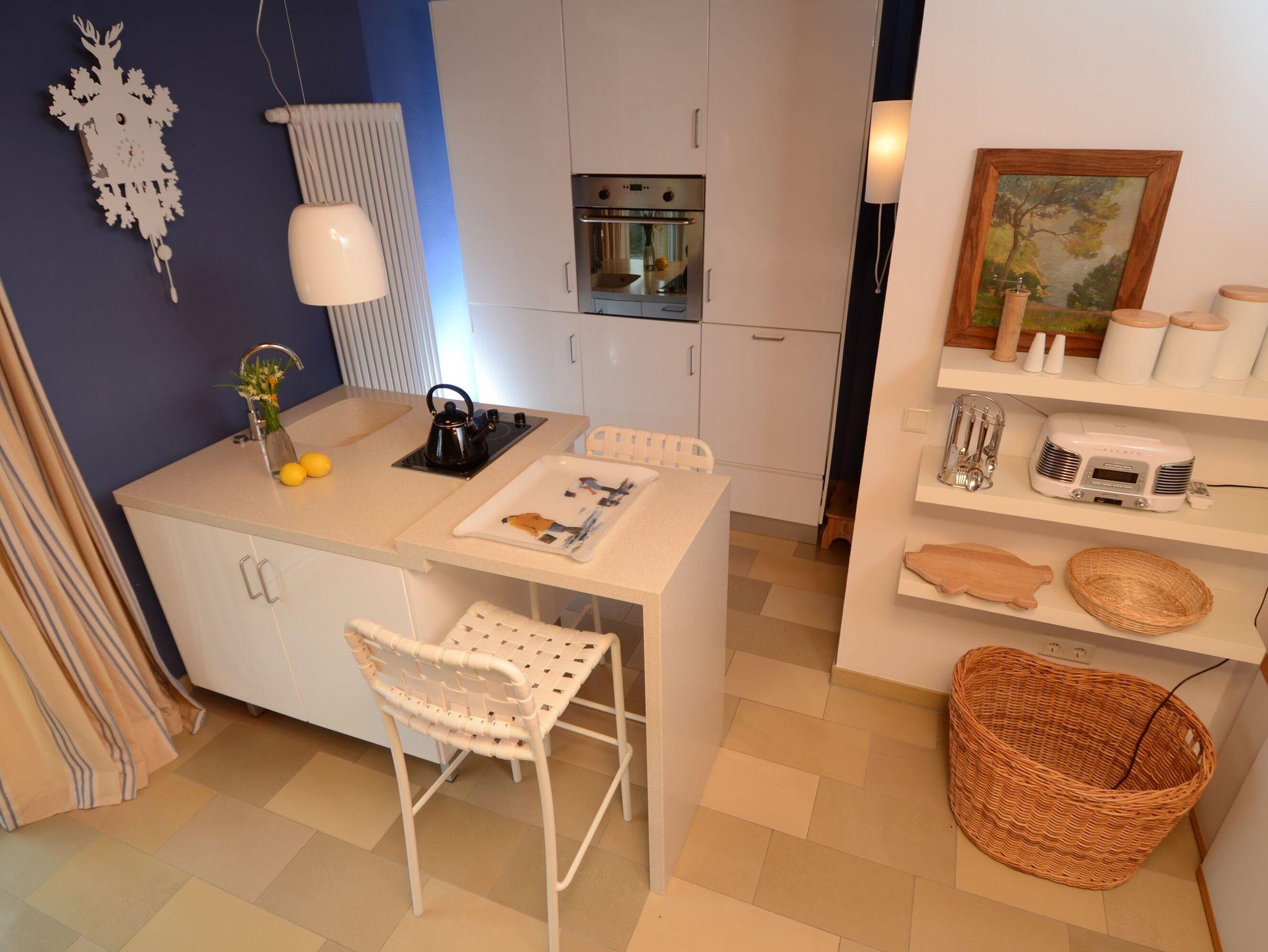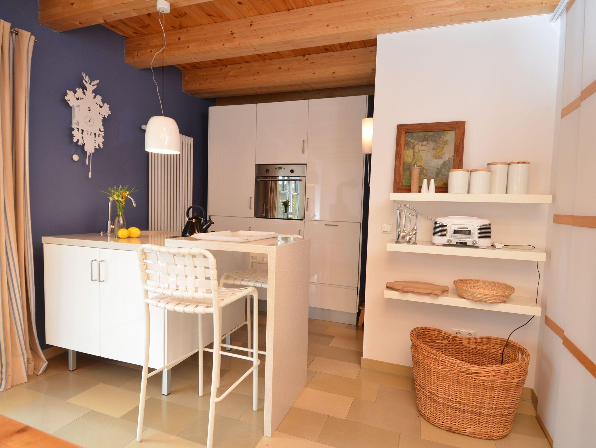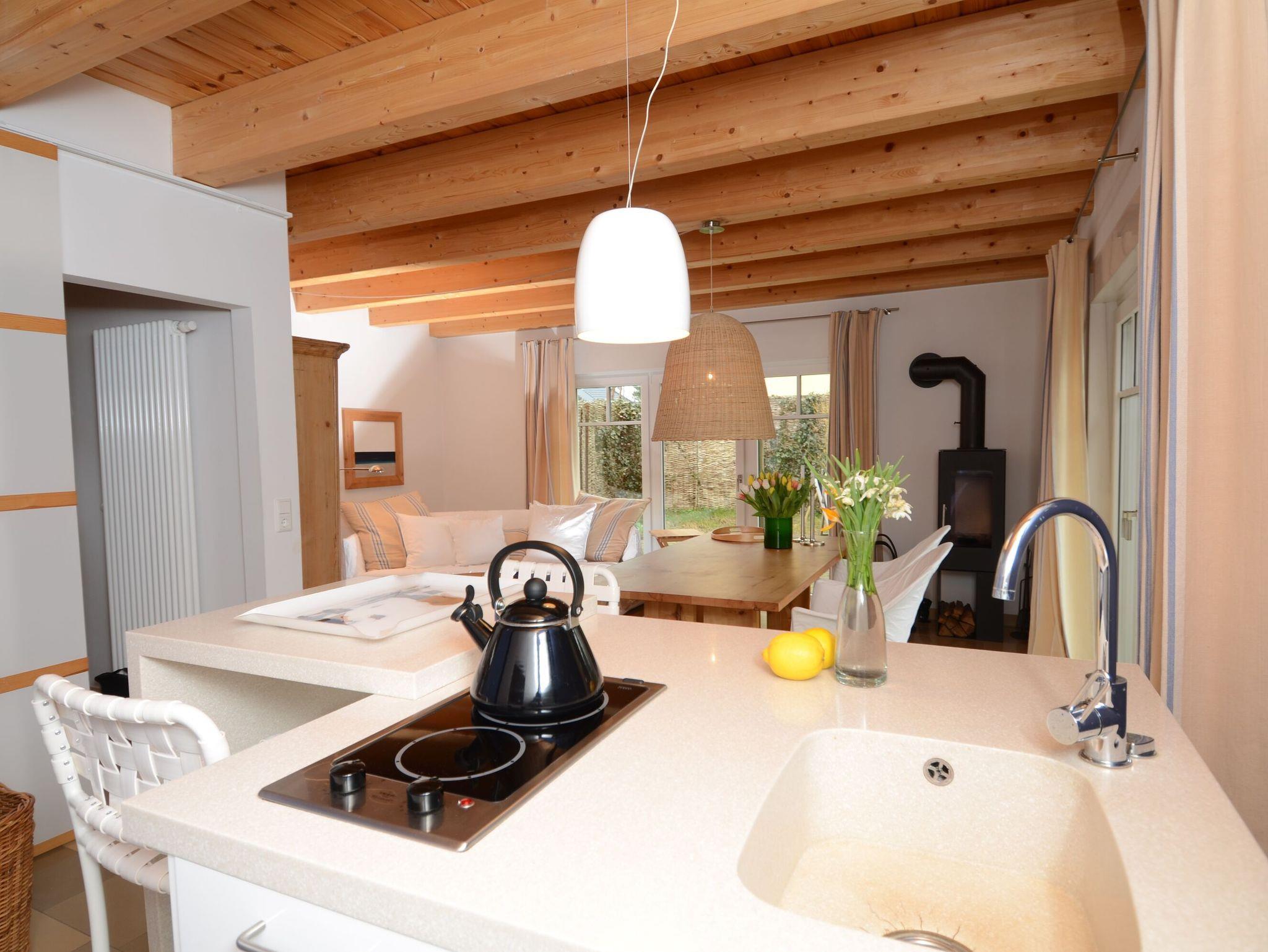 Von der offenen Diele mit Garderobenschrank aus betreten Sie den Wohnbereich mit Holzbalkendecke und einer modernen Küche mit freistehender Kücheninsel und kleiner Bartheke. Hier ist alles - vom Backofen in Komforthöhe, einem Zweiplattenkochfeld, einem Kühlschrank mit Gefrierfach, einer Kaffeemaschine, Toaster, einem Geschirrspüler, einer Waschmaschine mit Trocknerfunktion und natürlich komplettem Geschirr mit den nötigen Küchenutensilien - vorhanden.