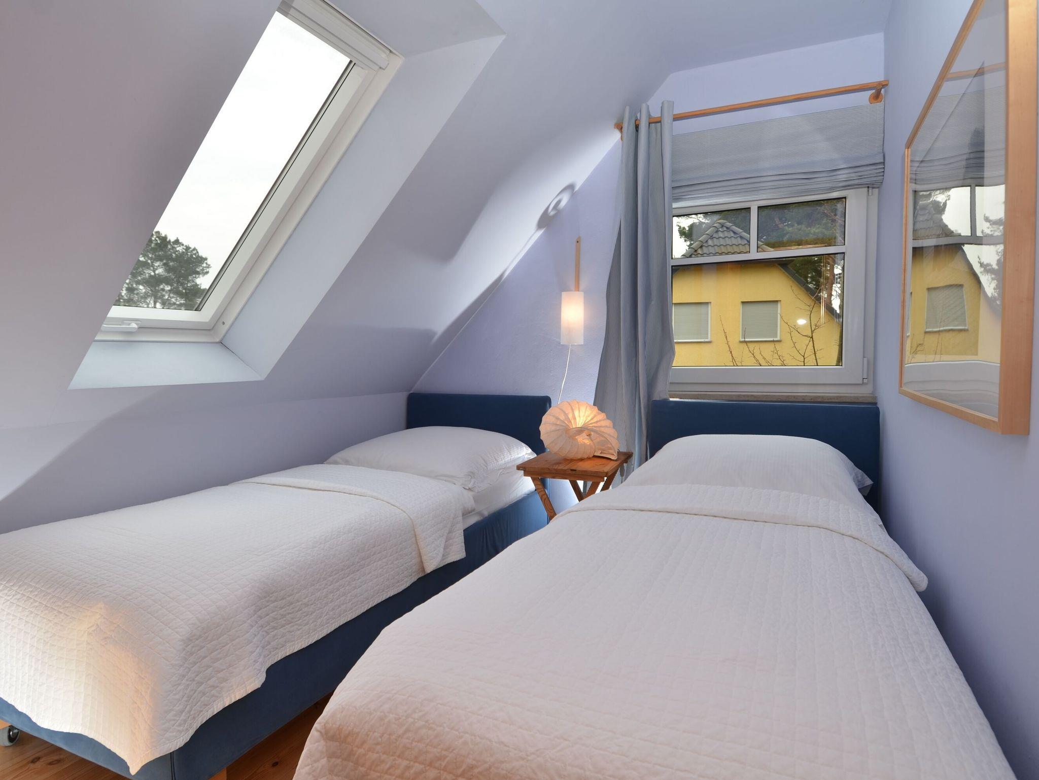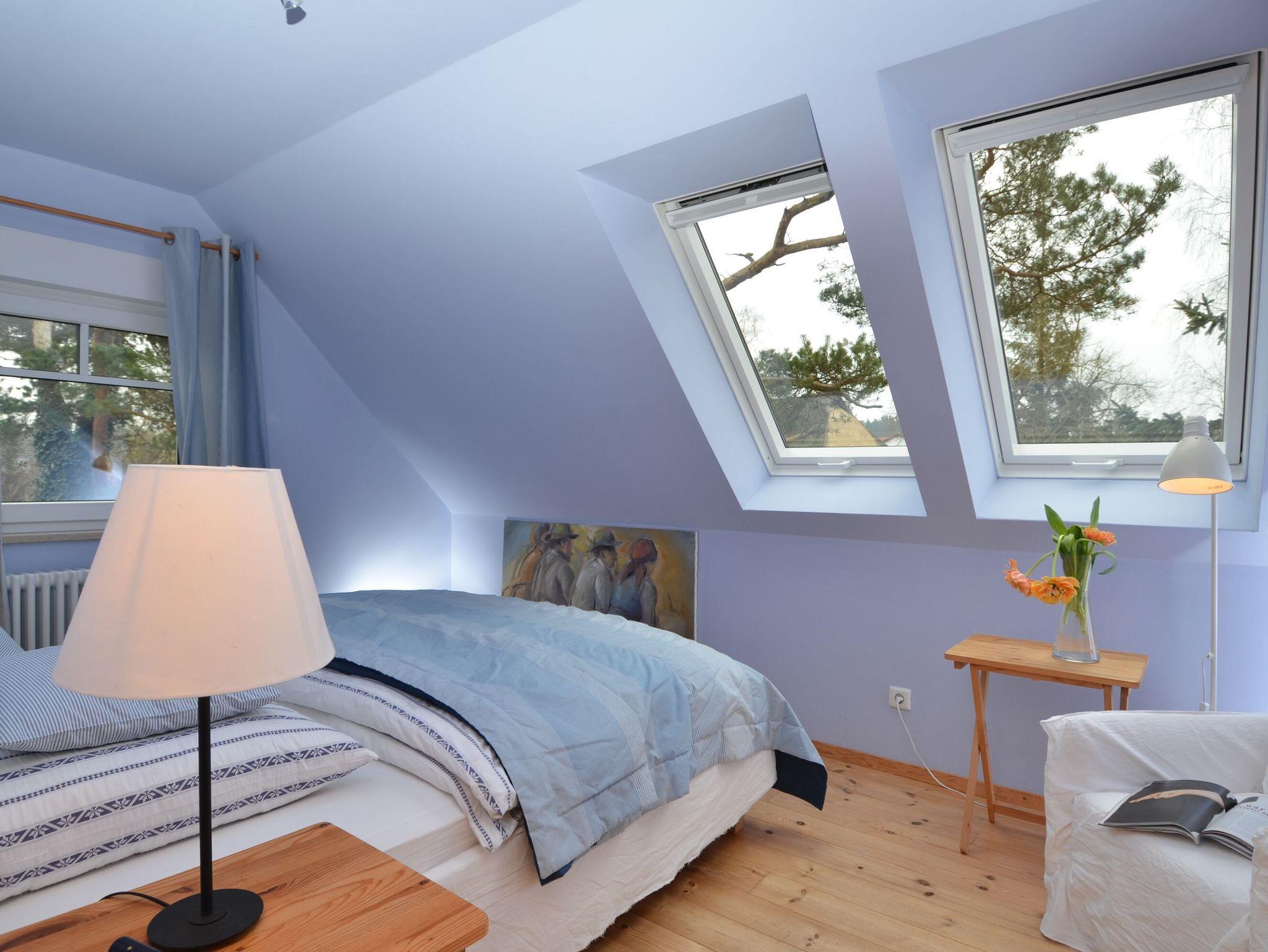 Im oberen Geschoss mit lauschigen Dachschrägen und Holzfußboden gibt es ein großes Schlafzimmer mit einem Doppelbett Größe 1,90 x 2,00 Meter , Sessel und Kleiderschrank sowie ein kleineres Schlafzimmer mit zwei auseinander stehenden Einzelbetten und einem kleinen Einbauschrank.