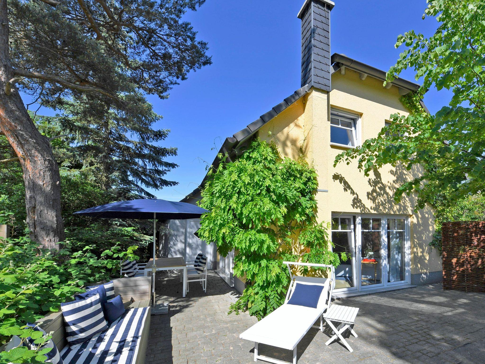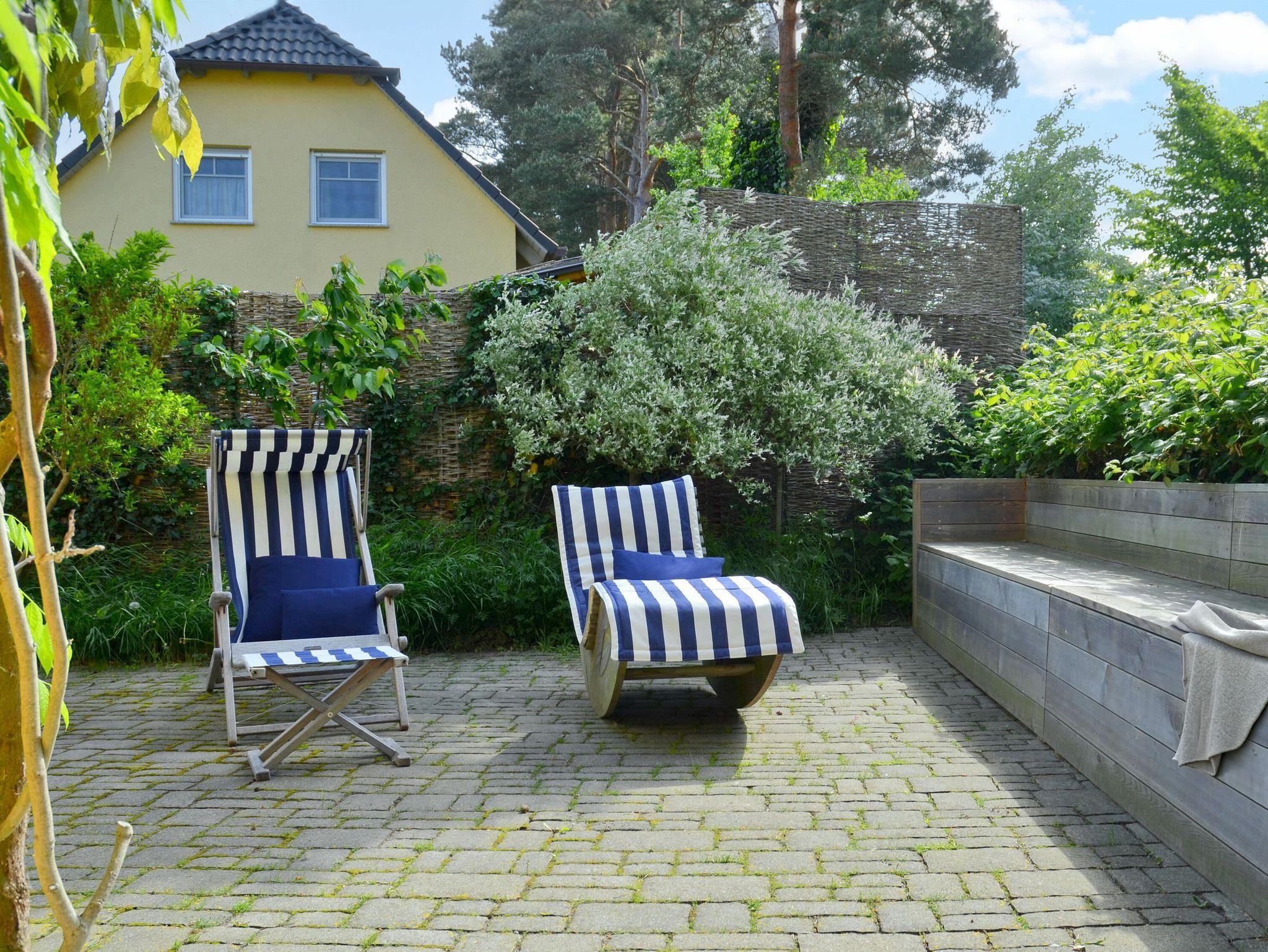 Zwei große bodentiefe Terrassenfenster führen hinaus in den kleinen Garten mit zwei sonnigen Terrassen, Gartenmöbeln und Liegen.