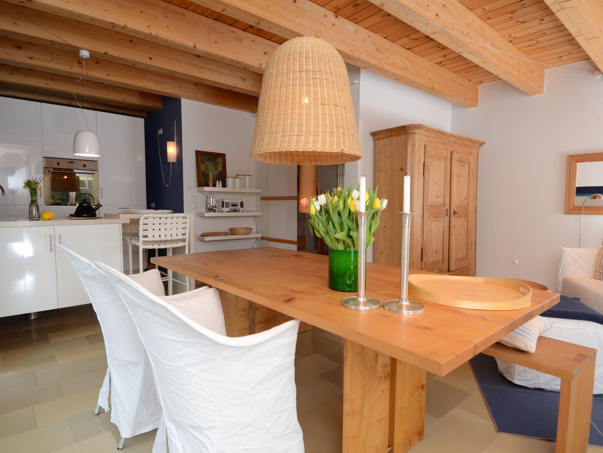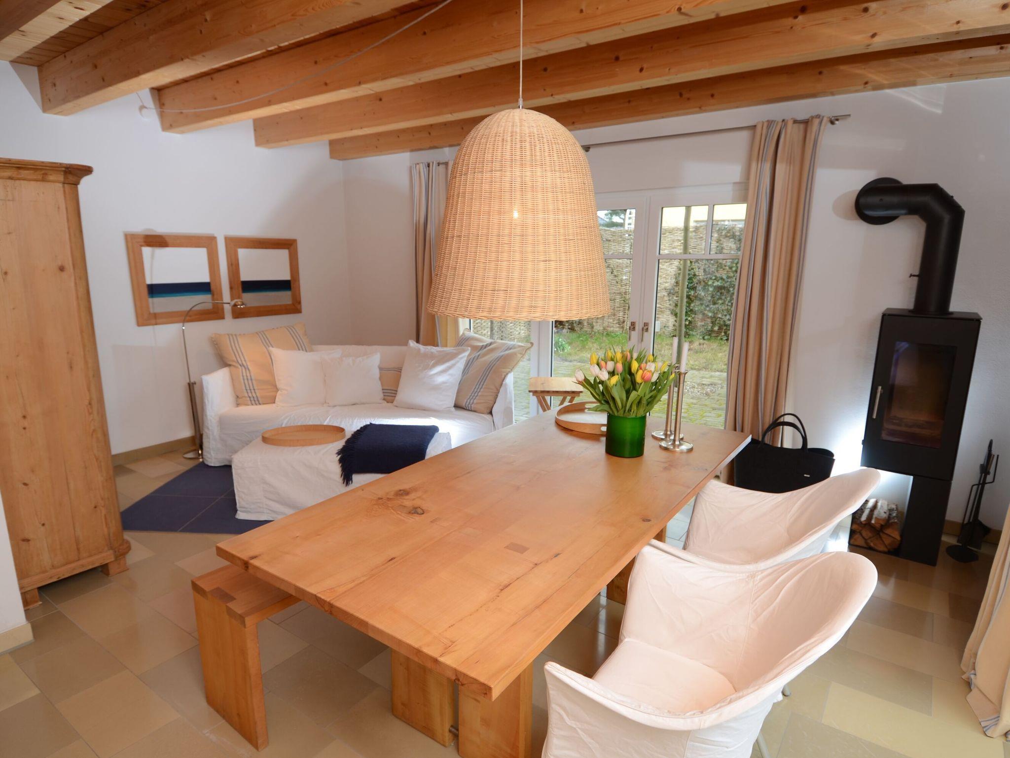 Ein großer Holzesstisch mit bequemen Stühlen, passender Bank und lichtverzaubernder Korbleuchte lädt zu fröhlichen Mahlzeiten ein. Ein Radio mit CD-Player, MP3-Wiedergabe und USB-Anschluß ist vorhanden.