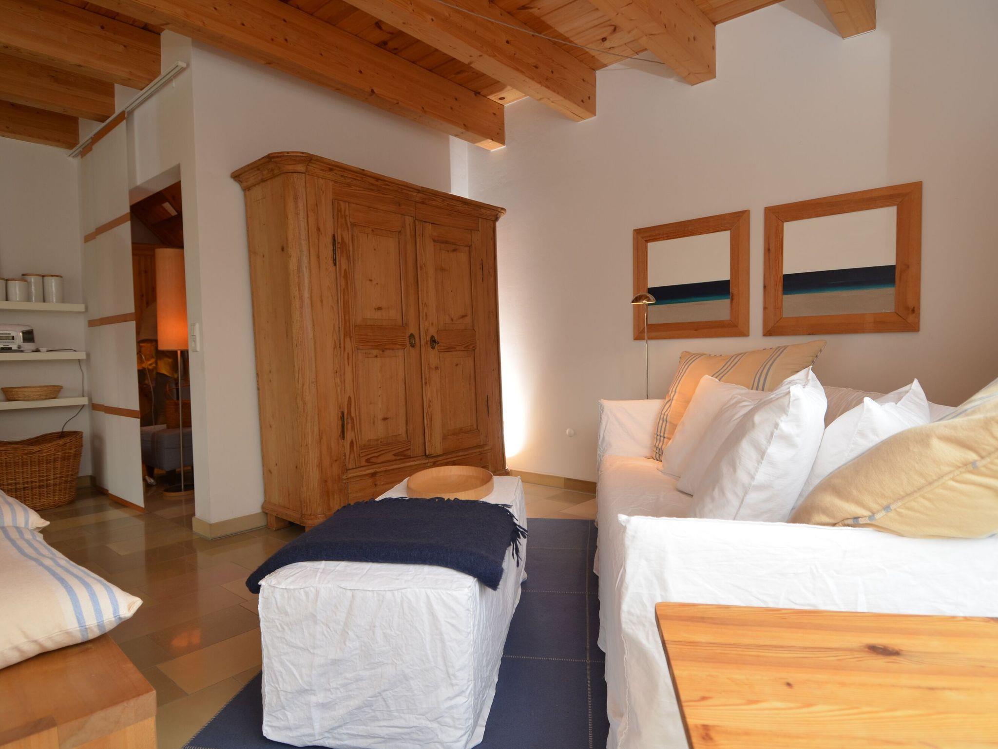 Der kleine Flachbildfernseher ist im dekorativen, antiken Fichtenholzbauernschrank verborgen. Ein bequemes, großes Sofa mit Hockerbank lädt zum Kuscheln und Chillen ein. Der Kaminofen sorgt für wohltuende Wärme, ganz besonders natürlich, wenn es draußen stürmt.