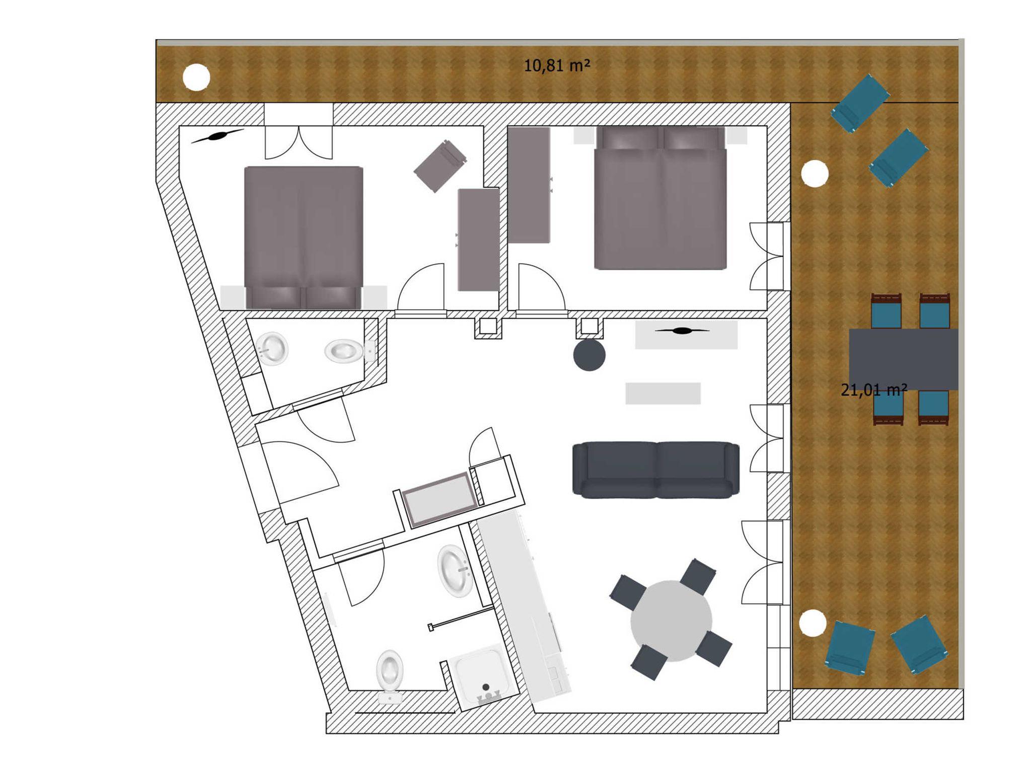 Beide Schlafzimmer sind mit einem Doppelbett ausgestattet; eines mit den Maßen 180 x 200 cm, das andere mit den Maßen 160 x 200 cm. Auch können Gäste sich über Kleiderschränke mit bodentiefen Spiegelfronten freuen. In einem der Schlafzimmer befindet sich zudem ein Schaukelstuhl sowie ein weiterer Fernseher.