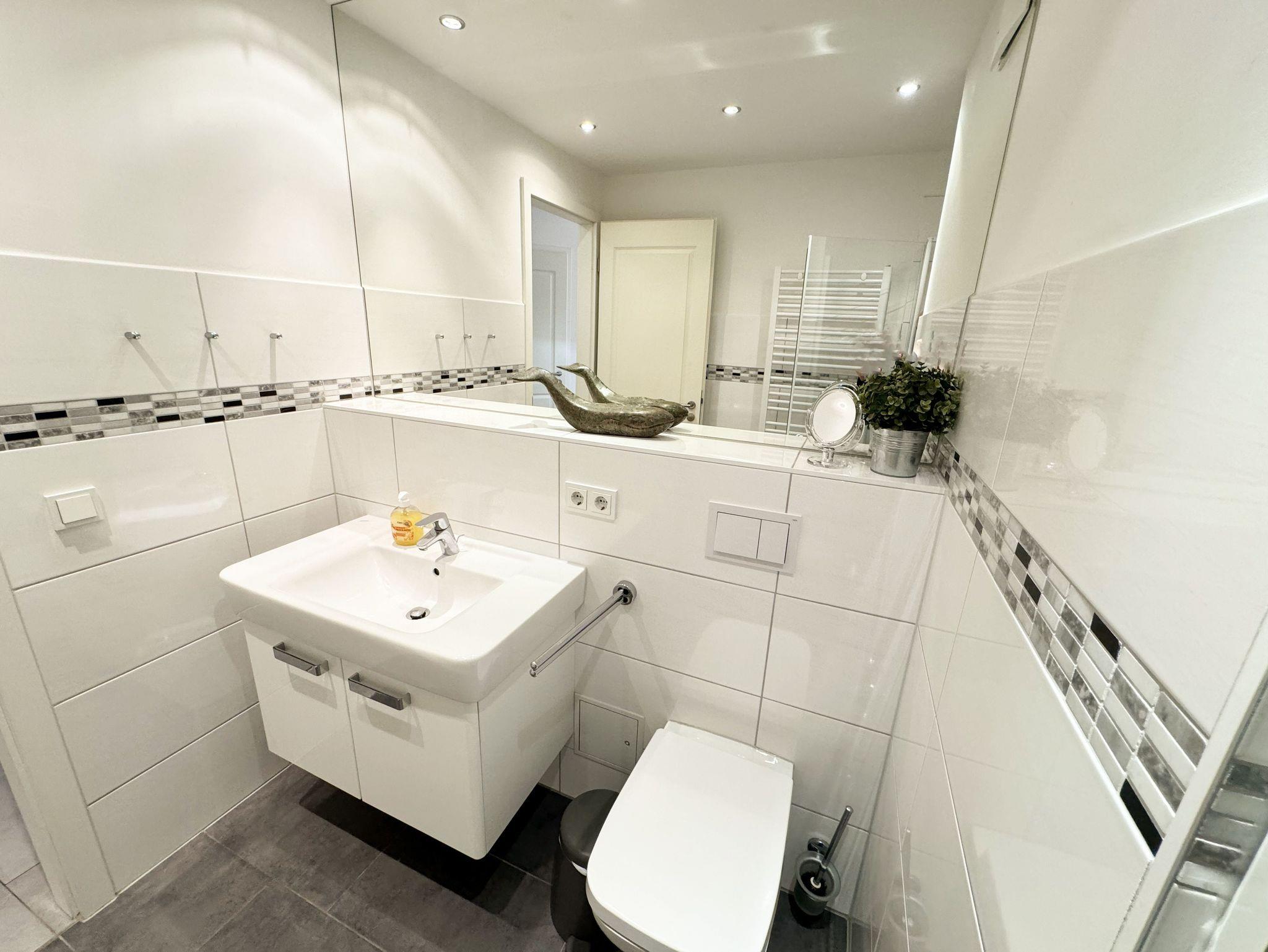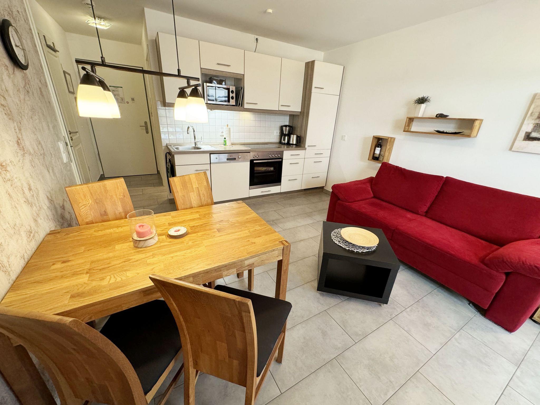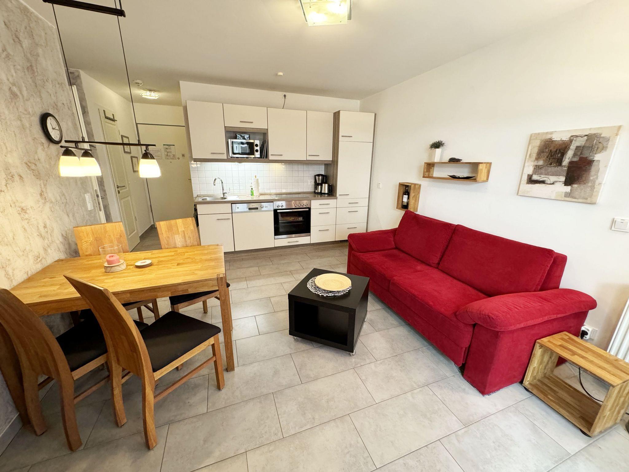 Ihre Nichtraucher/Ferienwohnung Nautica ist mit viel Liebe zum Detail ausgestattet und eingerichtet worden. Sie wohnen in einer ca. 40 qm 2-Zimmer Wohnung, die für 2 bis 4 Personen ausgelegt ist. Die Wohnung befindet sich in der 1. Etage und ist per Fahrstuhl bequem zu erreichen. In der Wohnung finden Sie einen kombinierten Wohn/Koch- und Essbereich. Die integrierte geräumige Küchenzeile lässt mit Mikrowelle, Backofen, Ceranfeld, Spülmaschine, Kühlschrank mit Gefrierfach, Kaffeemaschine und anderen praktischen Helfern keine Wünsche offen. Im Wohnbereich ist weiterhin eine Essecke und eine gemütliche Couch vorhanden, die in wenigen Handgriffen zur 2. Schlafstätte (Schlafcouchmaße 1,60 x 2,00 m) umfunktioniert werden kann. Abgerundet wird der Wohnbereich mit einem Smart-TV, Blu-Ray Player, Leselampe und einer Musikanlage mit DAB-Radio. Auch auf einen Internetanschluss (WLAN) müssen Sie im Urlaub nicht verzichten. Dieser ist für Sie inklusive! Der Balkon ist vom Wohn/Essbereich begehbar und komplett möbliert. Das Schlafzimmer ist mit einem Doppelbett (1,60m x 2,00m), Nachttischkonsolen, kleinem Flachbildschirm und einem begehbaren Kleiderschrank sowie ein Insektenschutzgitter ausgestattet. Auch 1x Kinderreisebett (ohne Matratze und Bett Inlett) sowie 1x Kinderhochstuhl werden unseren kleinen Gästen zur Verfügung gestellt (inklusive). Das Bad verfügt über eine ebenerdige Dusche, Waschbecken, Kosmetikspiegel, Fön, WC und Handtuchheizkörper. Ein eigener PKW-Stellplatz (Nr.23, Einfahrtshöhe 2,00m) befindet sich in der Tiefgarage des Hauses. Auch 1 Hund ist gegen eine Gebühr ein gern gesehener Gast in der Wohnung. Im Keller des Hauses haben Sie die Möglichkeit eine Waschmaschine/Trockner gegen Gebühr zu nutzen. Mit dem Fahrstuhl des Hauses A gelangen sie in das Untergeschoss der Meeresblickanlage, wo Sie ein großzügiger und heller Wellnessbereich erwartet. Hier können sie in einem Pool kleine Bahnen schwimmen, in 2 Saunen Ihren Kreislauf in Schwung bringen, in einem dazugehörigen Ruheraum Ihren Körper wieder beruhigen, in einer Schneckendusche sowie weiteren Duschen das kühle Nass genießen und auf einer Außenterrasse mit Außendusche die frische Luft einatmen. Die Erstausstattung eines Wäschepaketes (komplette Bettwäsche, 1 Duschhandtuch, 2 kleine Handtücher) können Sie bis 14 Tage vor Anreise gegen einen Aufpreis dazu buchen oder durch eigene ergänzen. Ab 2 gebuchten Paketen erhalten Sie einmalig 1 Geschirrhandtuch und 1 Duschvorleger hinzu.