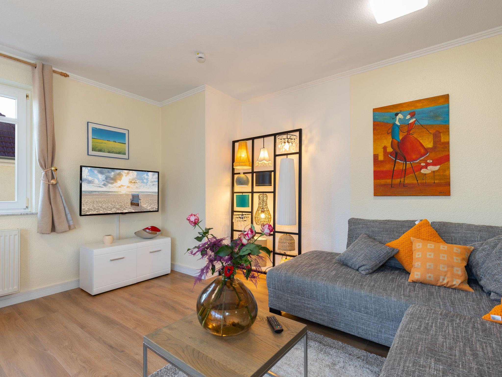 Die schöne Ferienwohnung liegt in der 1. Etage und verfügt über einen separaten Eingang mit Flur. Sie ist ca. 64 qm groß, hat Platz für maximal 4 Erwachsene. Die Ferienwohnung wurde modern und komfortabel eingerichtet. Gäste dieser Ferienwohnung können auch ein kostenloses WLAN-Internet nutzen. Im großen Wohnraum befinden sich eine bequeme ausziehbare Schlafcouch, Sessel und ein Tisch, ein modernes Flachbild-TV-Gerät. Hier steht auch ein Esstisch mit Stühlen.