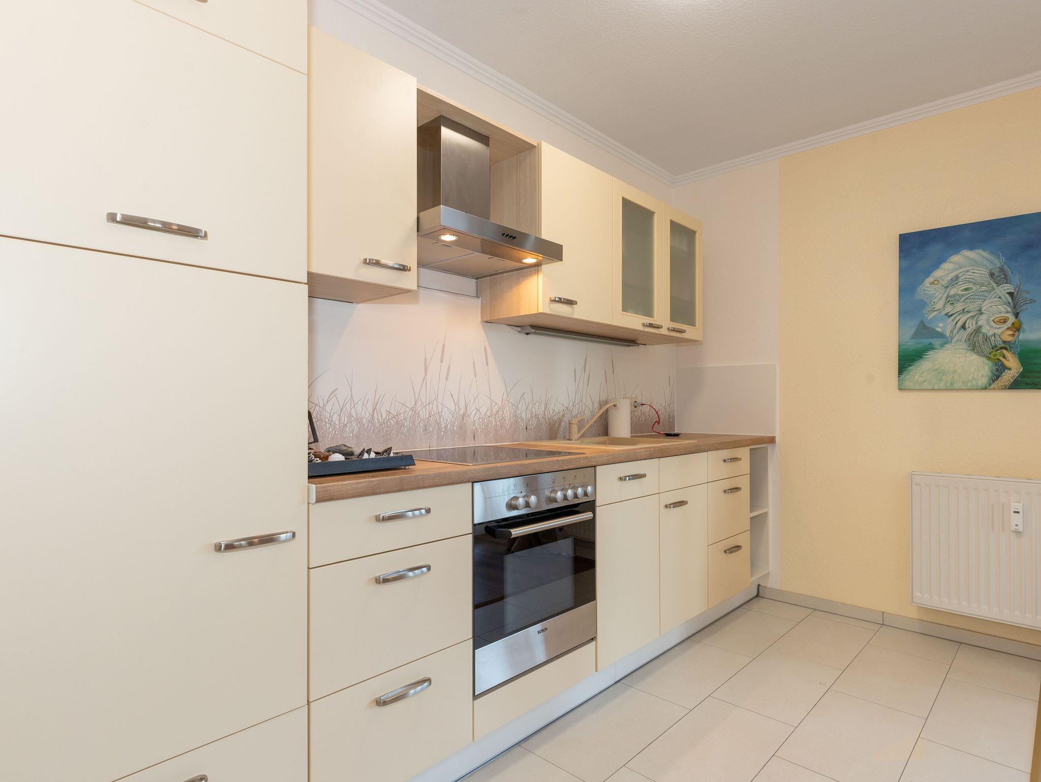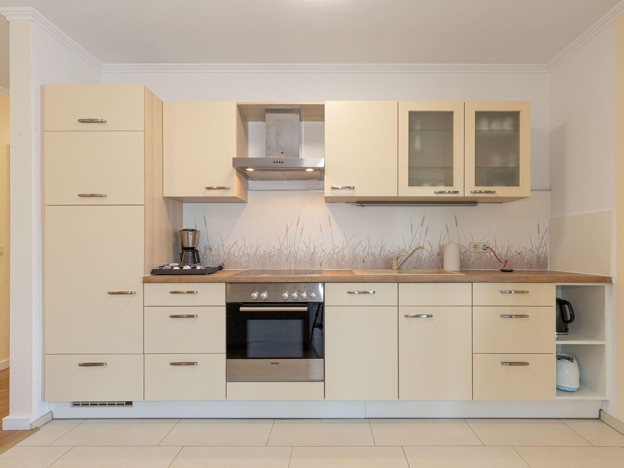 Die moderne Küchenzeile ist komplett ausgestattet mit Cerankochfeld, Geschirrspülmaschine, Wasserkocher, Kaffeemaschine, Toaster und umfangreichen weiteren Küchenutensilien.