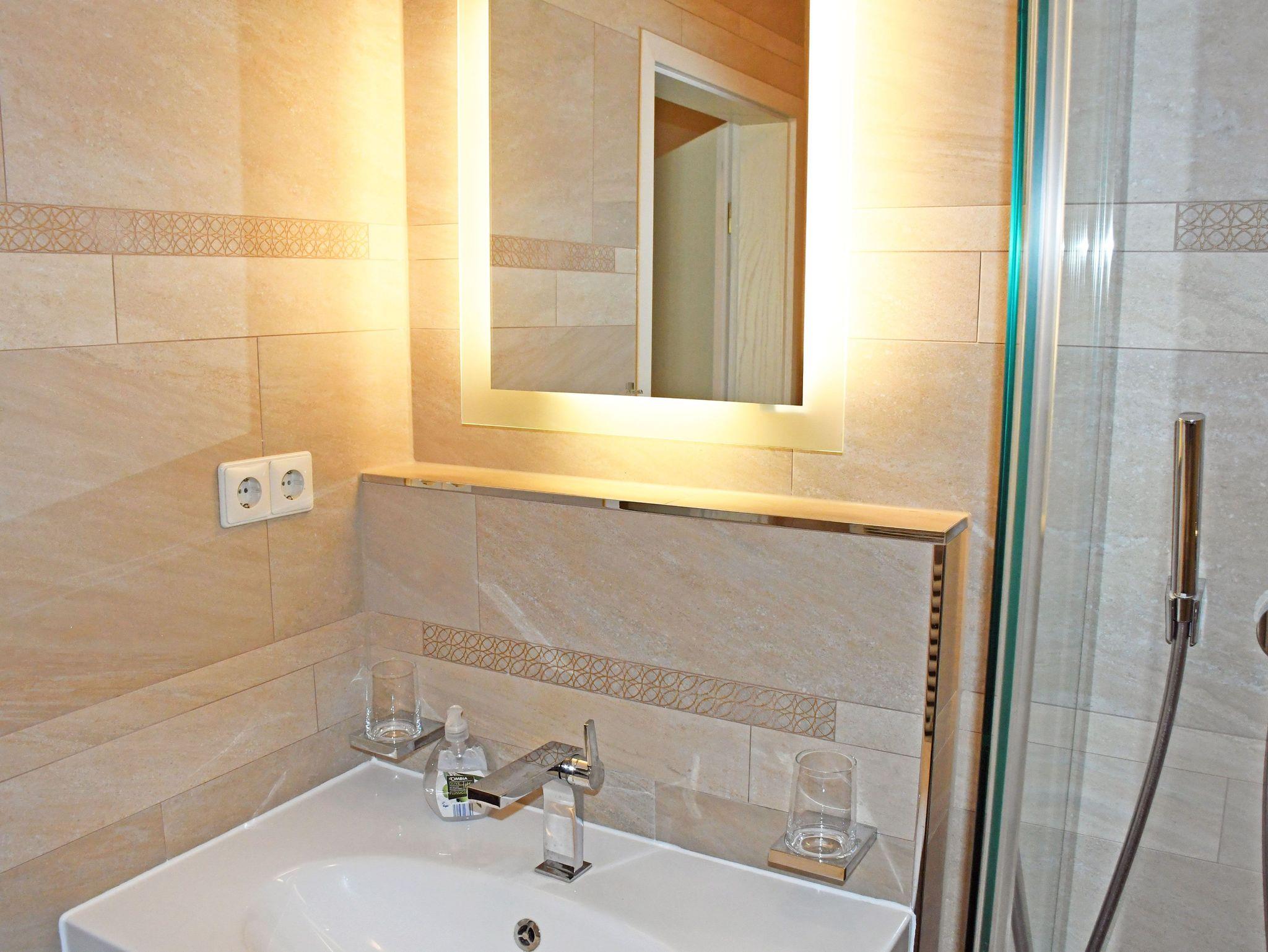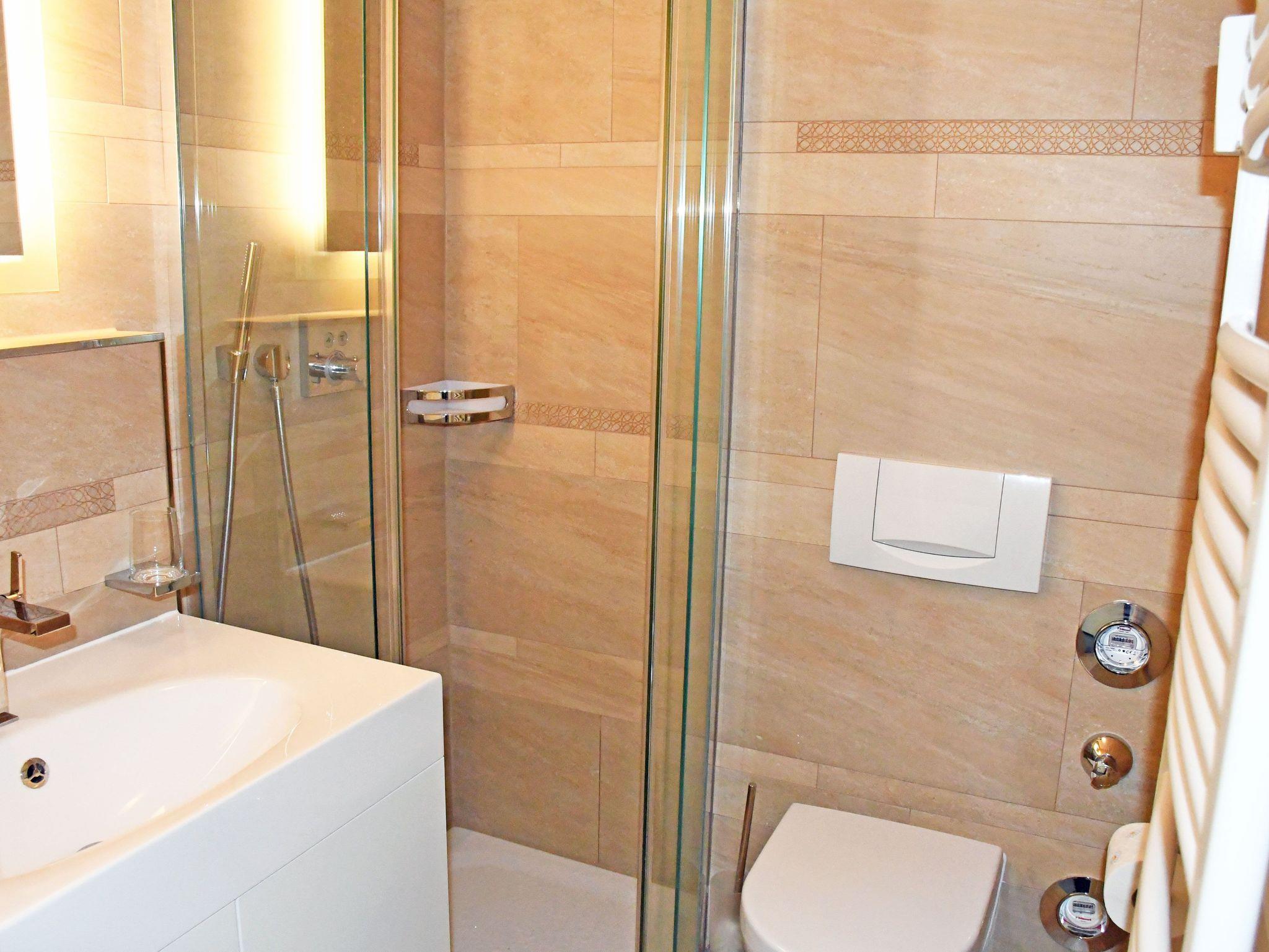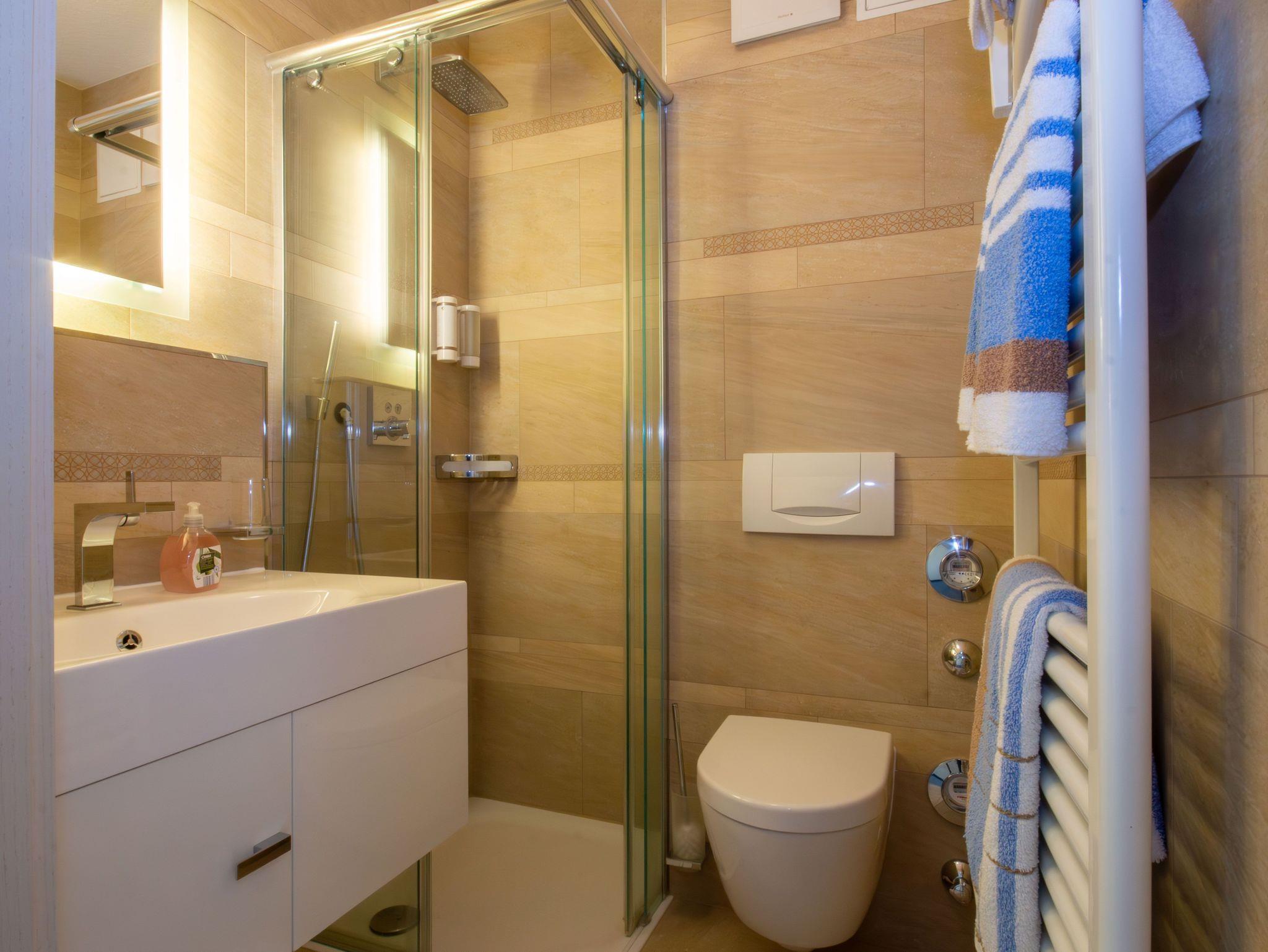 Das moderne Bad ist mit Dusche, WC und Waschtisch ausgestattet.