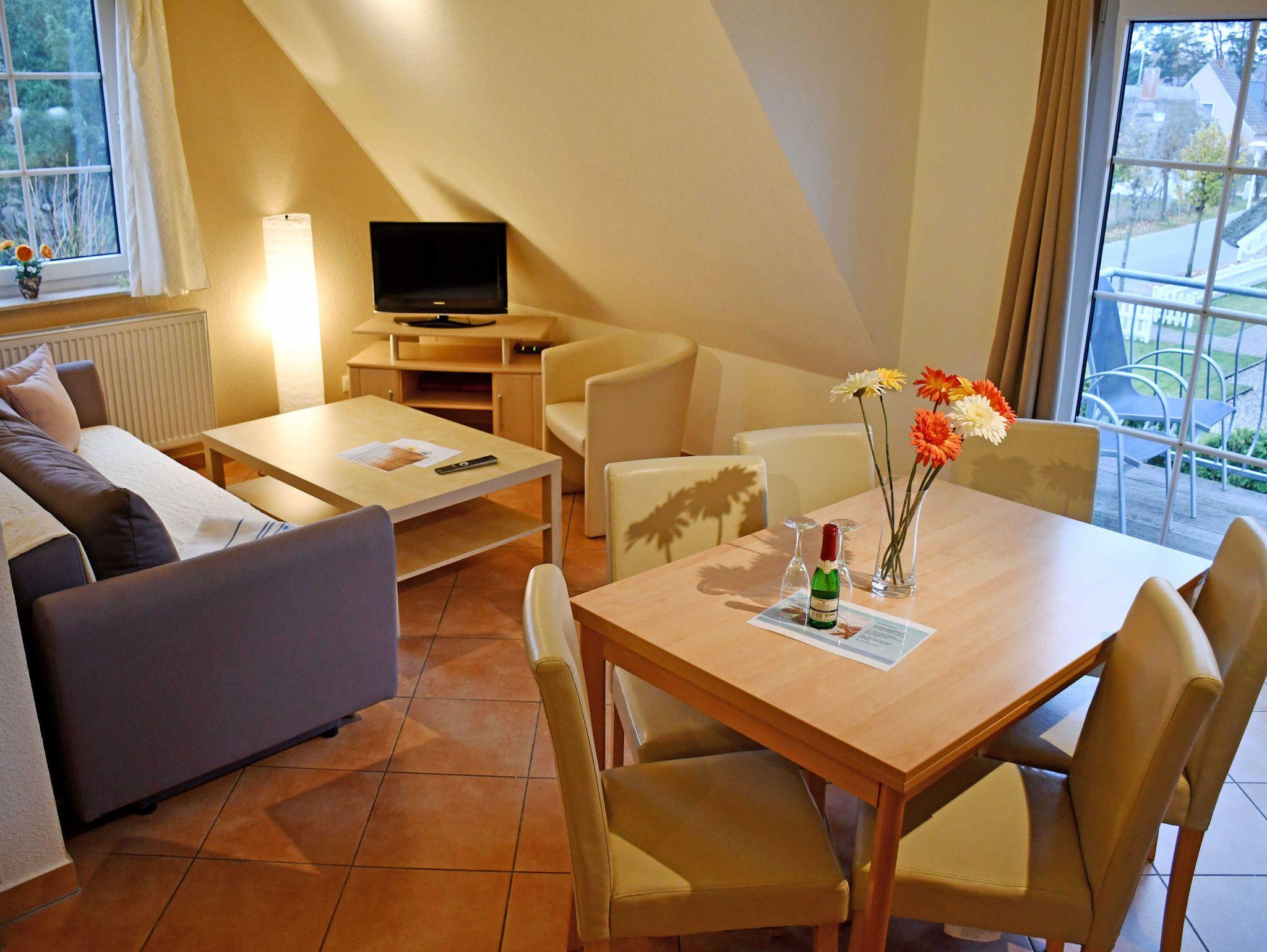 Im Wohnraum befinden sich eine bequeme Sitzcouch mit Tisch und ein modernes Flachbild-TV-Gerät. Hier steht auch ein Esstisch mit Stühlen.