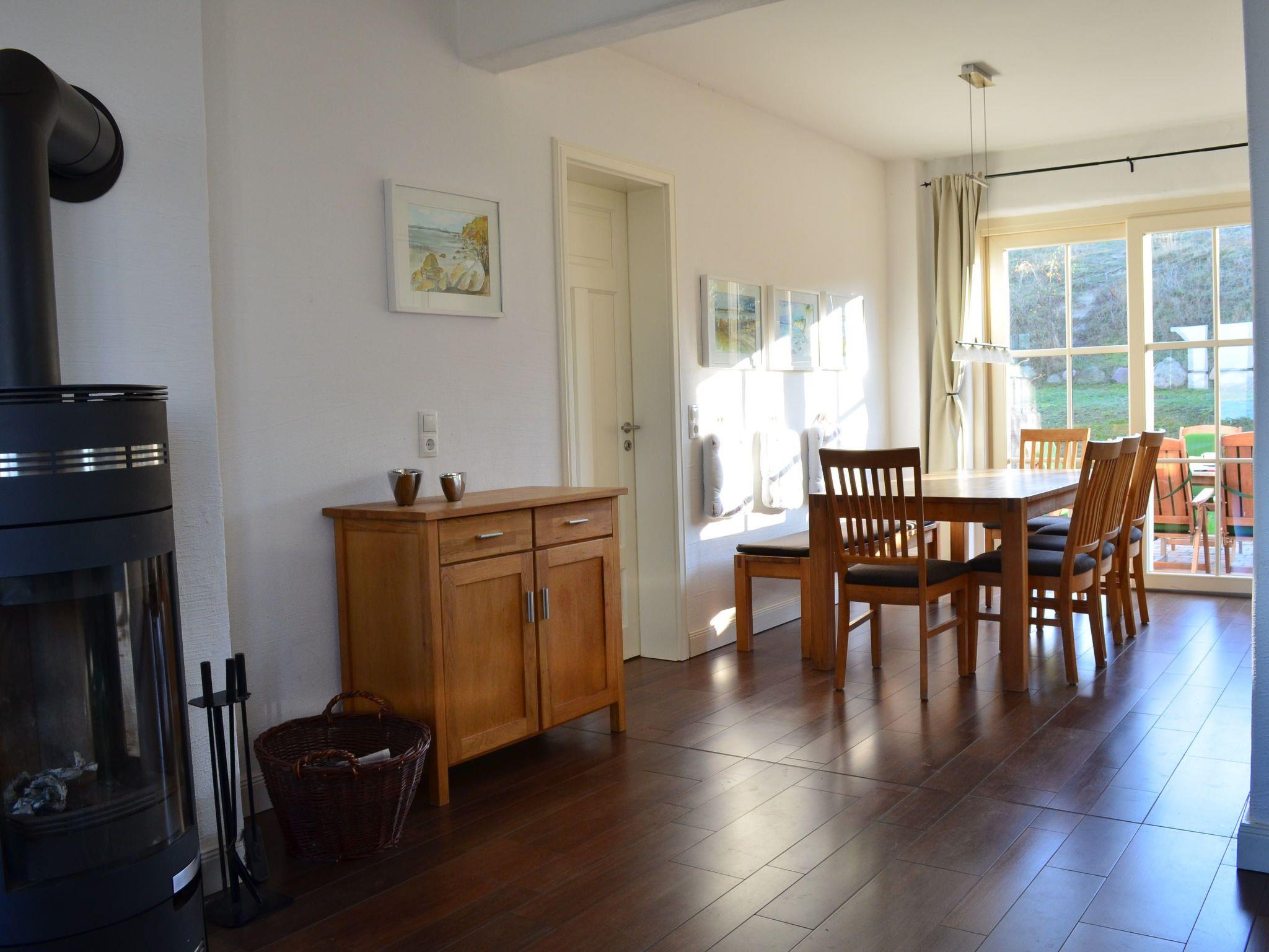 The open and fully equipped country-style kitchen with floor-to-ceiling windows and large dining table is ideal for cooking with family or friends. From here you have direct access to the south-facing terrace and the garden to enjoy an undisturbed breakfast or simply relax in the Rügen sunshine.