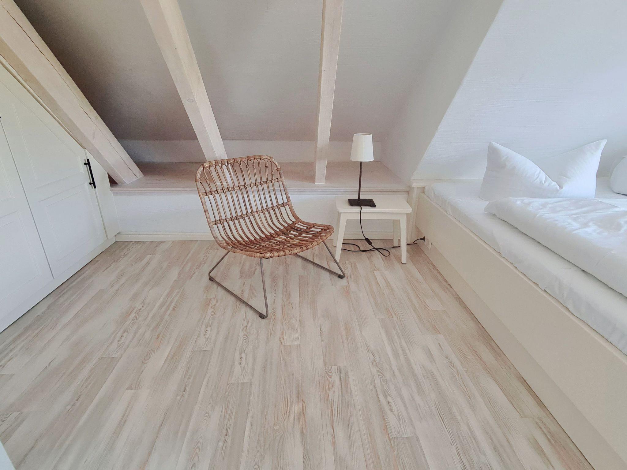 At the very top under the roof of the house is another spacious bedroom with "open beams". The spacious bedroom is furnished with a double bed and Smart TV, a seating area and a workstation.