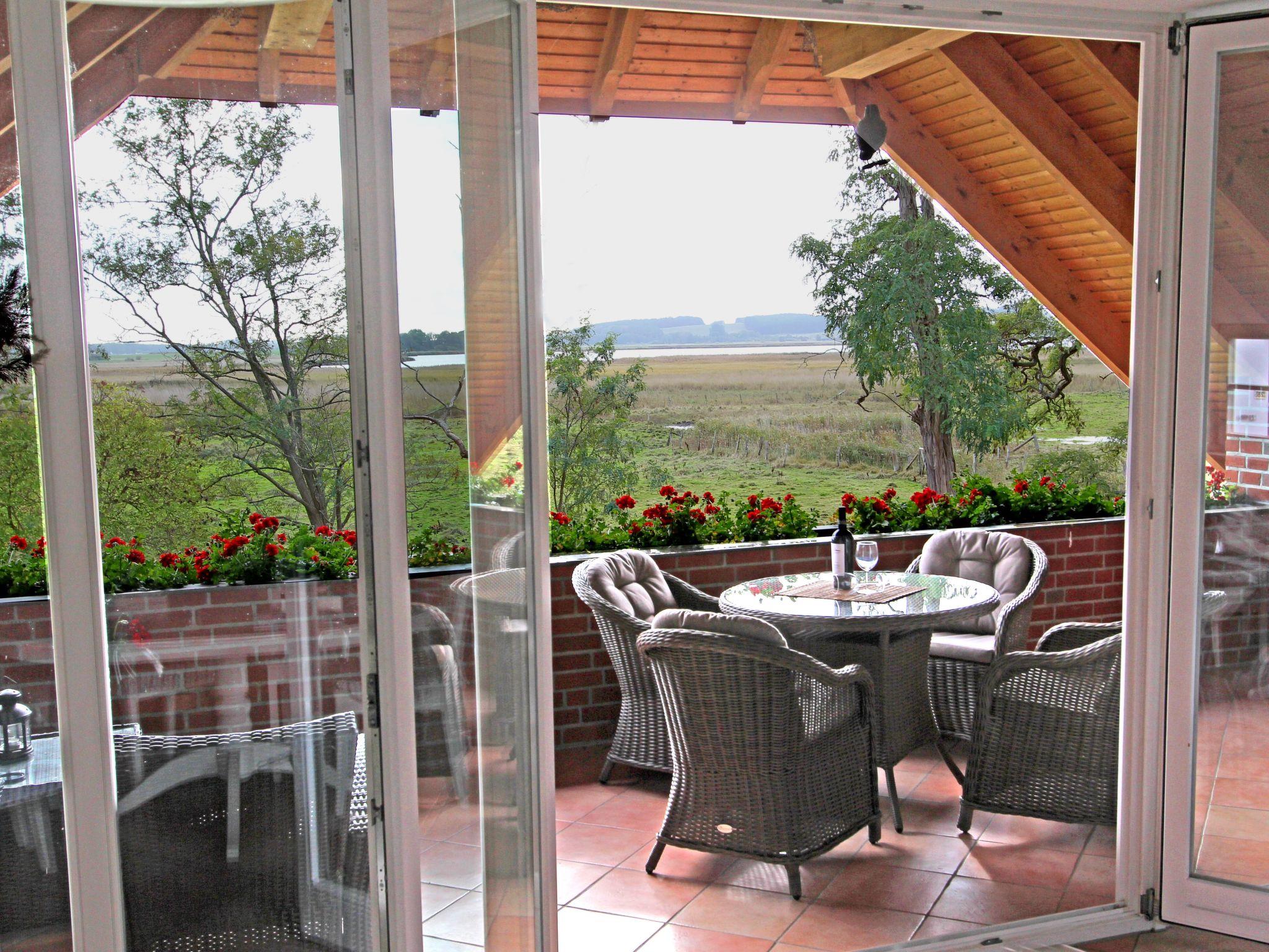 Inside, the holiday flat impresses with its upscale furnishings and great attention to detail. On 91 m² of living space on the upper floor, you will find a spacious living room with a fireplace and an impressive panoramic window front that floods the room with light and offers a view of the idyllic Bodden landscape. Two separate bedrooms with cosy double beds promise restful nights. There are also two elegant bathrooms - one with a modern shower and the other with a spacious bathtub for romantic moments. The well-equipped kitchen rounds off the space and invites you to enjoy culinary discoveries or cosy game nights.
