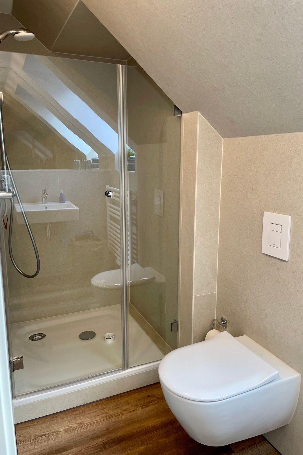 The 3-room maisonette flat has two bedrooms with king-size box-spring beds (1.80 m x 2.00 m), a living room with sofa set (sofa bed 1.40 m x 2.00 m), an integrated fitted kitchen, a dining area and two shower rooms. The fully equipped kitchen with dining area is integrated into the large living room. From here you have access to the balcony with a wonderful view of the countryside.