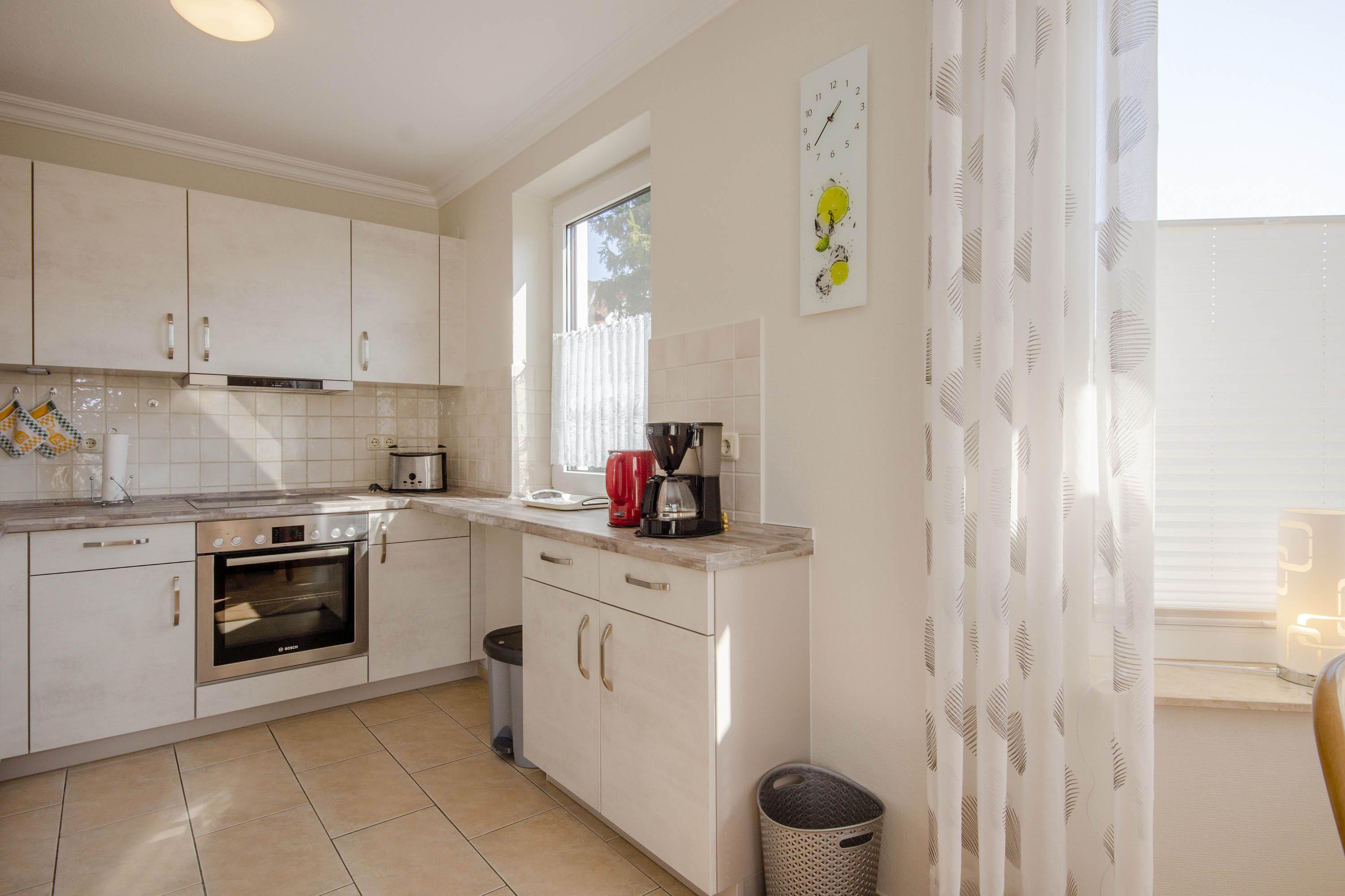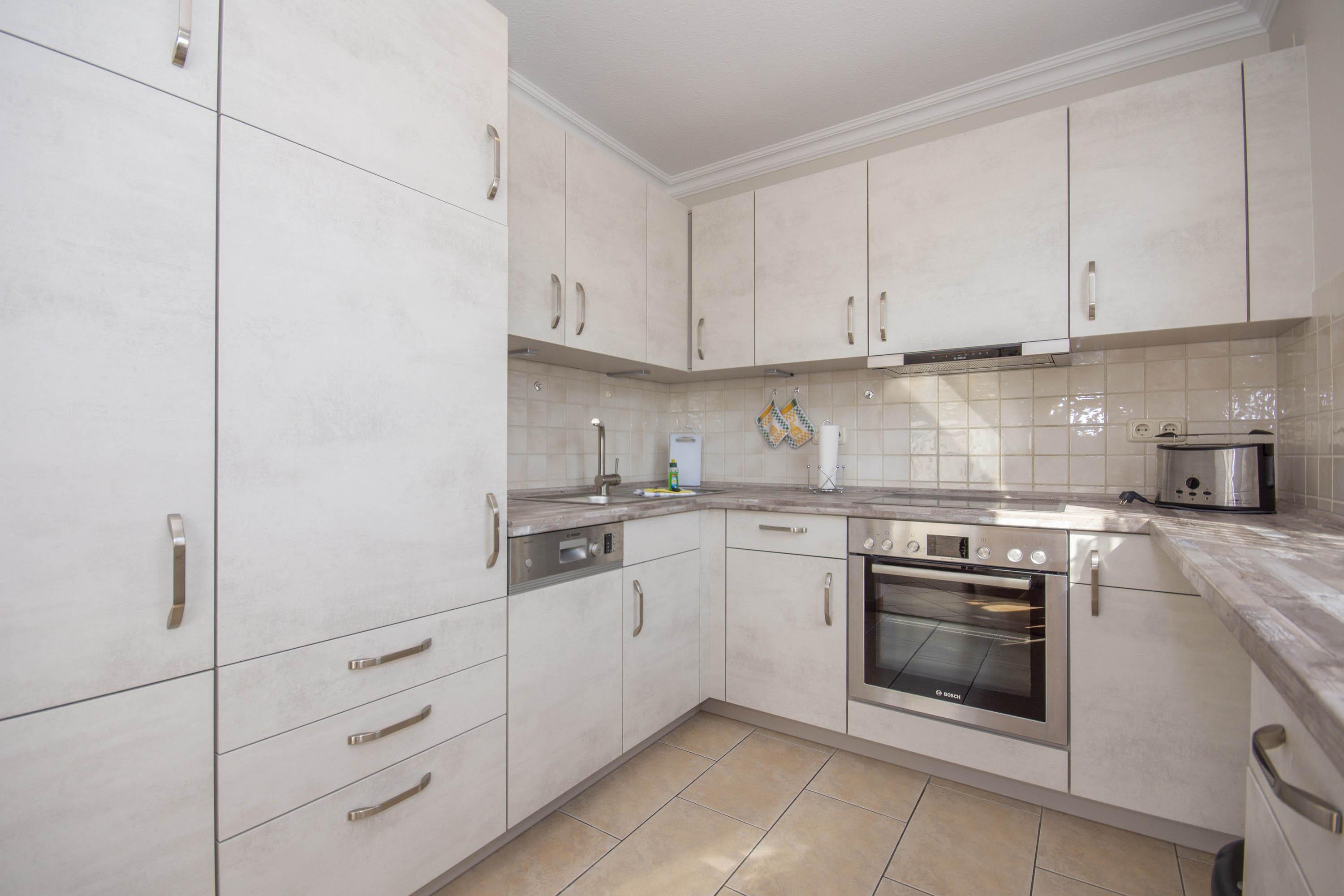 In der Wohnung befindet sich eine offene, voll ausgestattete Küche mit Spülmaschine, Herd, Cerankochfeld und Mikrowelle. Zahlreiche Küchenutensilien eröffnen Ihnen die Möglichkeit, einen kulinarischen Kochabend zu verleben.