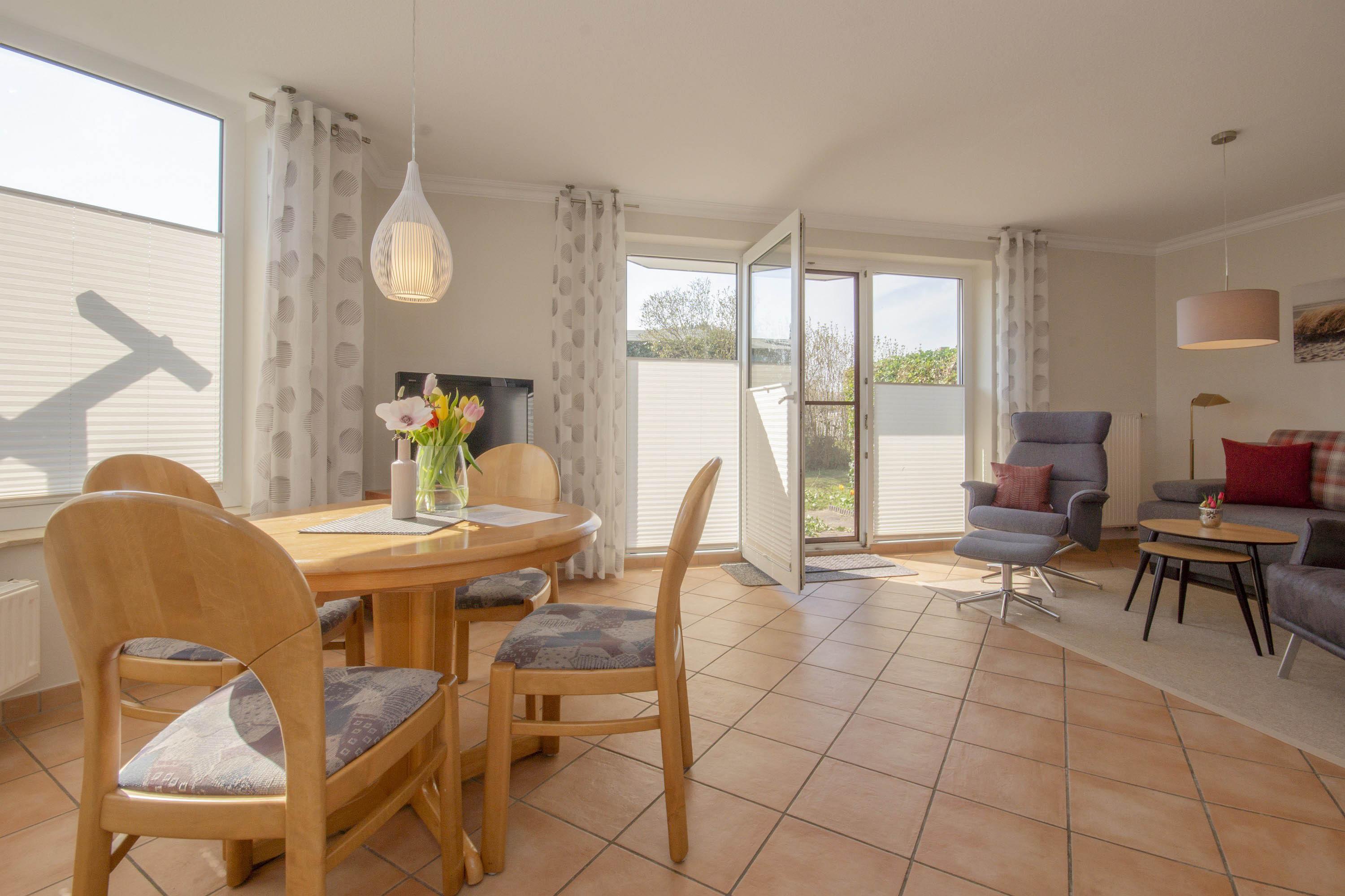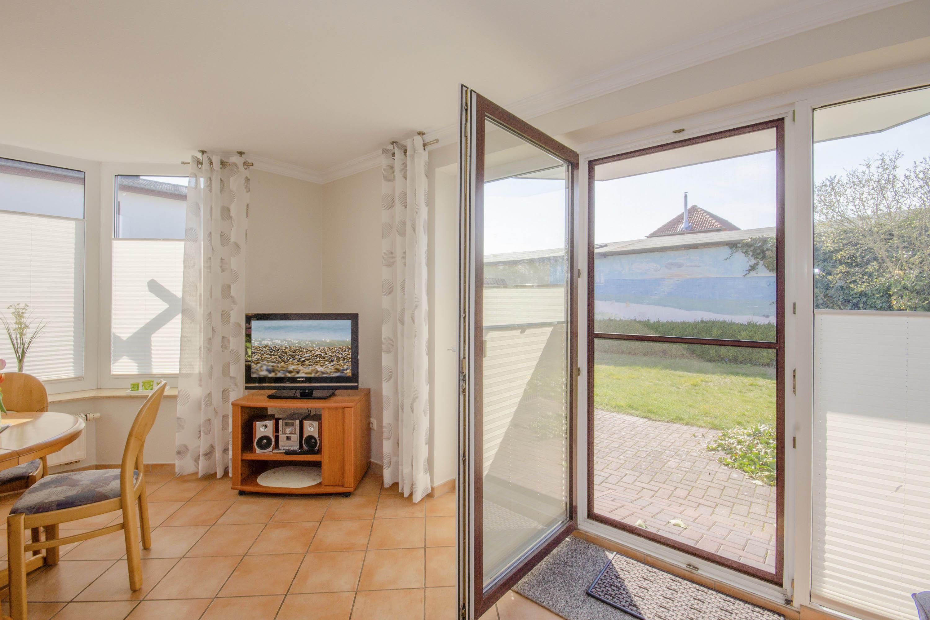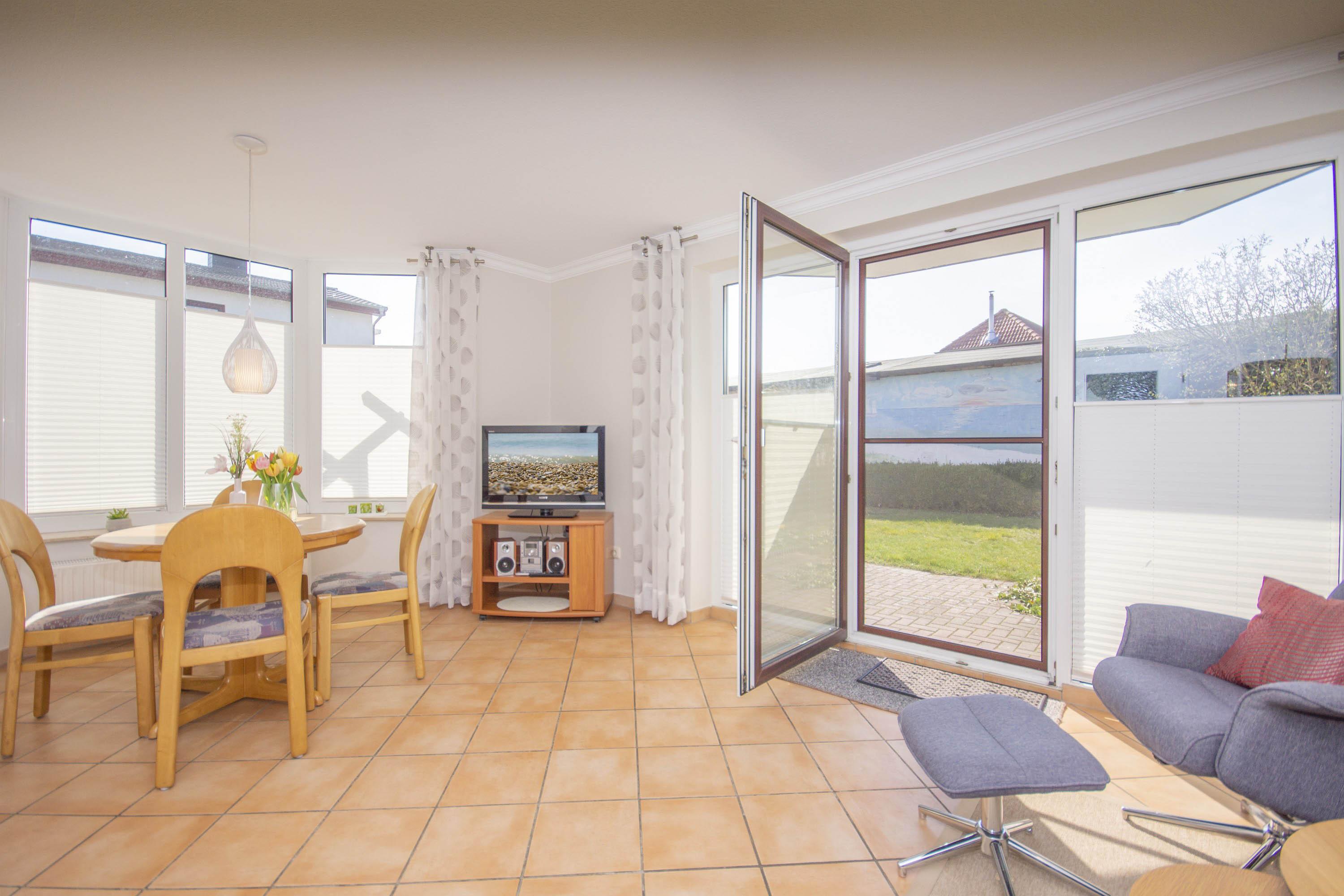 Die Ferienwohnung 3 im Erdgeschoss im Haus Rügensonne verfügt über einen freundlichen Eingangsbereich, eine sonnige Terrasse, einen gemütlichen Wohnbereich und ein separates Schlafzimmer.