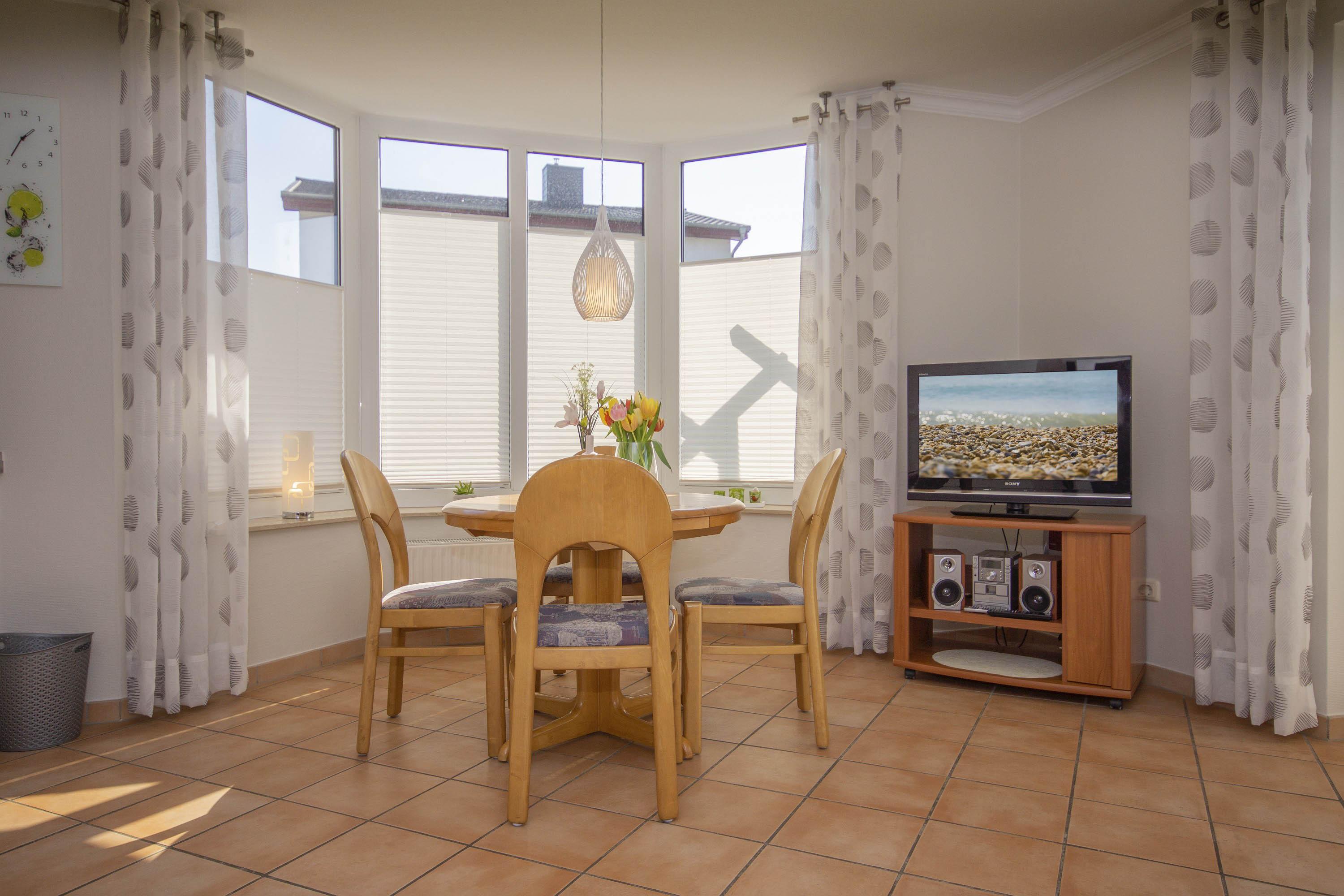 Der freundliche Wohnbereich bietet einen gemütlichen Ort zum Ausklingen der erlebnisreichen Tage auf Rügen. Hier befindet sich neben einem modernen Flachbild-TV auch eine außerordentlich komfortable Couchgarnitur, die eine optionale Aufbettung für bis zu 2 weitere Personen darstellt. Von diesem Zimmer erhalten Sie einen direkten Zugang auf die eigene Terrasse, welche mit komfortablen Gartenmöbeln ausgestattet ist. Hier können Sie nach einem erlebnisreichen Strandtag in Baabe einfach mal die Seele baumeln lassen.
