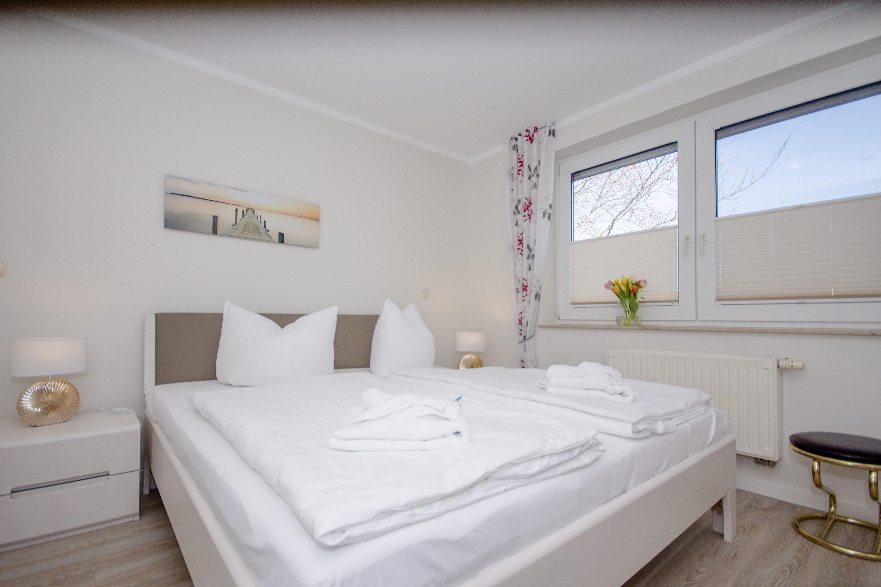 Die Ferienwohnung 4 im Obergeschoss im Haus Rügensonne verfügt über einen freundlichen Eingangsbereich, einen Balkon, einen gemütlichen Wohnbereich und ein separates Schlafzimmer.