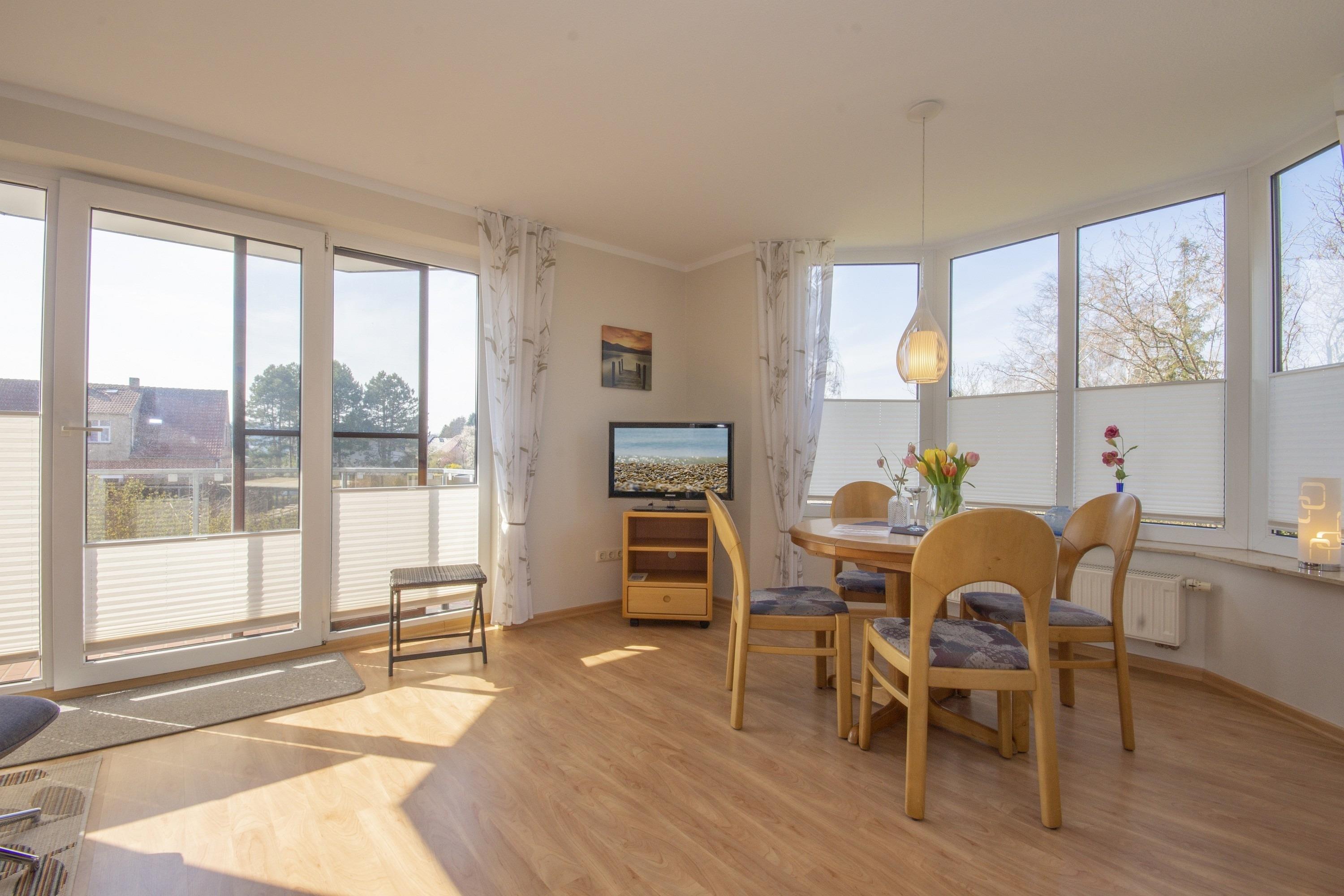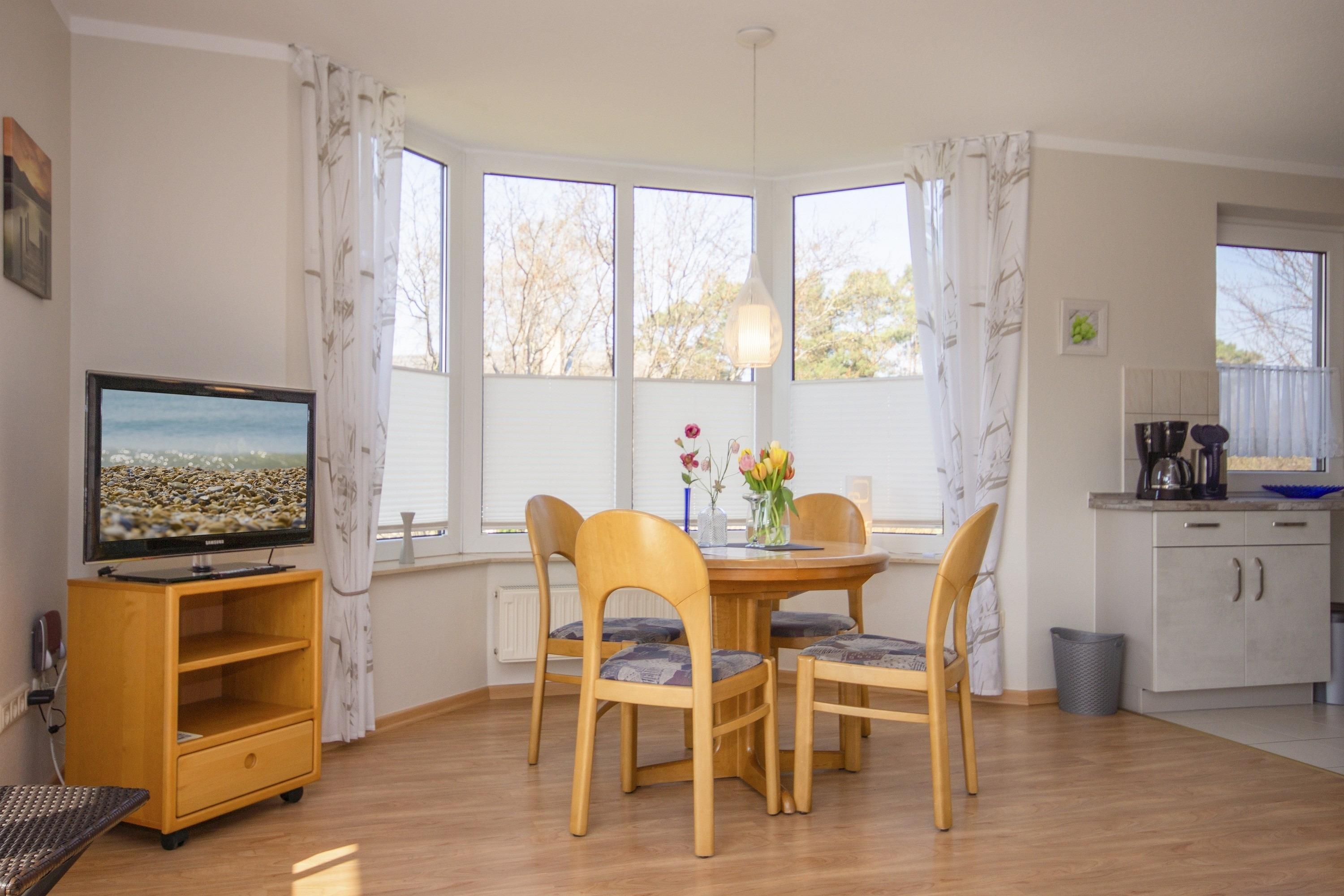 Der freundliche Wohnbereich bietet einen gemütlichen Ort zum Ausklingen der erlebnisreichen Tage auf Rügen. Hier befindet sich neben einem modernen Flachbild-TV auch eine außerordentlich komfortable Couchgarnitur, die eine optionale Aufbettung für bis zu 2 weitere Personen darstellt. Von diesem Zimmer erhalten Sie einen direkten Zugang auf den Balkon. Hier können Sie nach einem erlebnisreichen Strandtag in Baabe einfach mal die Seele baumeln lassen.