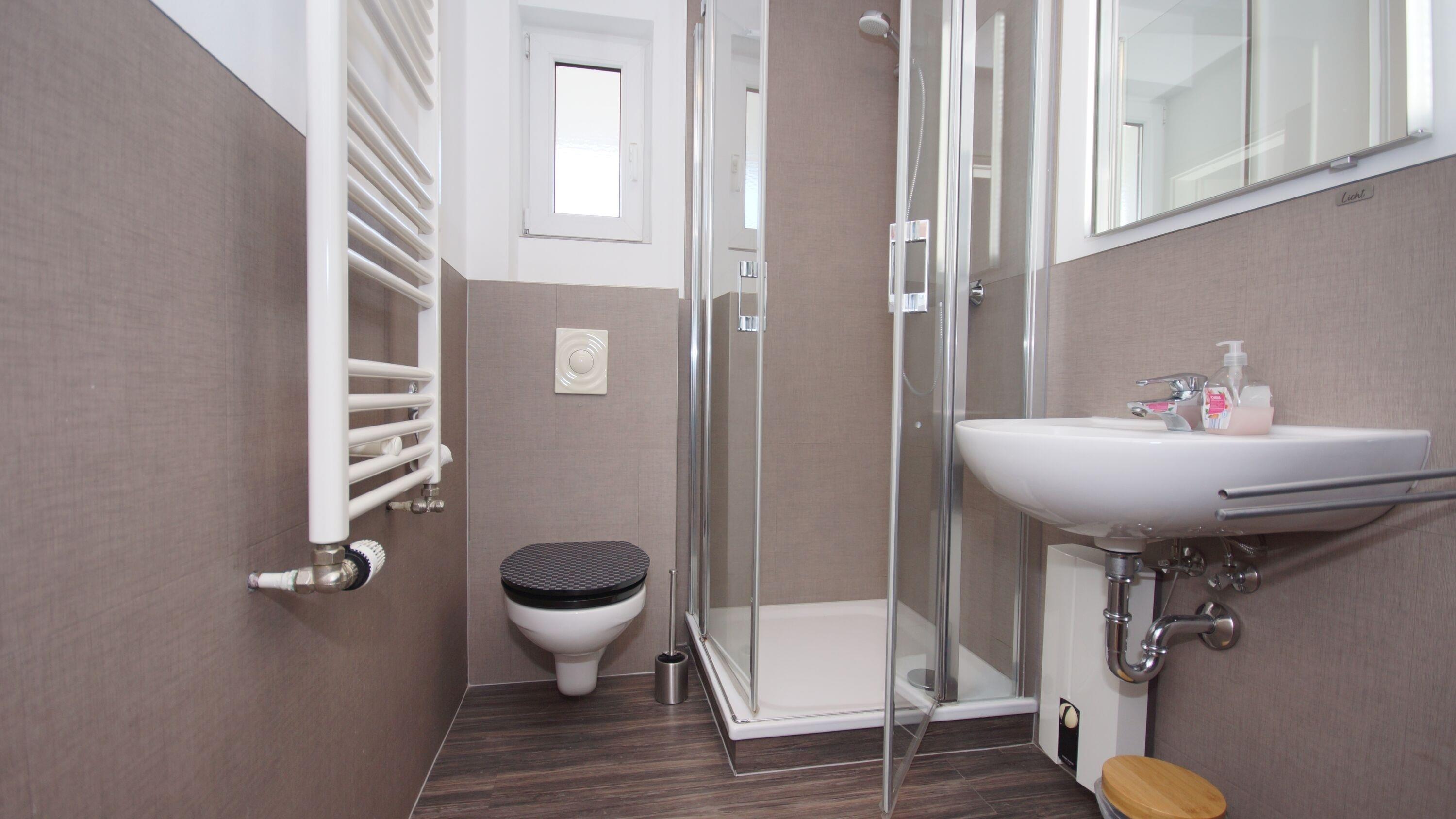 Das moderne Tageslicht-Badezimmer verfügt über eine Dusche und eine Toilette.