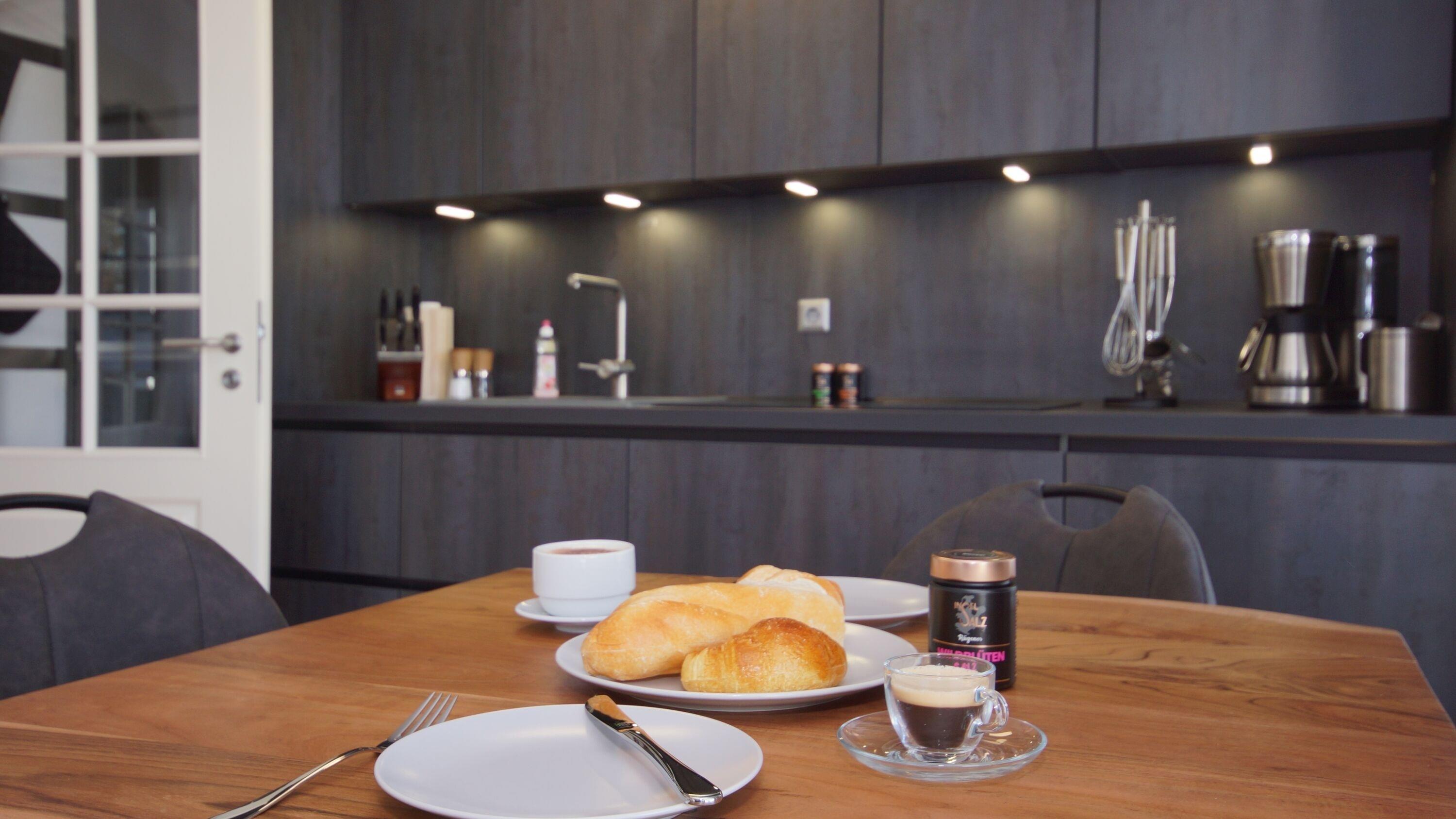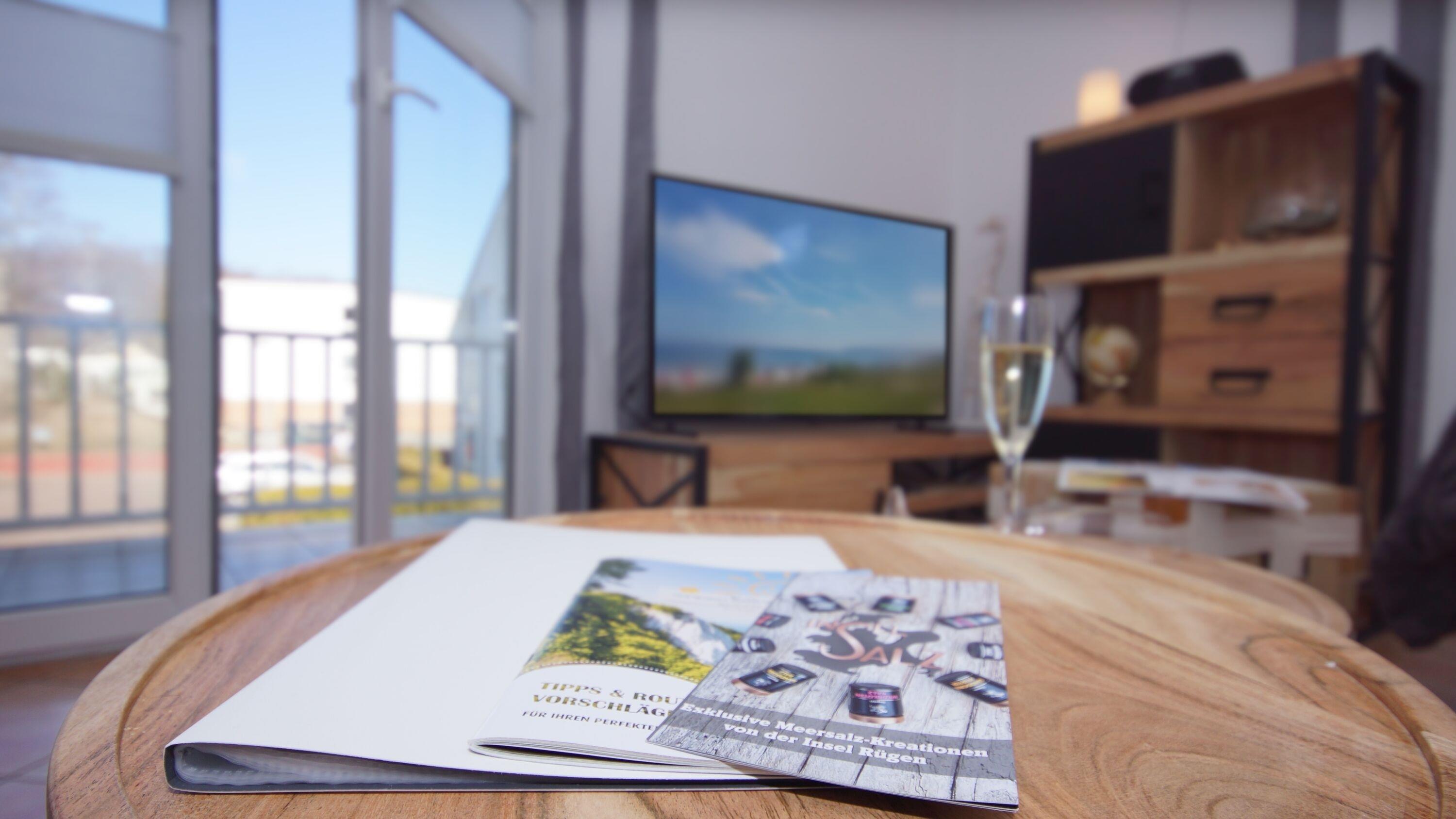 Nach Betreten des hellen Flurbereichs erreichen Sie direkt das freundliche Wohnzimmer. Dort steht Ihnen eine bequeme Couchgarnitur (155 x 200 cm, hier ist eine Aufbettung für eine weitere Person möglich) und ein einladender Essbereich zur Verfügung. Der Flachbild-TV und der kostenfreie WLAN-Zugang runden das Gesamterlebnis ab.