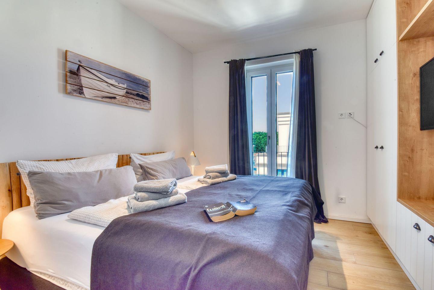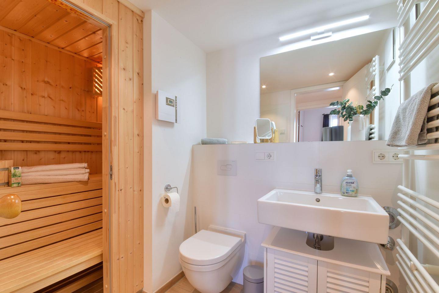 Die beiden Schlafzimmer sind jeweils mit einem Doppelboxspringbett, TV und Kleiderschrank ausgestattet, während das Badezimmer mit einer ebenerdigen Wellness-Regendusche, einem Waschtisch, WC und einer eigenen Sauna beeindruckt. Ein zweites Bad mit Waschtisch und WC rundet das Angebot ab.