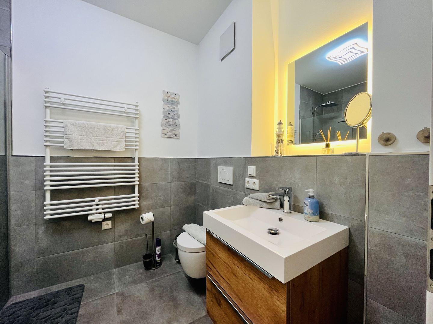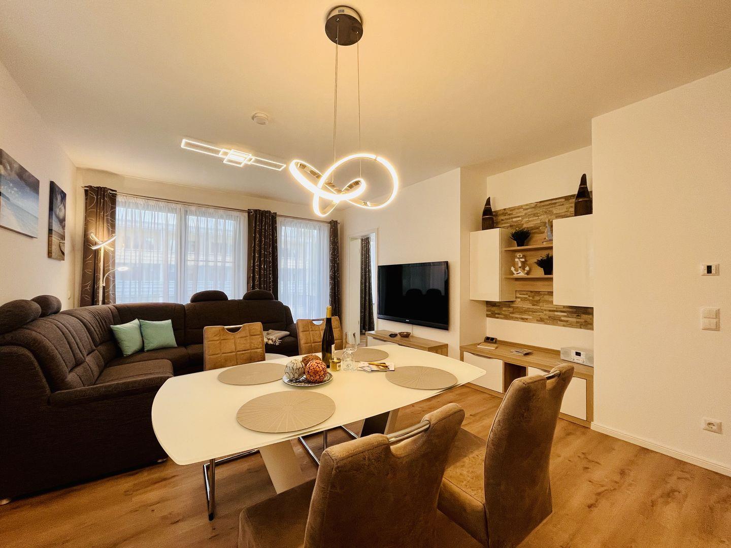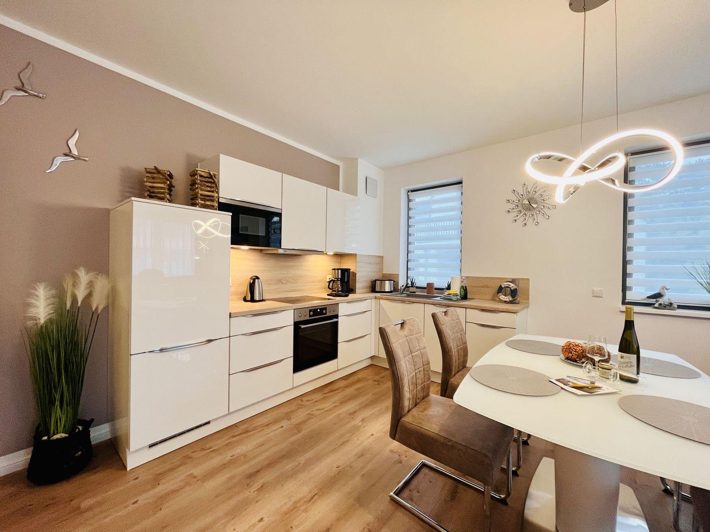 An den Wohnbereich schließt sich die offene und komplett ausgestattete Küchenzeile mit Esstisch und bequemen Esstischstühlen an. Das Schlafzimmer mit hochwertigem Boxspringbett und ein Badezimmer mit ebenerdiger Regendusche ergänzen die hochwertige Ausstattung der Ferienwohnung Morgensonne. Ein PKW-Stellplatz in der hauseigenen Tiefgarage und kostenfreies WLAN stehen Ihnen während des Urlaubs zur Verfügung.