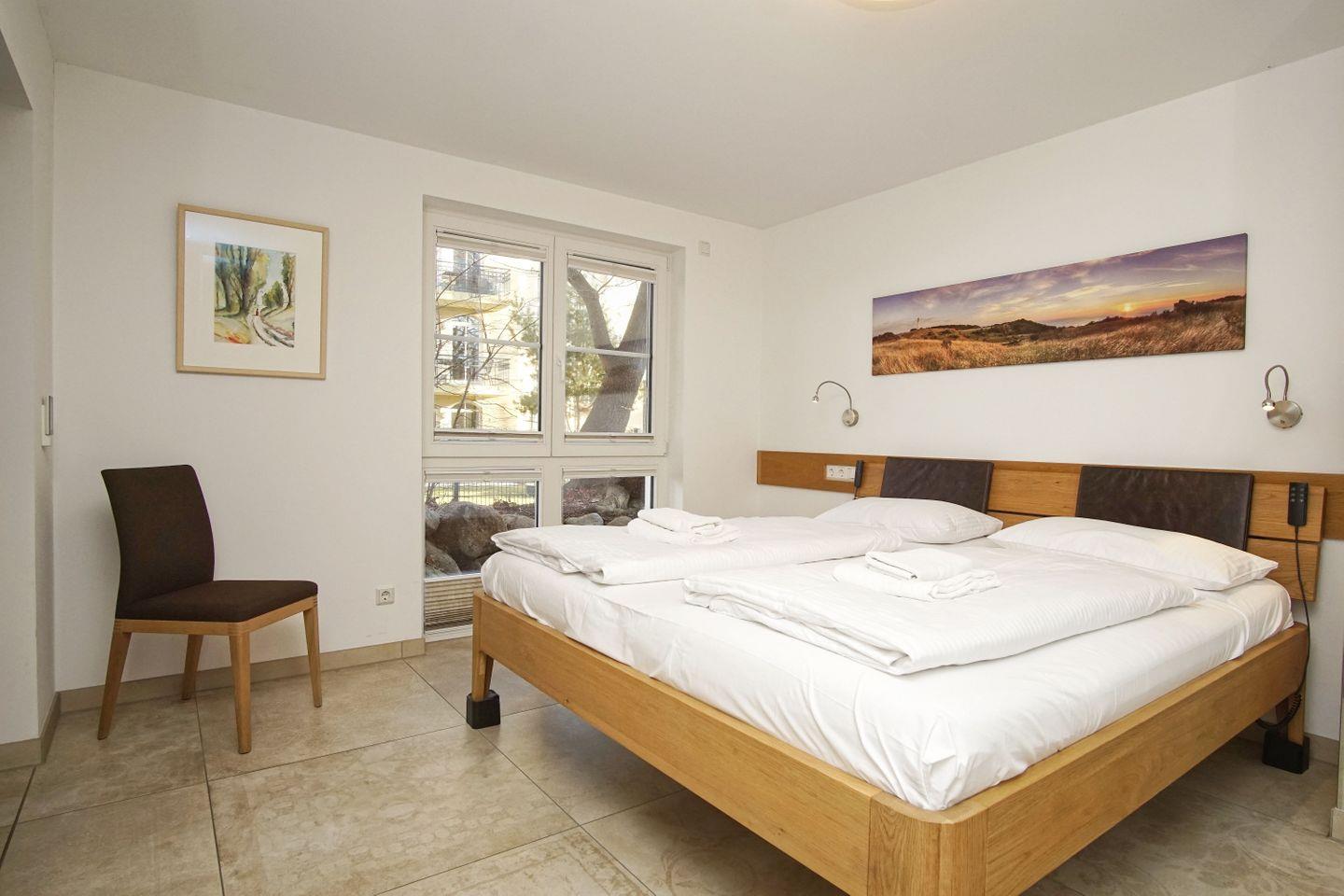 SCHLAFEN // ein Schlafzimmer mit Doppelbett (beide Matratzen elektrisch höhenverstellbar), Kleiderschrank, Flachbild-TV, zusätzlicher Schlafplatz im Wohnzimmer auf der Couch mit Schlaffunktion ++