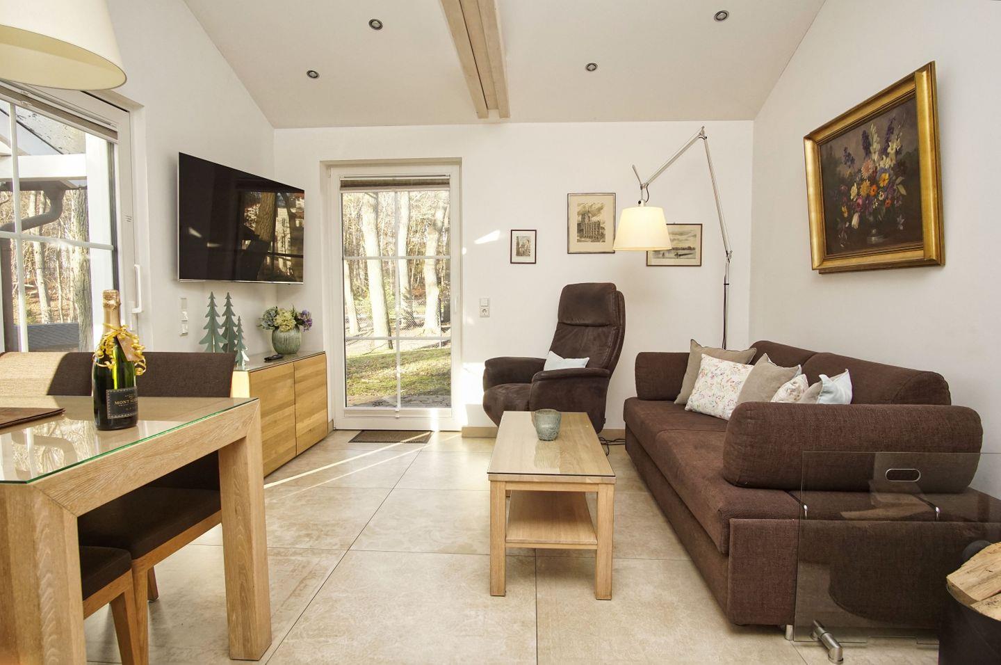 WOHNEN // Wohnraum mit Essbereich, bequemer Couch mit Schlaffunktion, Relax-Fernseh-Sessel mit elektrischer Aufstehhilfe, Flachbild-TV ++