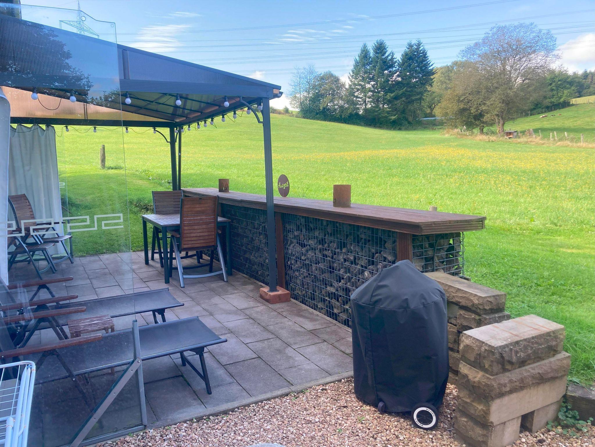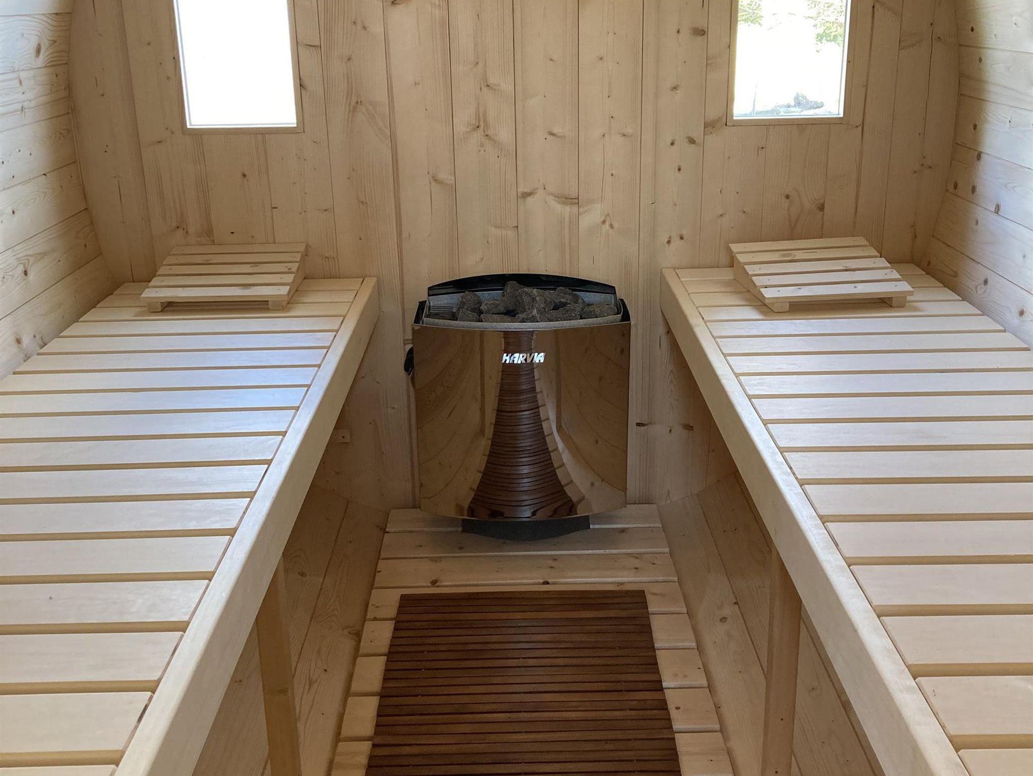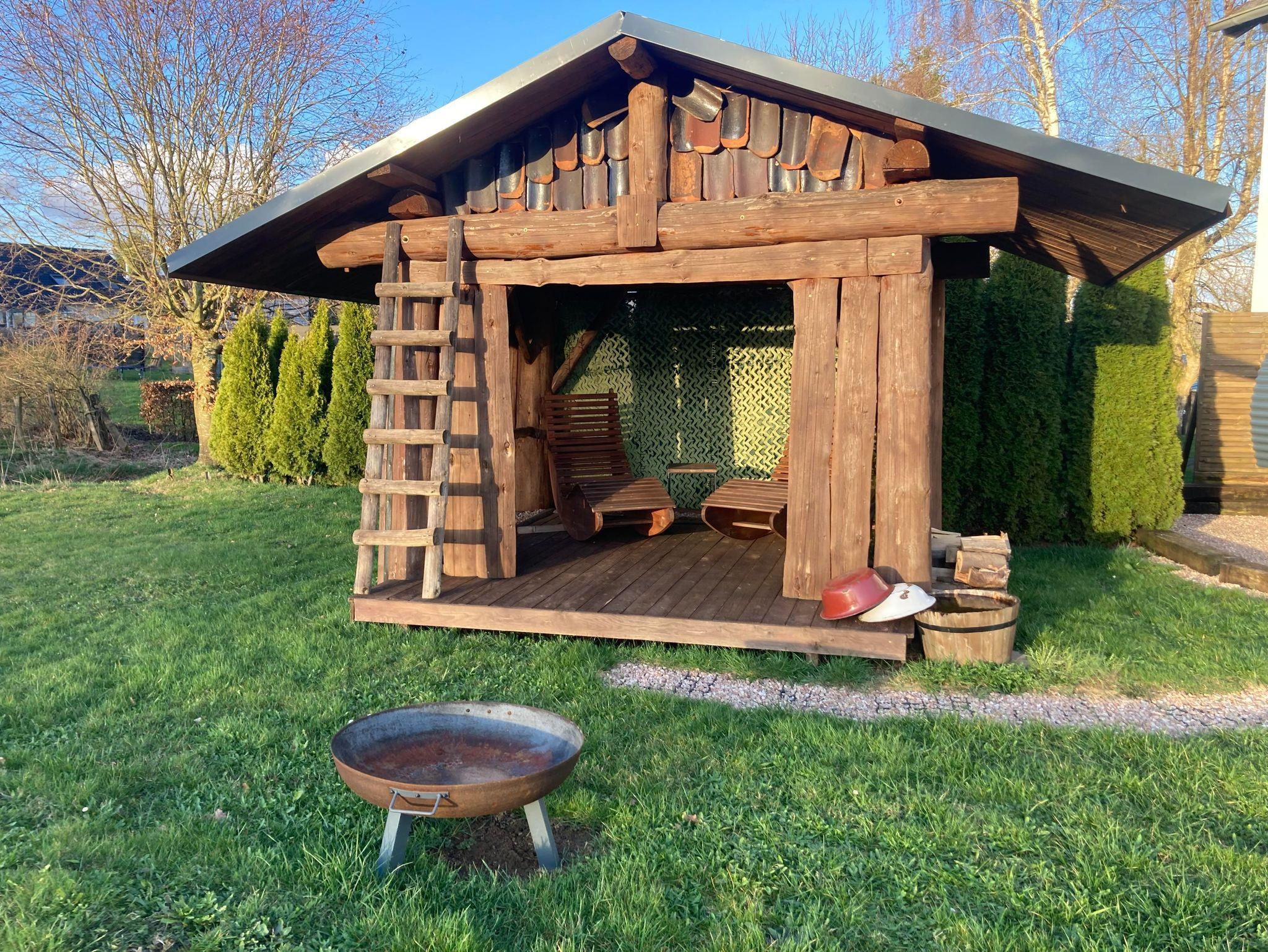 Die Terrasse verfügt über Holzmöbel mit Grill und Sauna.