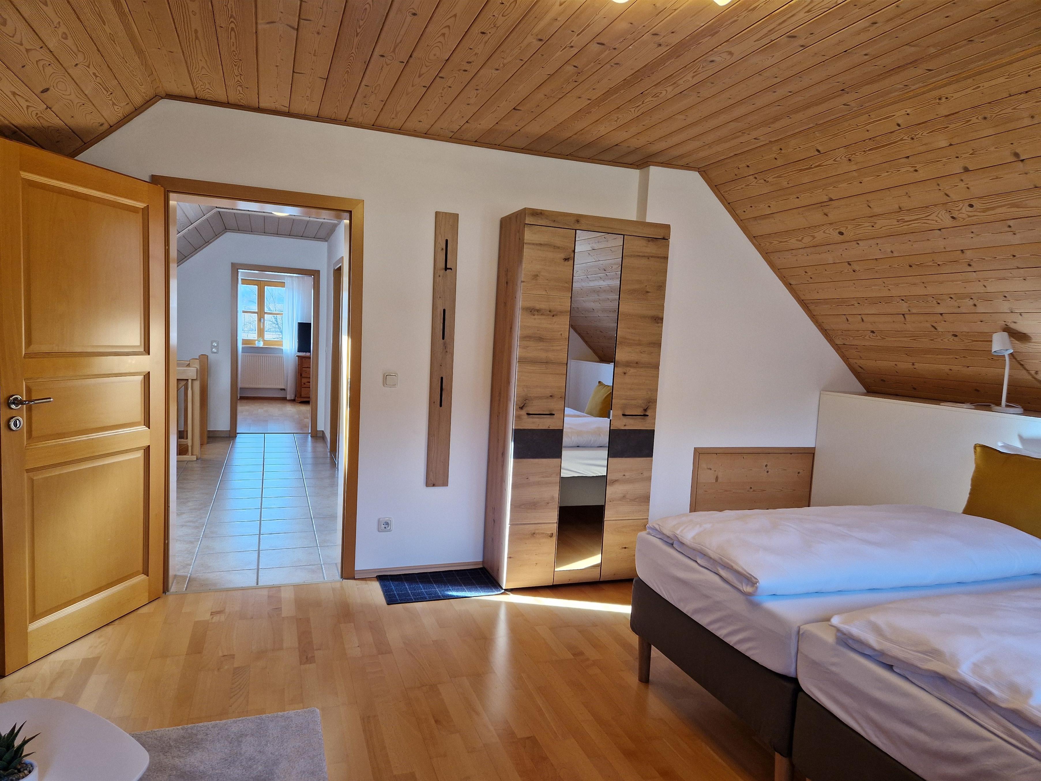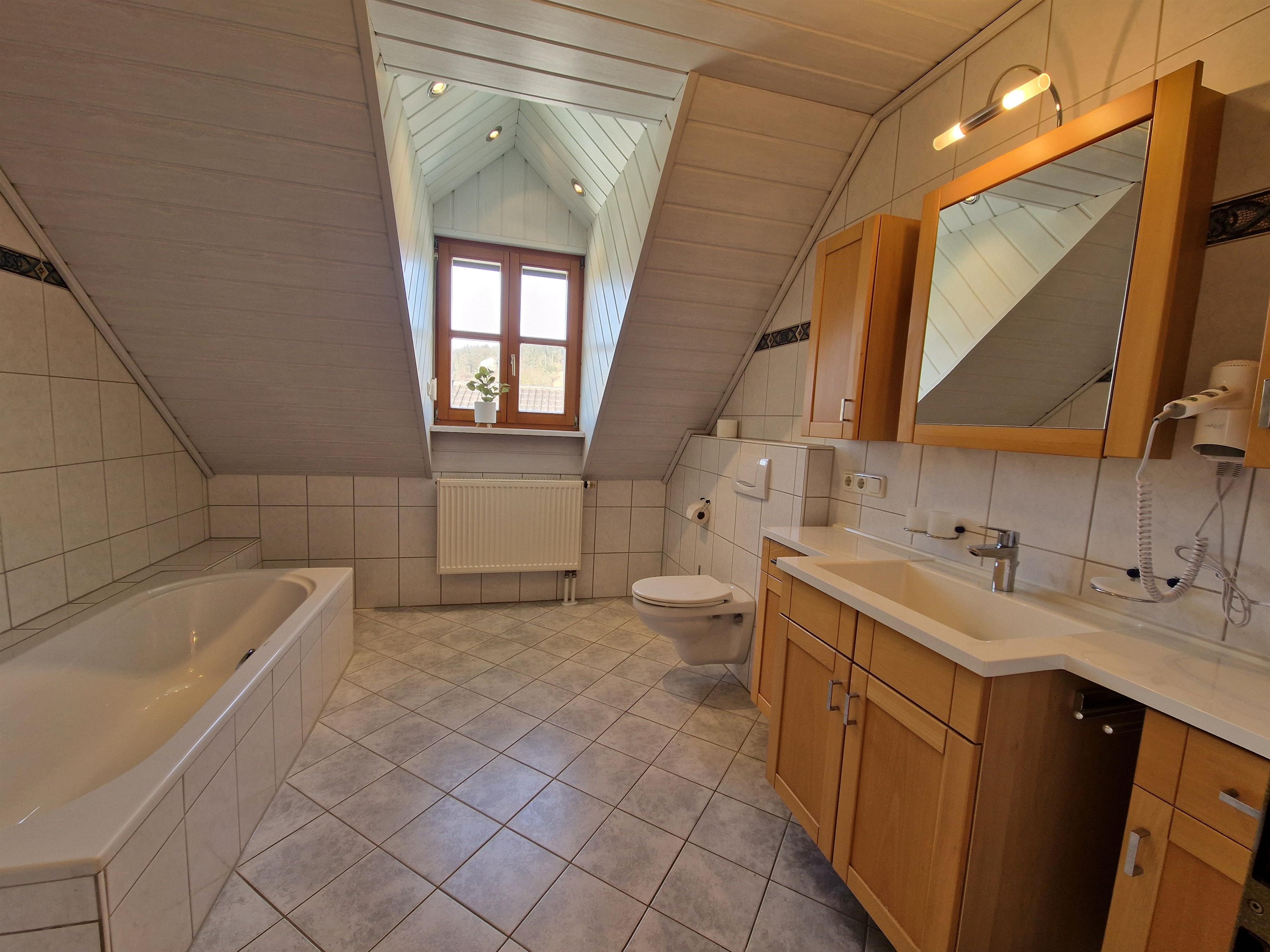 Unsere liebevoll eingerichtete Ferienwohnung mit Balkon bietet auf ca. 120m² Platz für bis zu sechs Personen und ist ideal für Familien, Paare oder Freunde, die zusammen reisen. Die Wohnung verfügt über ein Wohnzimmer mit einem bequemen Sofa, das zum Entspannen einlädt und einem Essbereich, der Platz für gemeinsame Mahlzeiten bietet. Flachbildfernseher und kostenloses WLAN sorgen für Unterhaltung und Konnektivität. Die voll ausgestattete Küche ermöglicht es Ihnen, Ihre Lieblingsgerichte auch im Urlaub zuzubereiten. Sie finden hier moderne Geräte wie einen Herd, einen Backofen, einen Kühlschrank, eine Mikrowelle und eine Kaffeemaschine. Geschirr, Besteck und Kochutensilien sind ebenfalls vorhanden. Die 3 Schlafzimmer sind jeweils mit einem komfortablen Doppelbett ausgestattet, das für erholsame Nächte sorgt. Die Betten der 2 Schlafzimmer im Obergeschoss können bei Bedarf getrennt werden. Ein weiteres Highlight sind die beiden modernen Badezimmer mit Dusche, WC und Föhn. Handtücher und Bettwäsche sind im Preis inbegriffen.